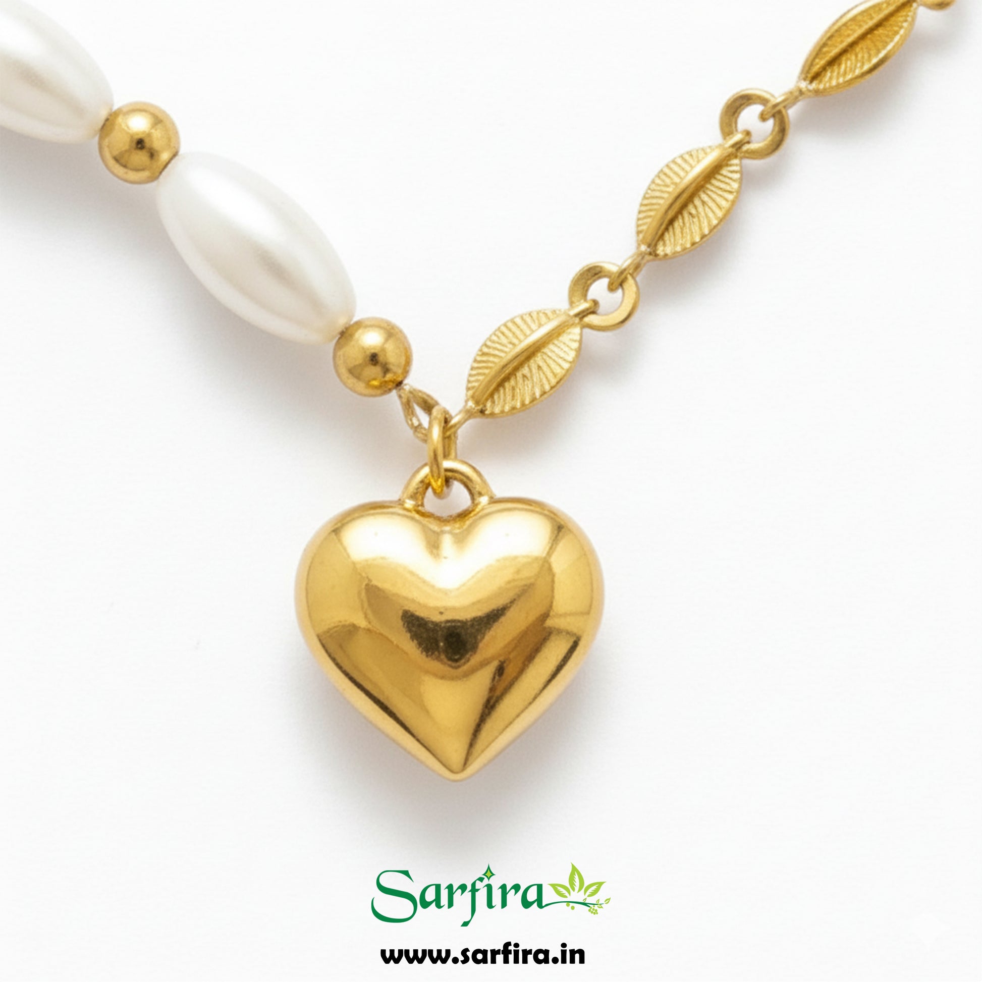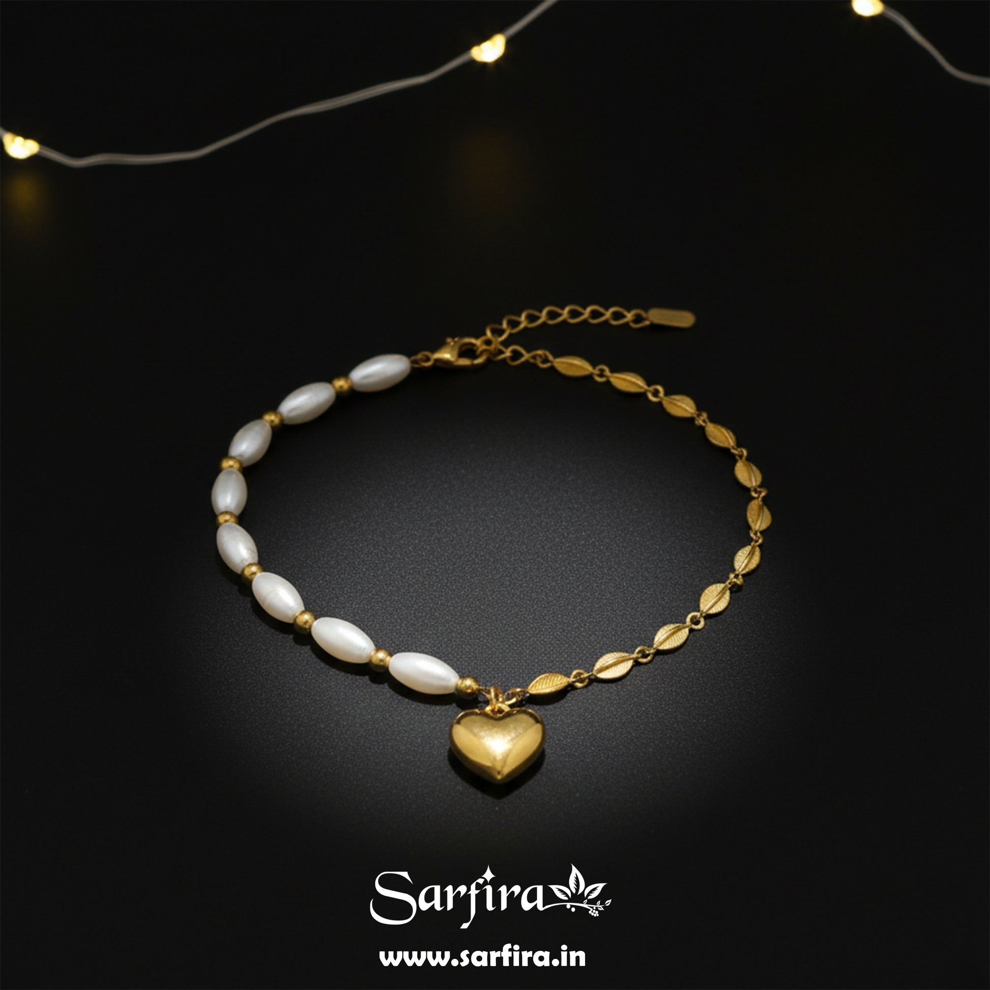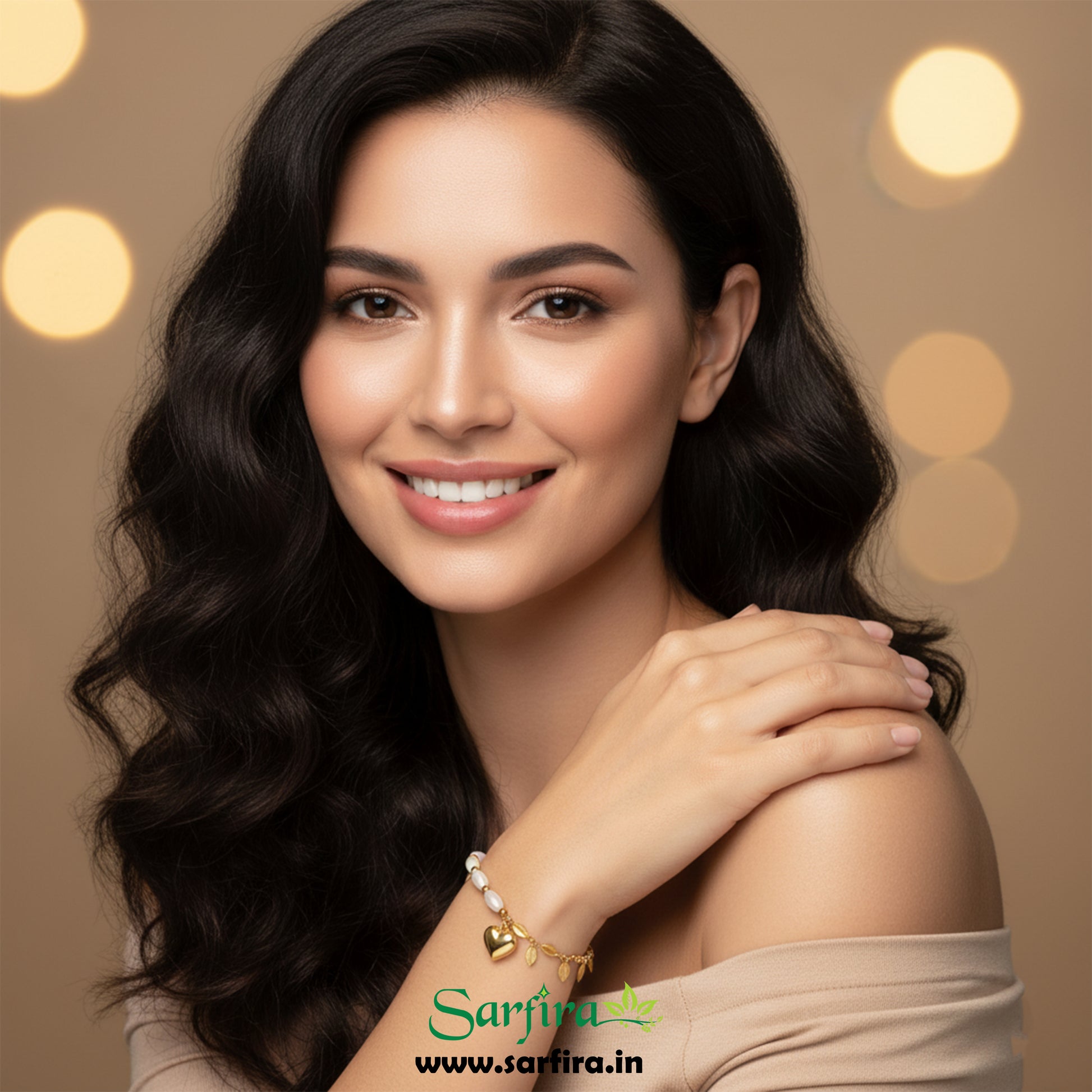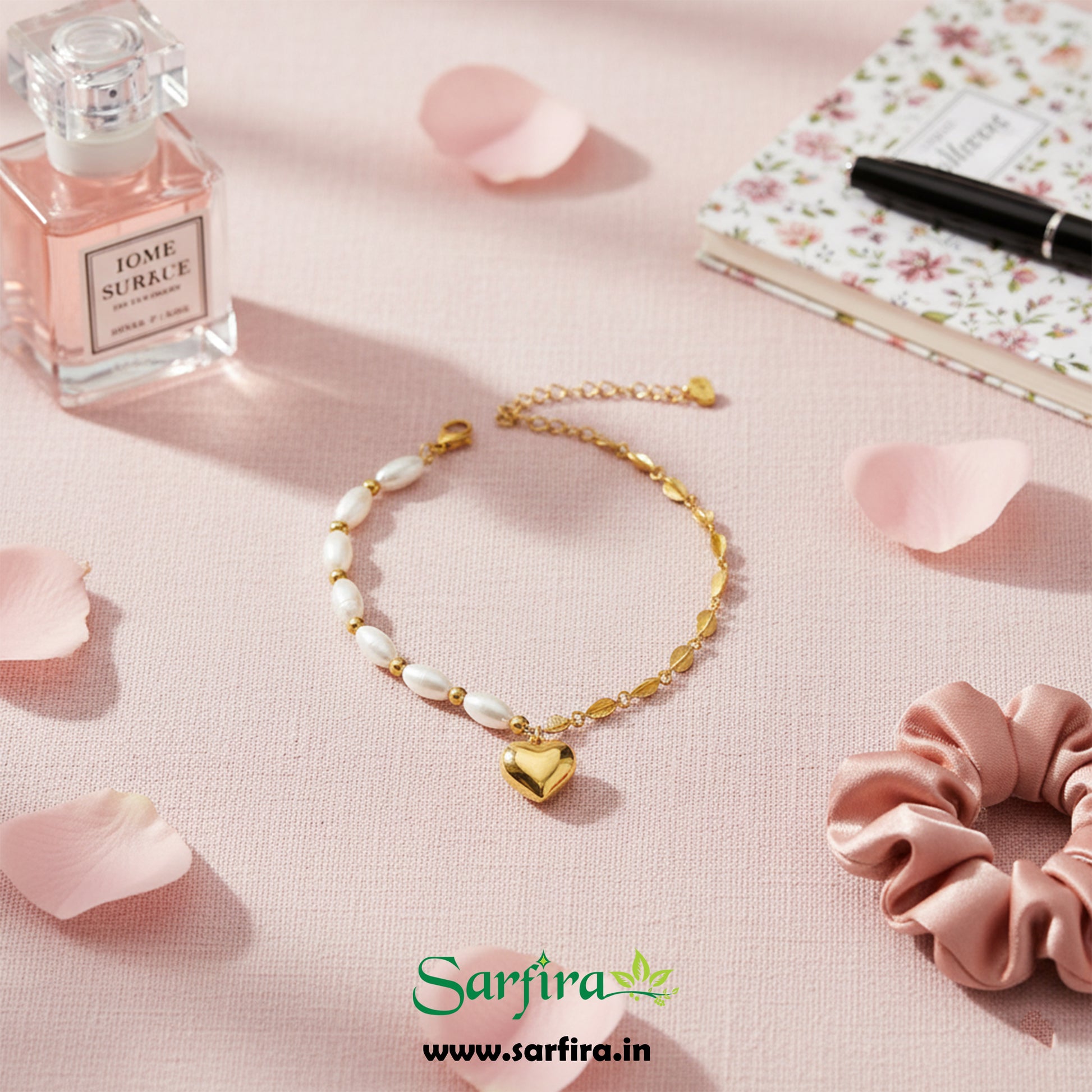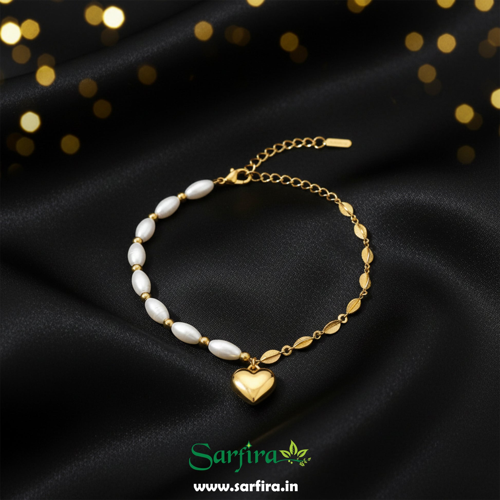 The unique split design and heart charm make this bracelet a prominent piece. Wear it solo to let the contrasting textures (smooth pearl and flat metal leaves) stand out. The combination of gold and white pearl provides a classic yet distinctive feminine look.