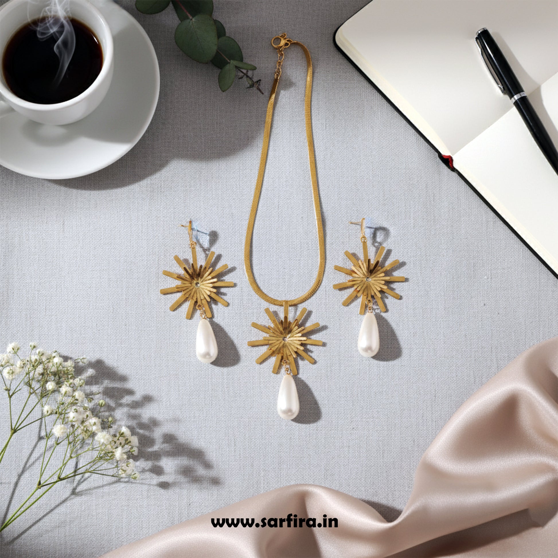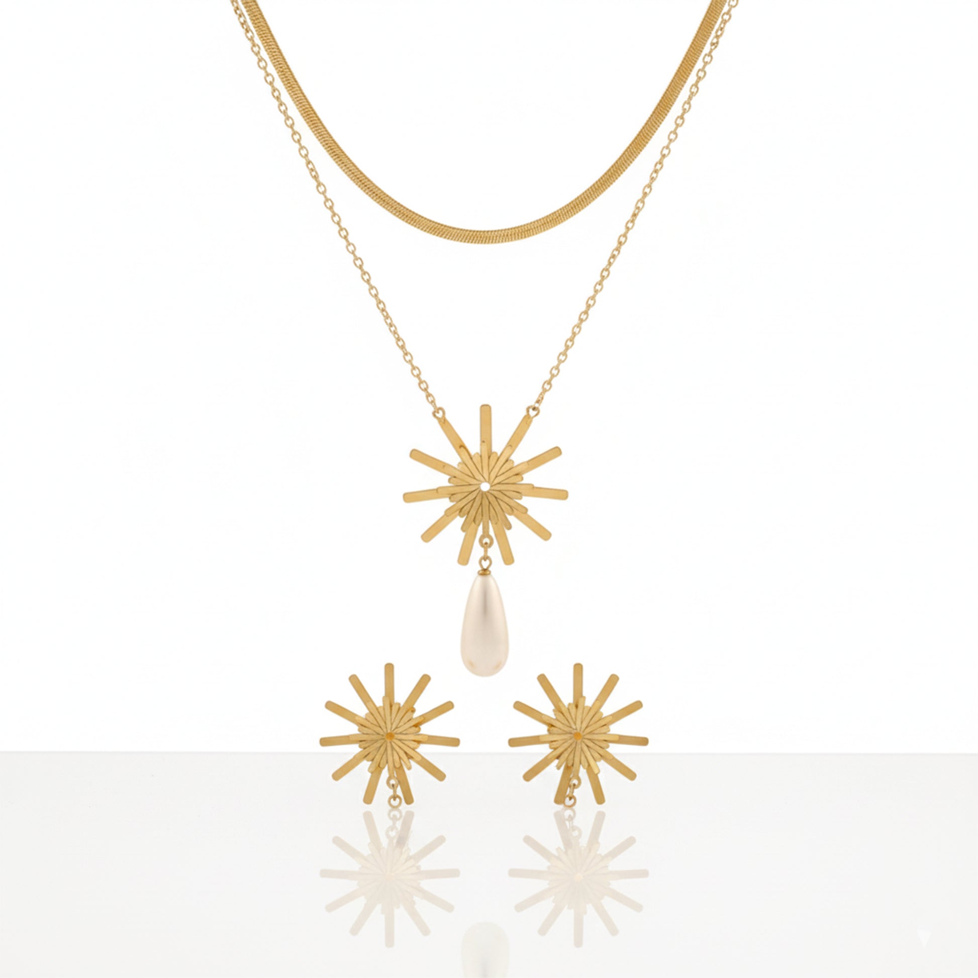 Anti-Tarnish Gold Starburst Pendant & Pearl Drop Set