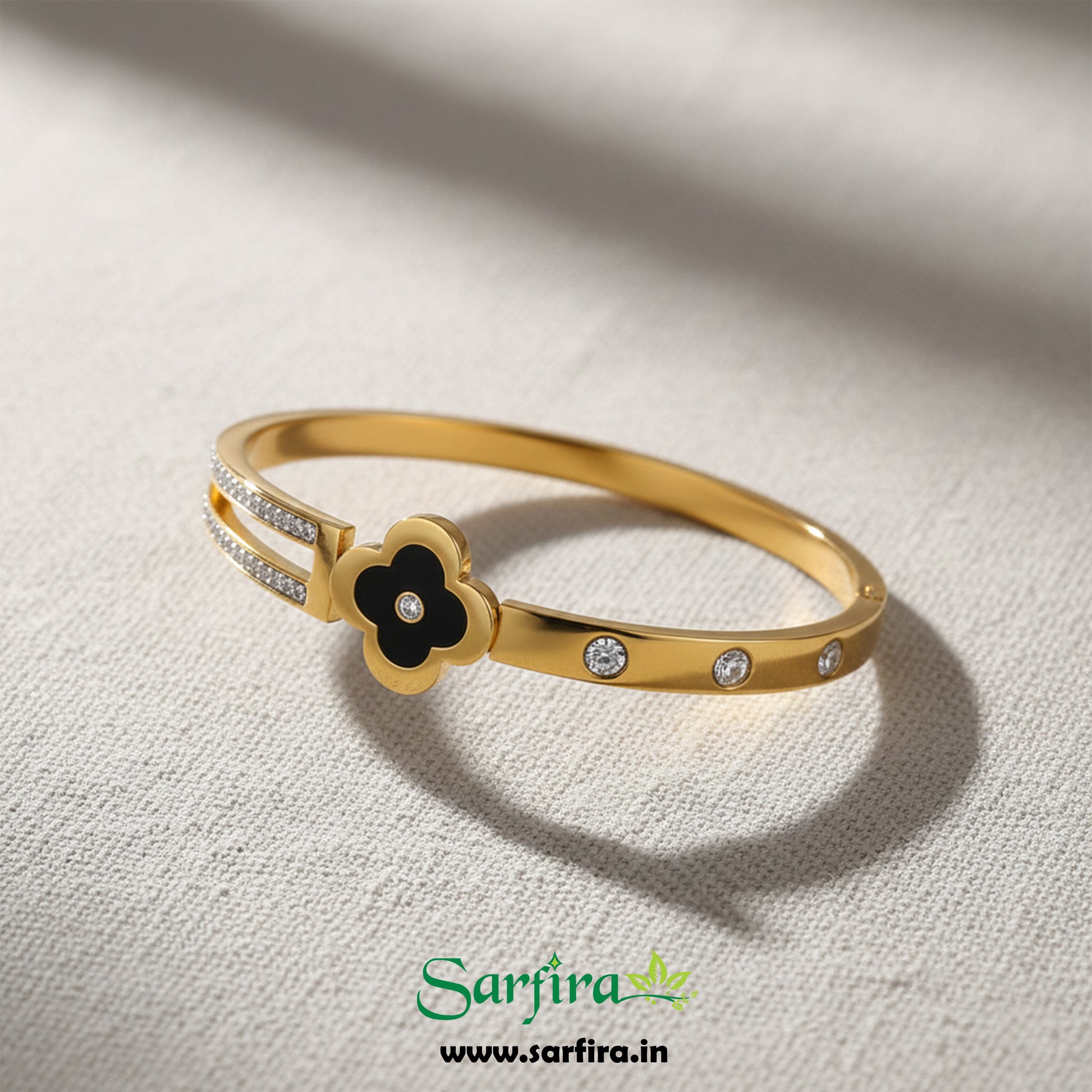 The combination of the black flower and the split, CZ-studded band makes this a modern and striking accessory. Wear it alone to show off the geometric contrast and the sparkle. This Kada is good for adding an elegant, bold accent to your daily or evening attire.