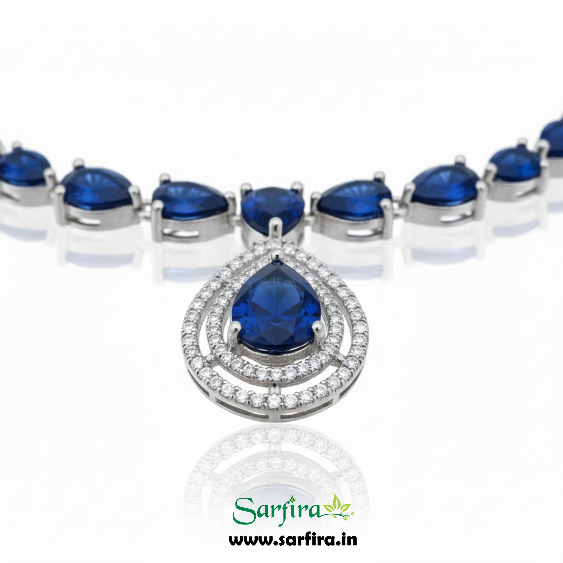 This is a matching jewelry set that includes one statement necklace and a pair of drop earrings. The set features bright blue simulated gemstones and clear American Diamond (CZ) stones. The necklace is made of many linked blue tear-drop stones that form a graduating chain, leading to a large blue tear-drop pendant framed by smaller AD stones. The earrings feature matching linked blue tear-drop stones.