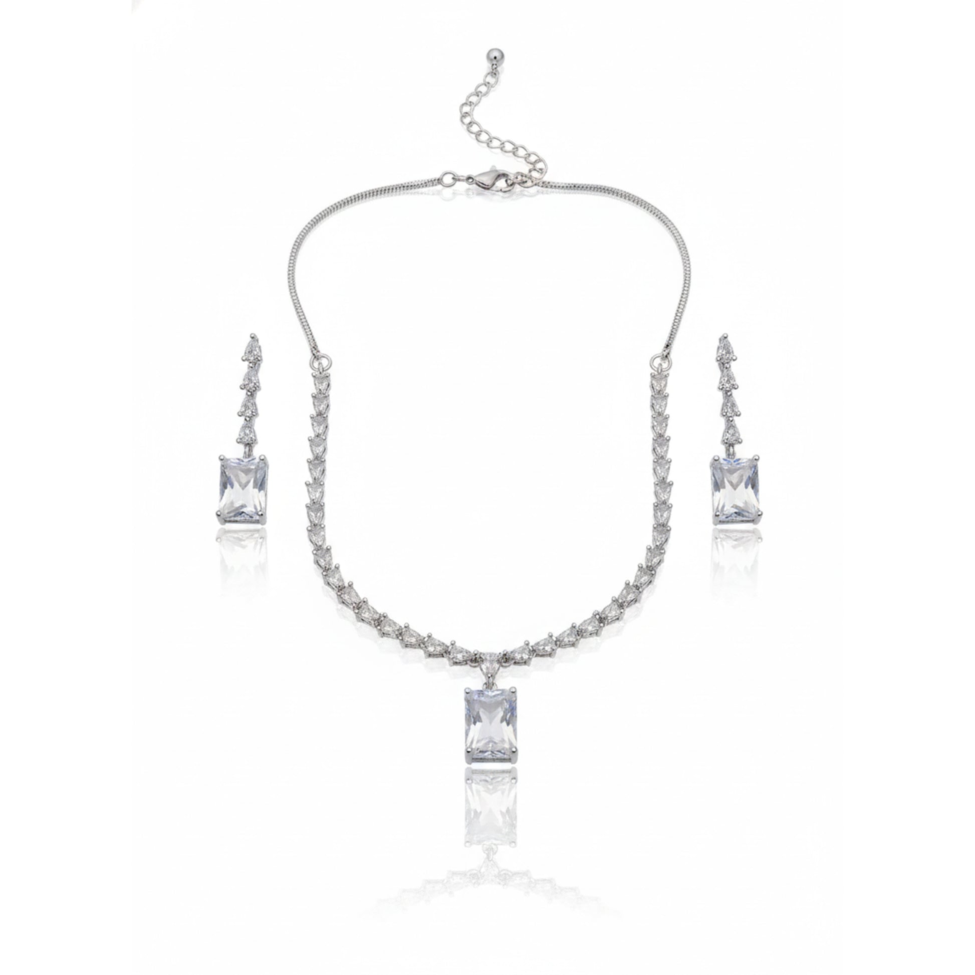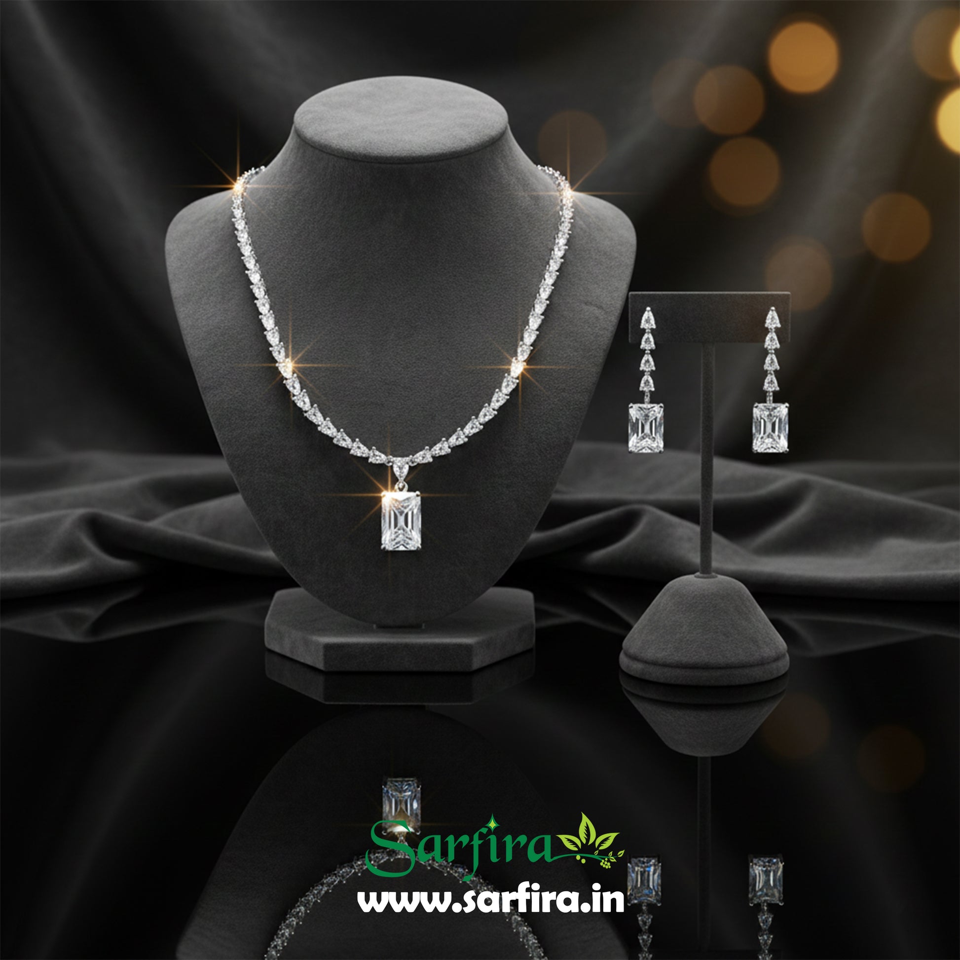 This is a matching jewellery set that includes one necklace and a pair of long drop earrings. The set features brilliant clear American Diamond (CZ) stones. The necklace chain is made of small, linked triangular/tear-drop AD stones. The centerpiece is a large rectangular (Emerald cut) AD pendant. The long earrings feature a vertical line of rectangular AD stones.