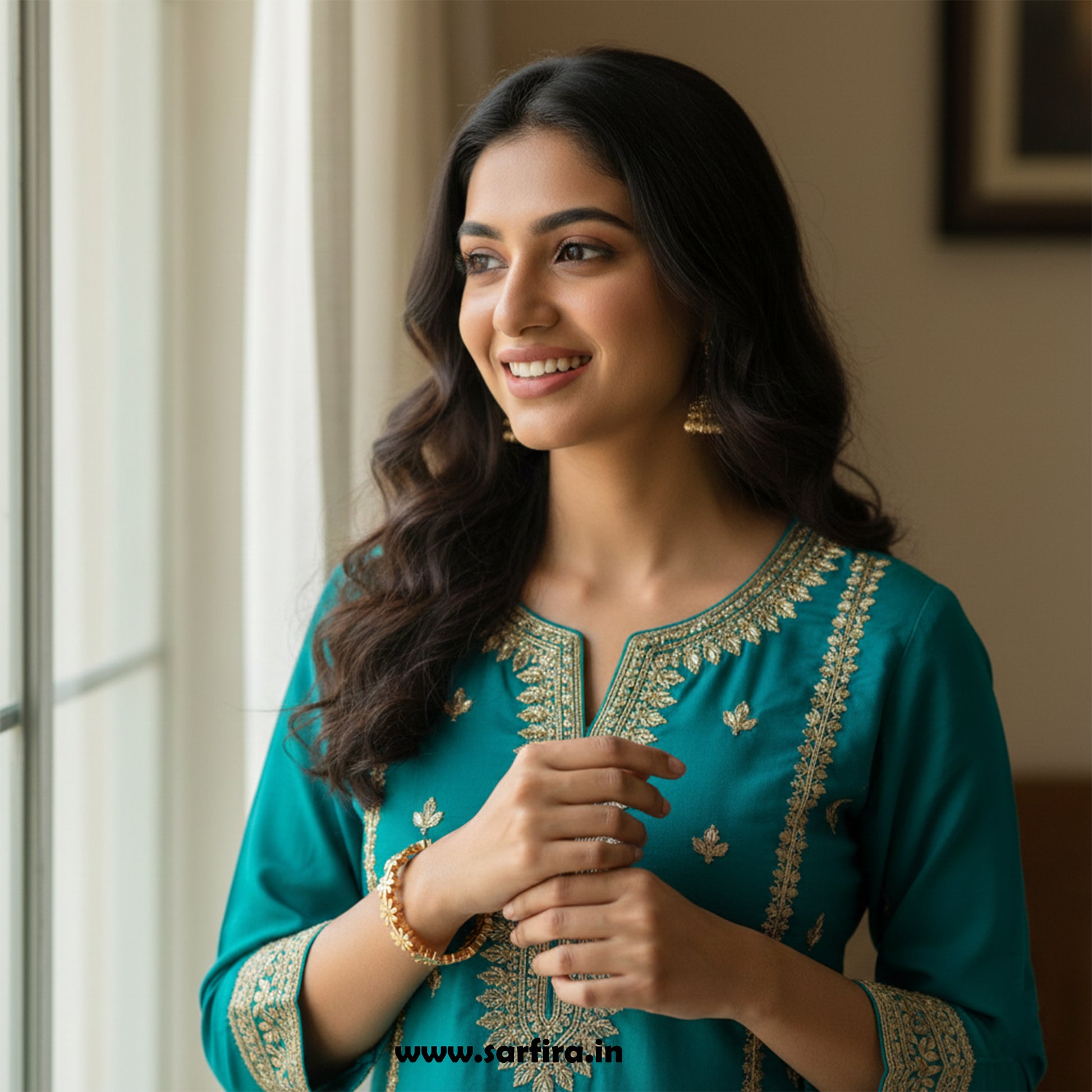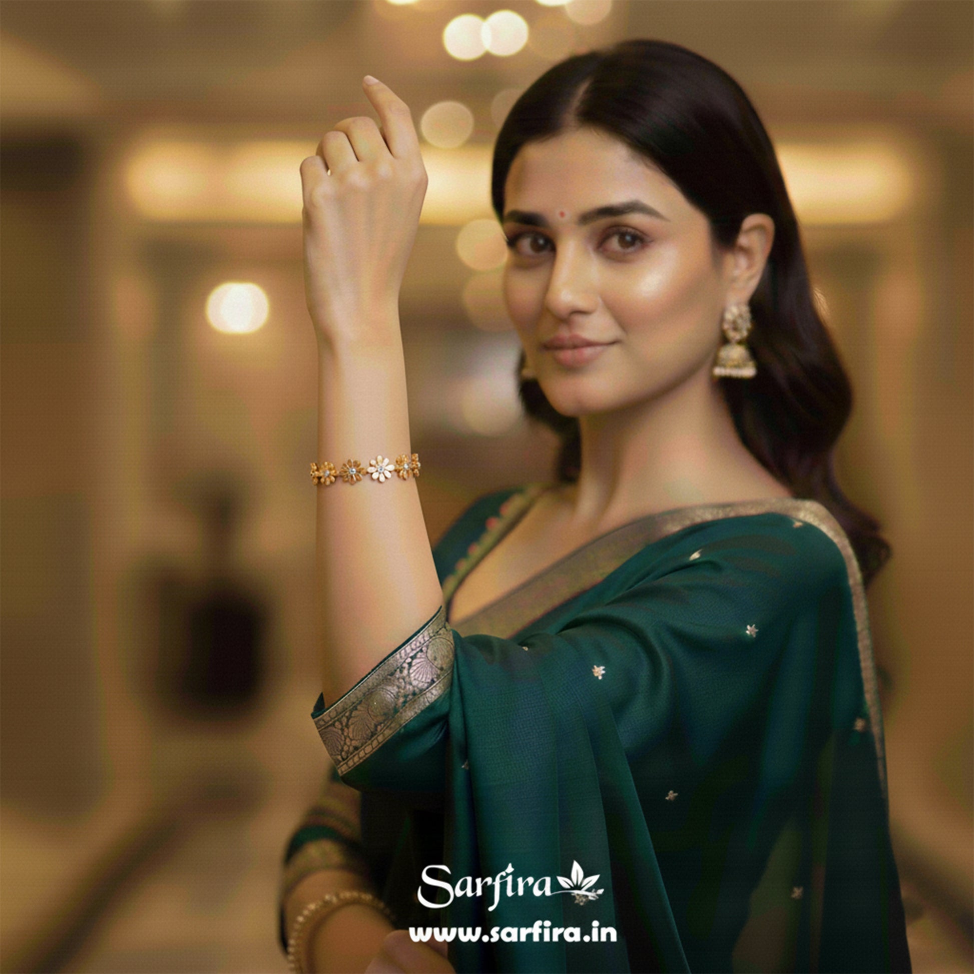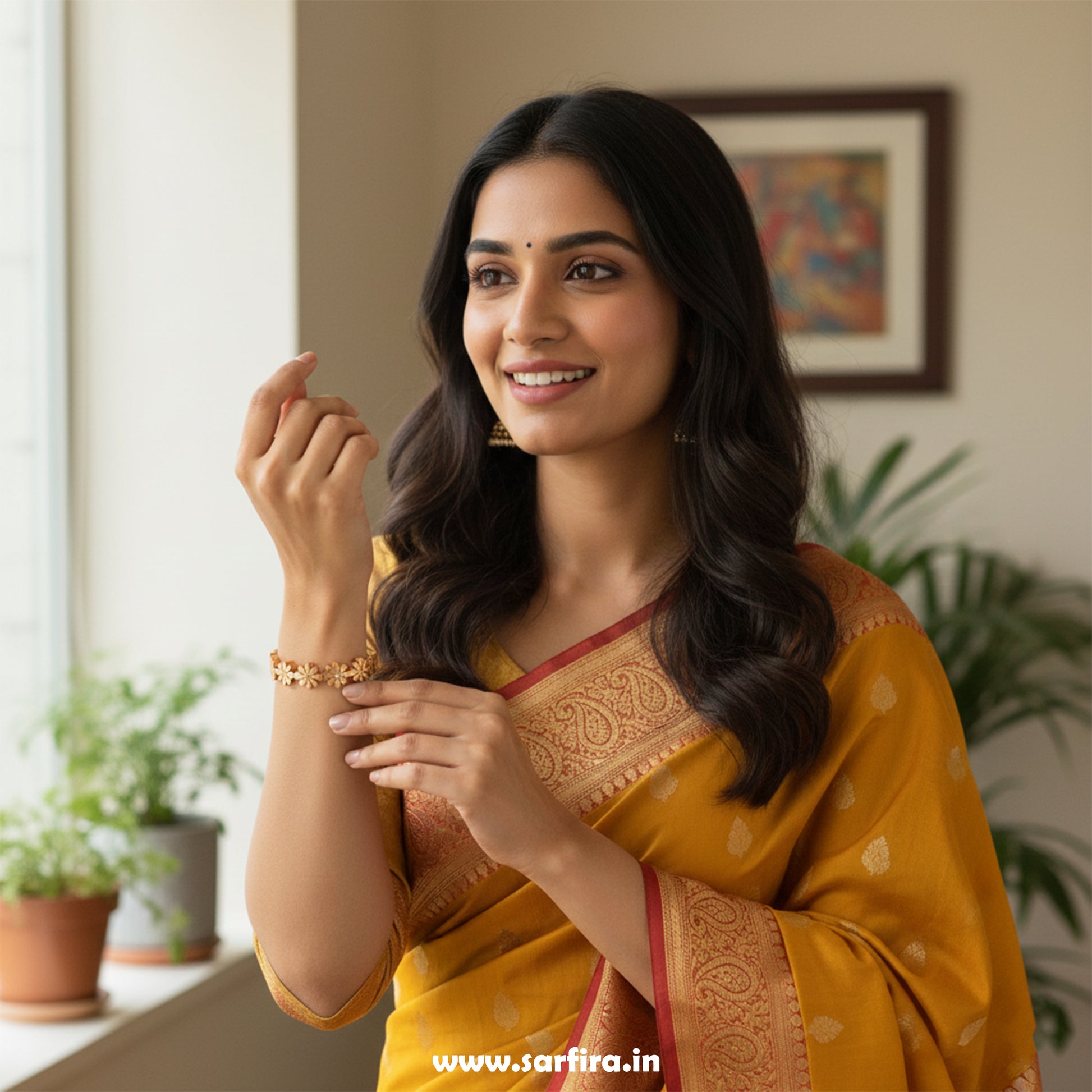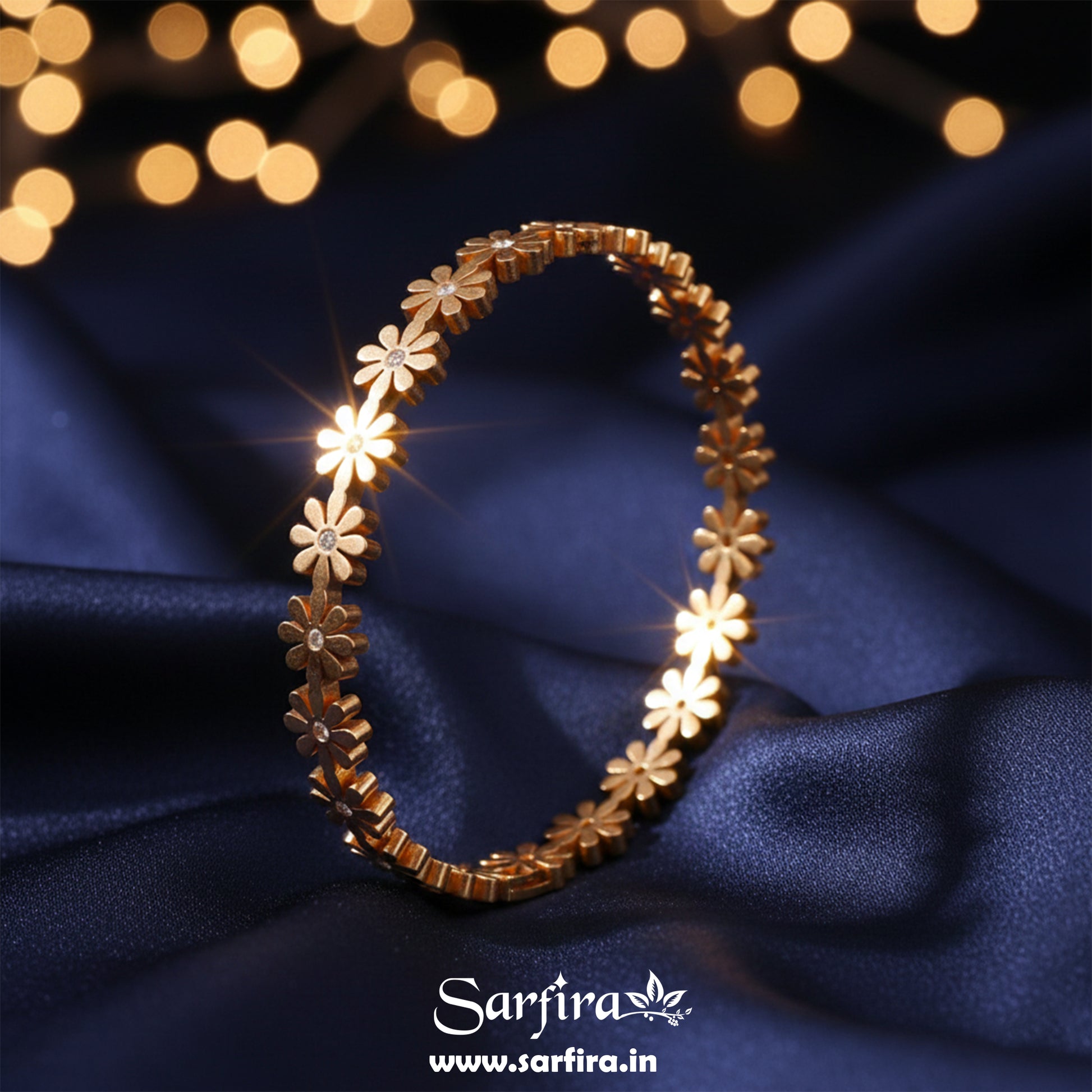 The continuous flower pattern makes this a feminine and distinctive piece. Wear it alone to highlight the detailed floral design and the subtle sparkle from the CZ stones. This Kada is perfect for adding a touch of natural elegance to spring or summer outfits.