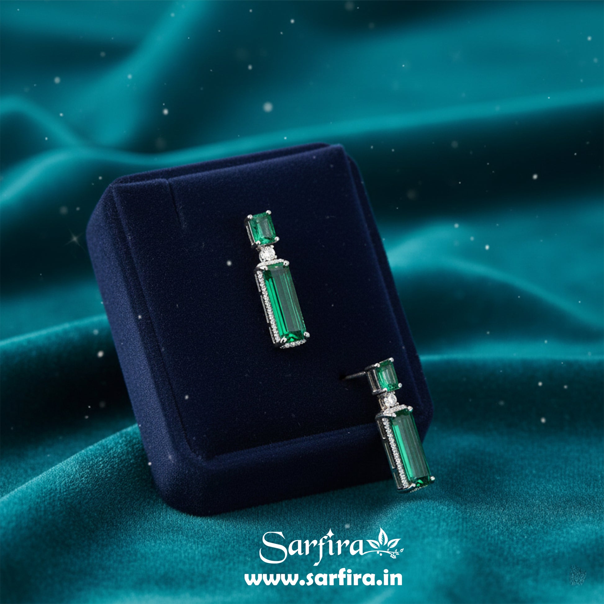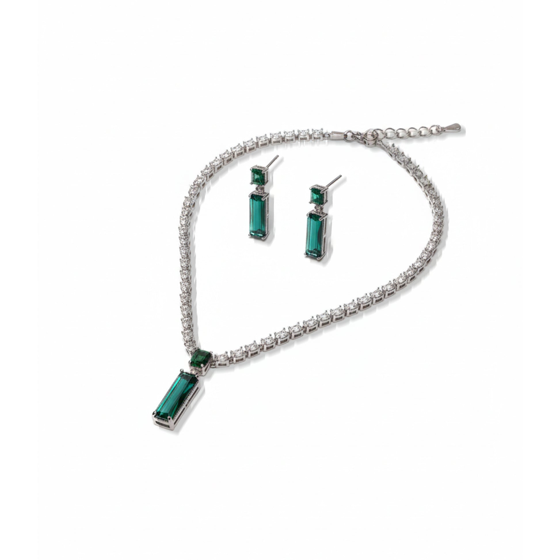 This is a matching jewellery set that includes one statement necklace and a pair of drop earrings. The set features bright green simulated gemstones in both tear-drop and rectangular shapes, accented by clear American Diamond (CZ) stones. The necklace forms a linked chain that creates a V-shape in the front, with a large green tear-drop pendant. The earrings feature a matching green rectangular top stone and a tear-drop drop.