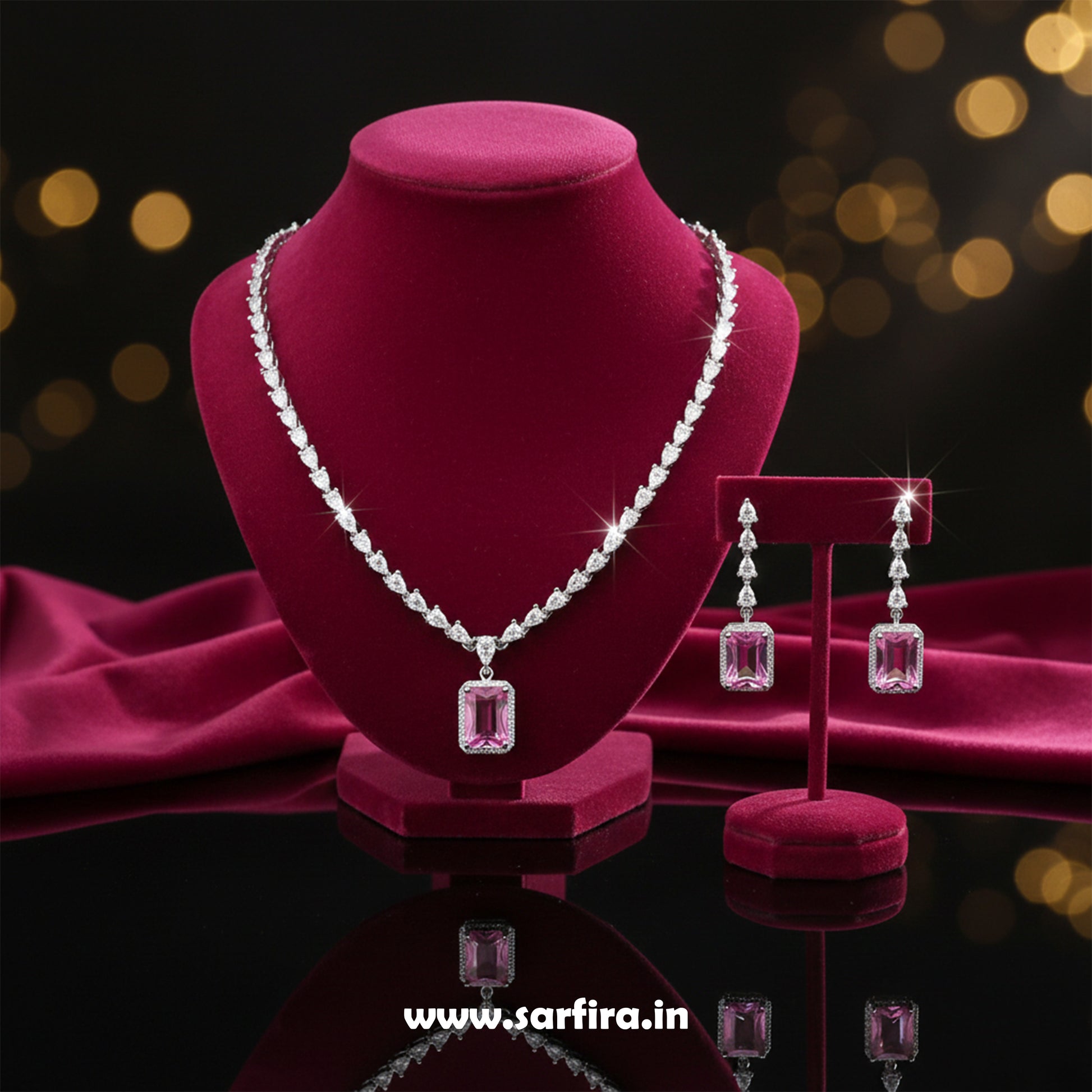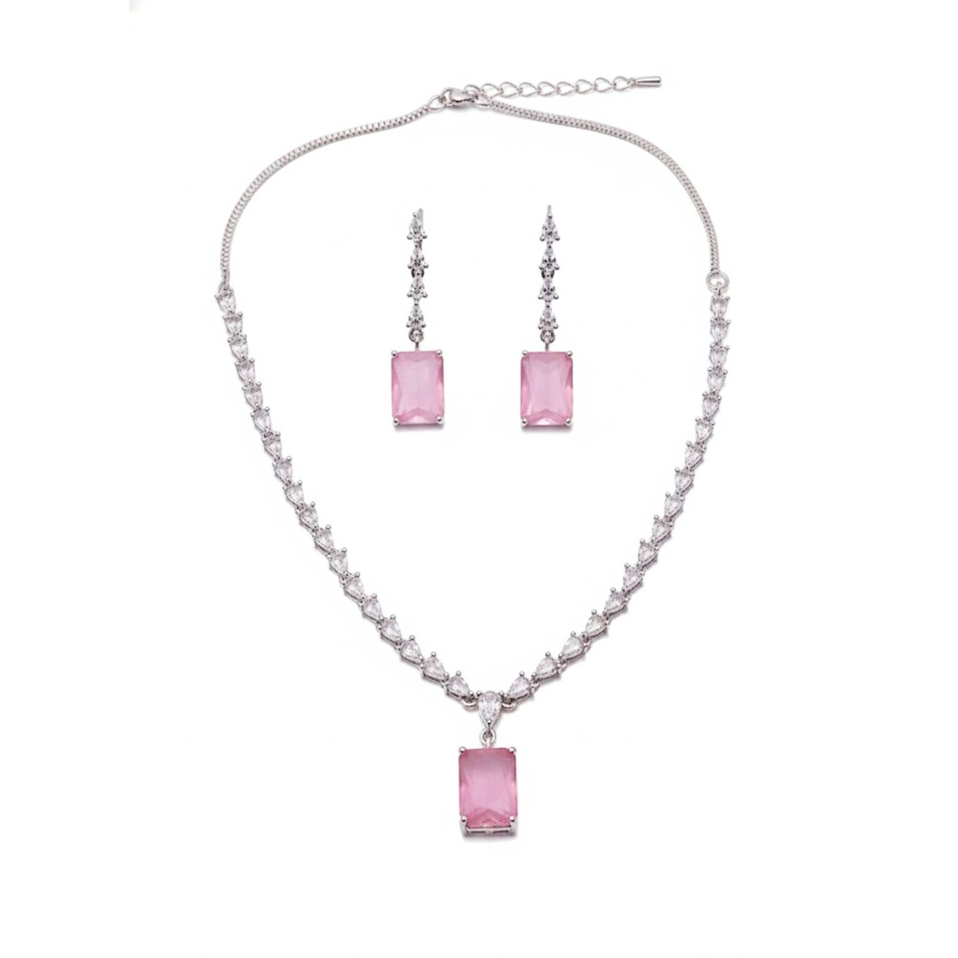 This is a matching jewelry set that includes one statement necklace and a pair of drop earrings. The set features elegant, light pink simulated gemstones in tear-drop shapes and sparkling clear American Diamond (CZ) stones. The pink stones graduate in size along the chain, leading to a large tear-drop pink pendant framed by a halo of AD stones. The earrings feature matching triple tear-drop drops.