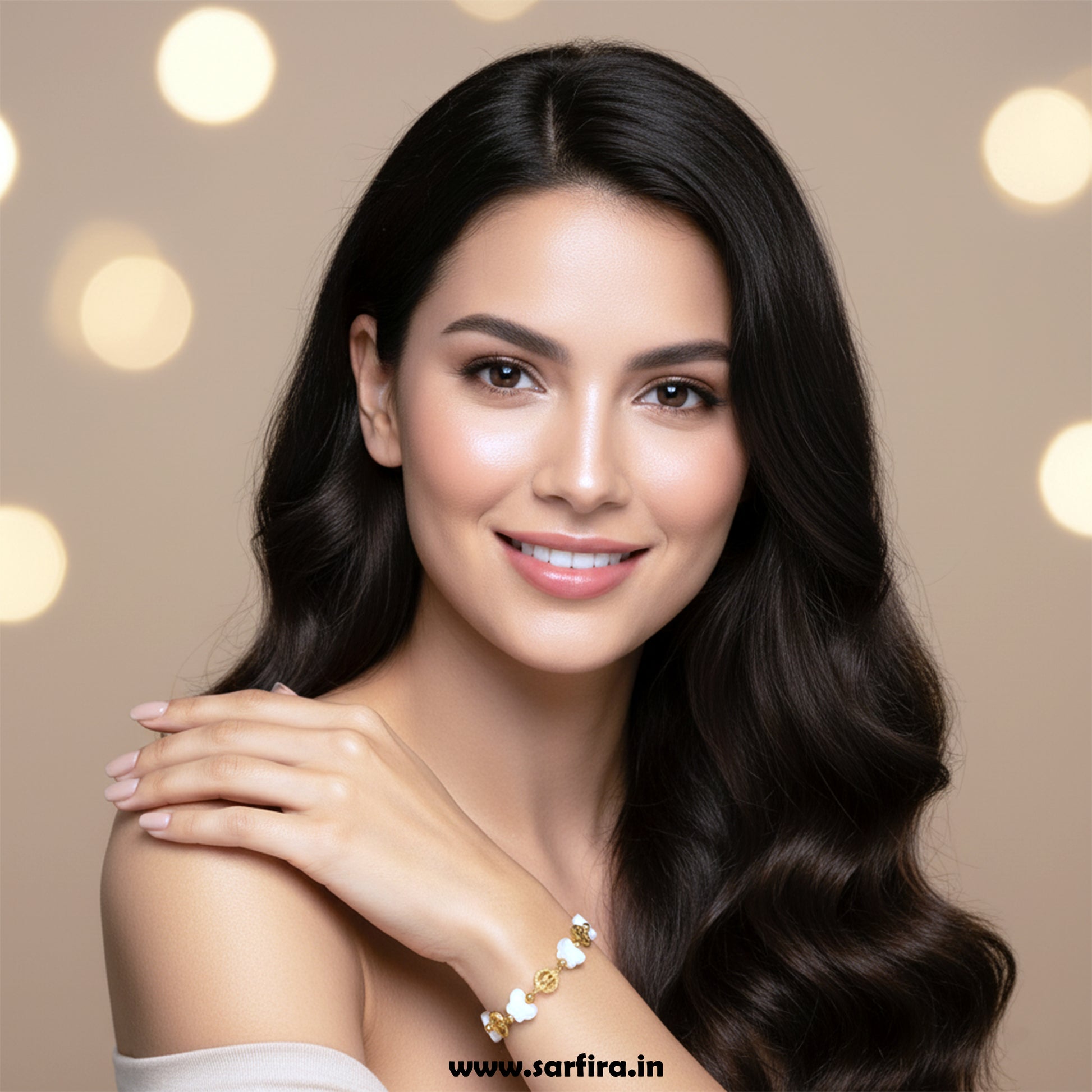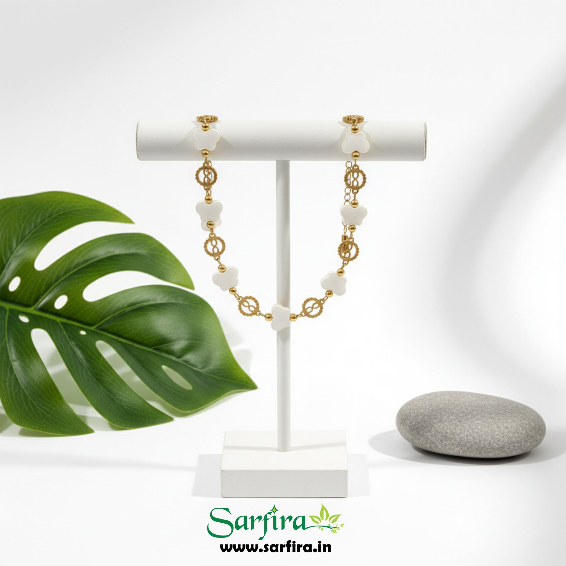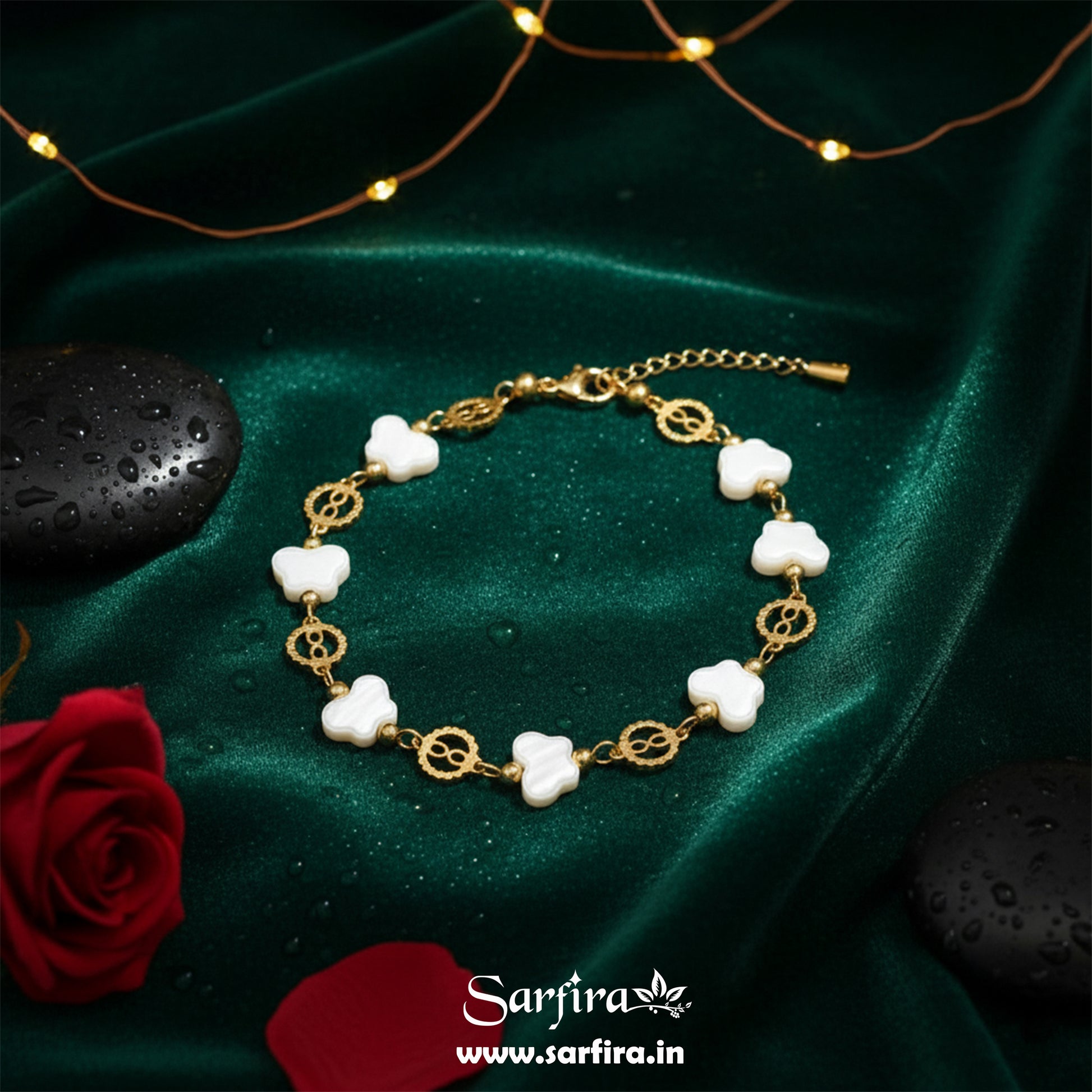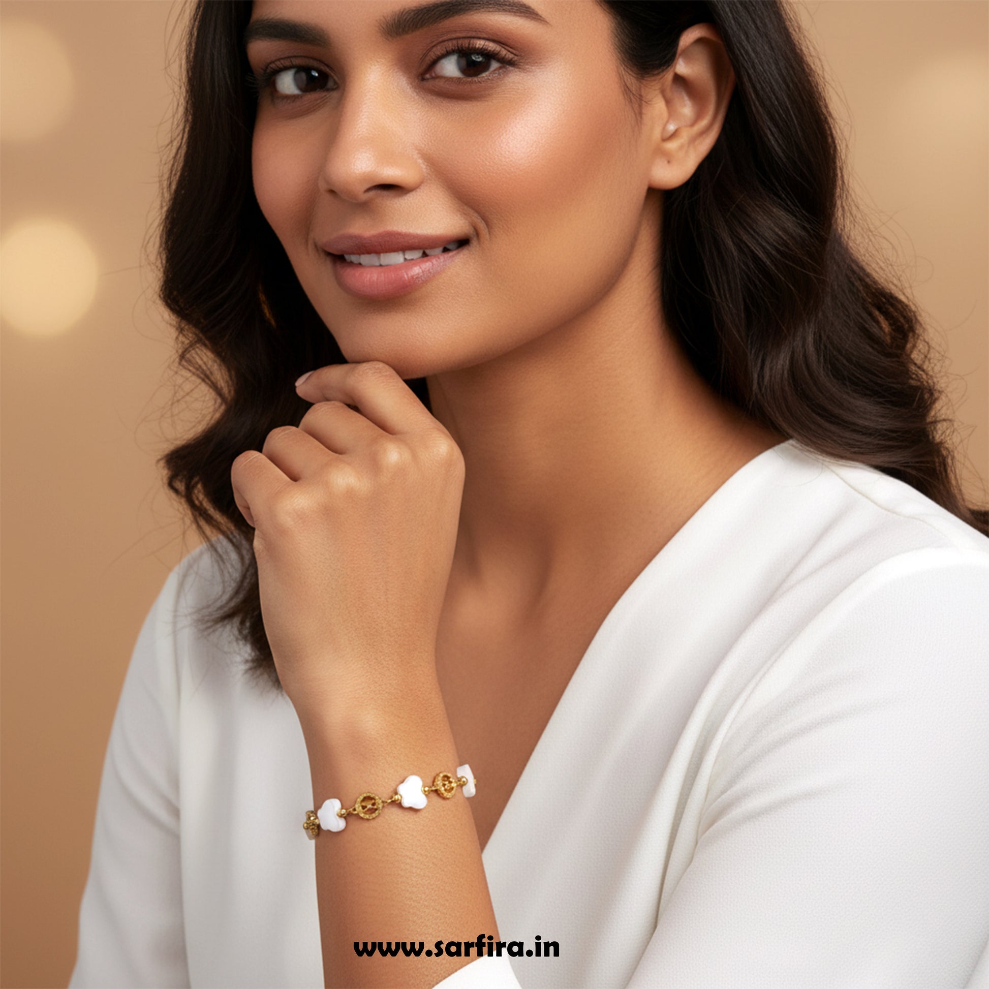 The bracelet's link design and contrasting white MOP and gold links create a decorative chain. Wear it as a comfortable, everyday wrist accent. The alternating patterns are highly visible and make it suitable for pairing with simple gold jewellery or a plain watch.