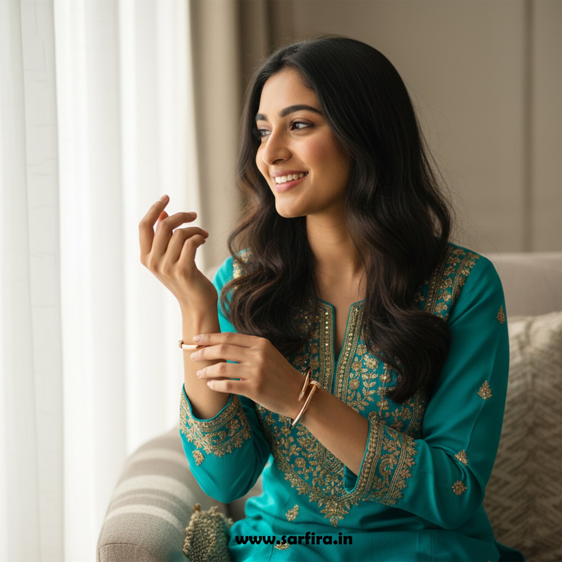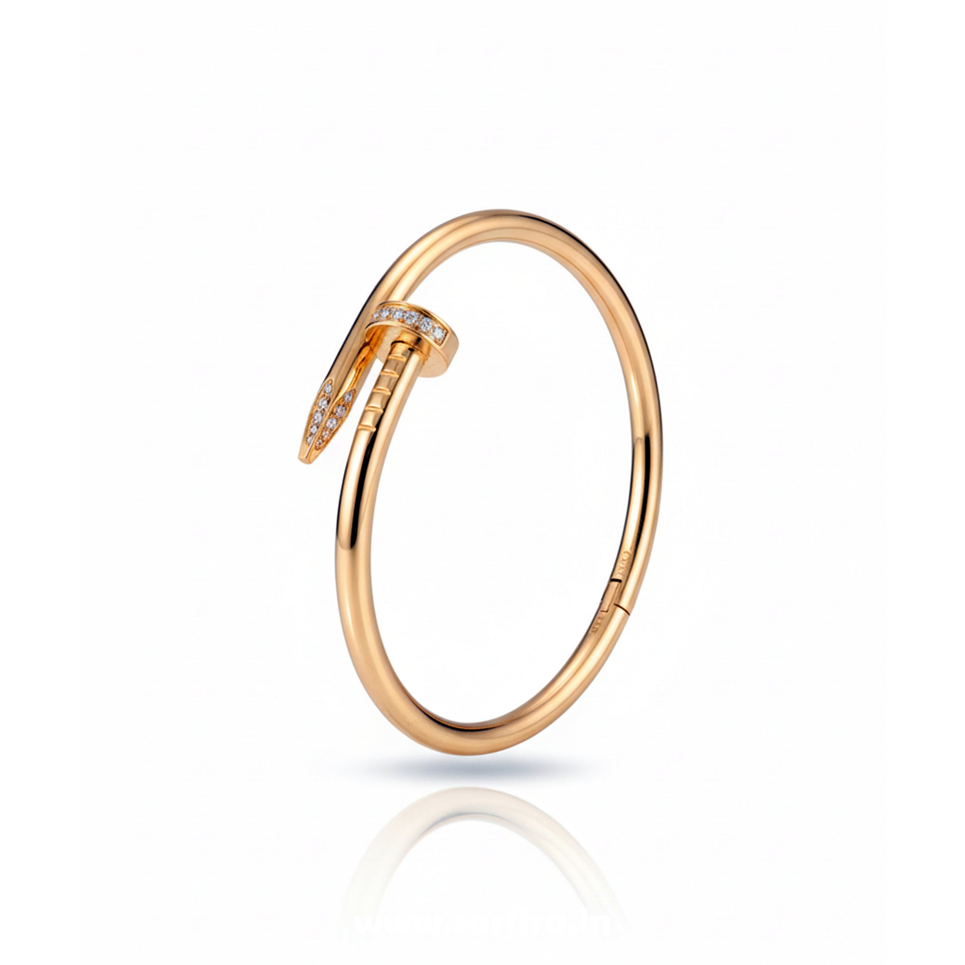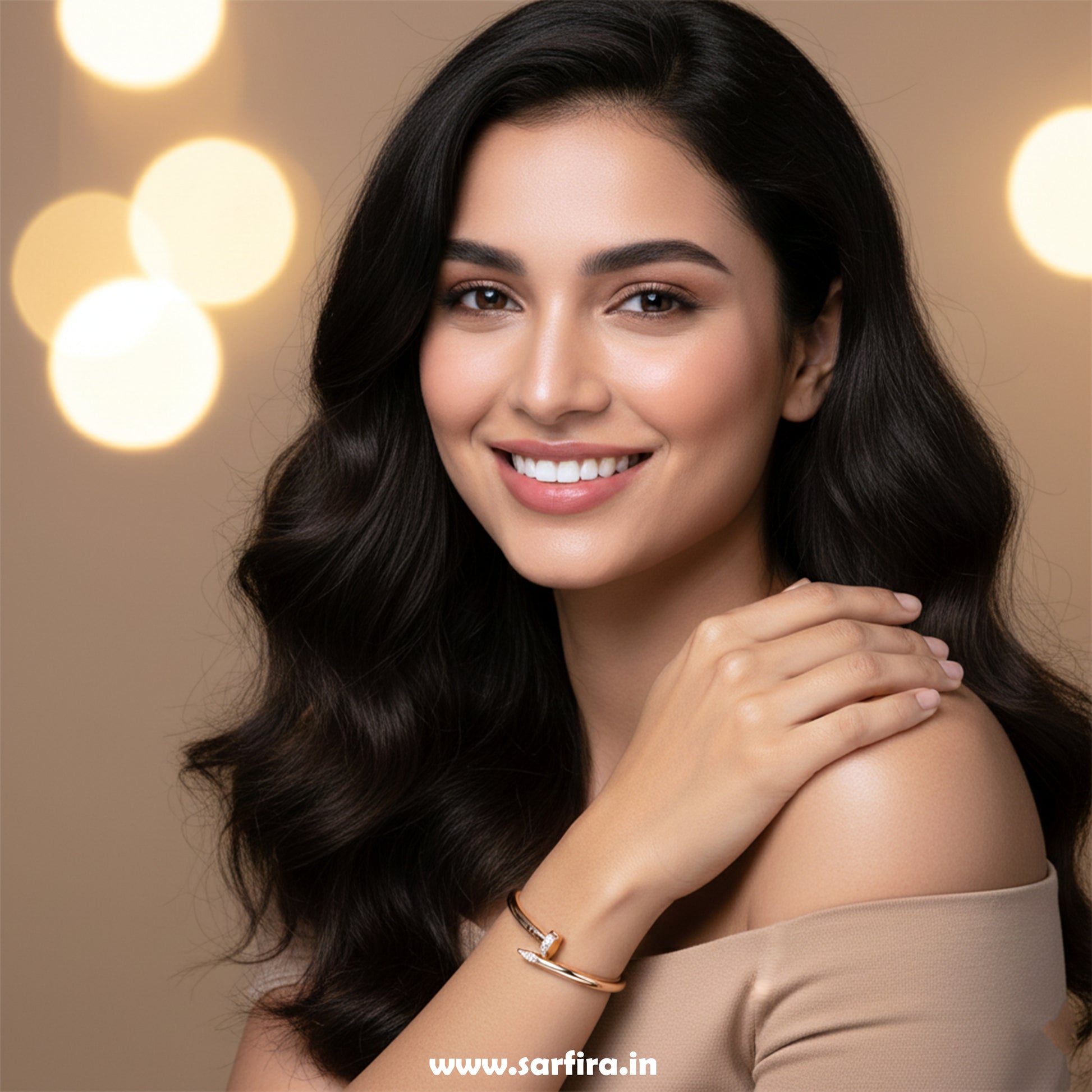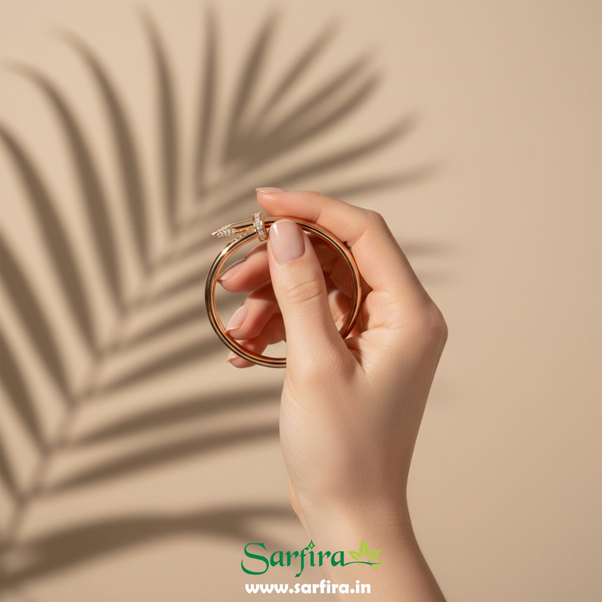 The bangle's unique shape makes it a highly noticeable accessory. Wear it alone to highlight the artistic nail design and the subtle sparkle from the CZ stones. The warm rose gold color pairs well with other pink-toned metals or can be mixed with plain gold or silver jewelry.