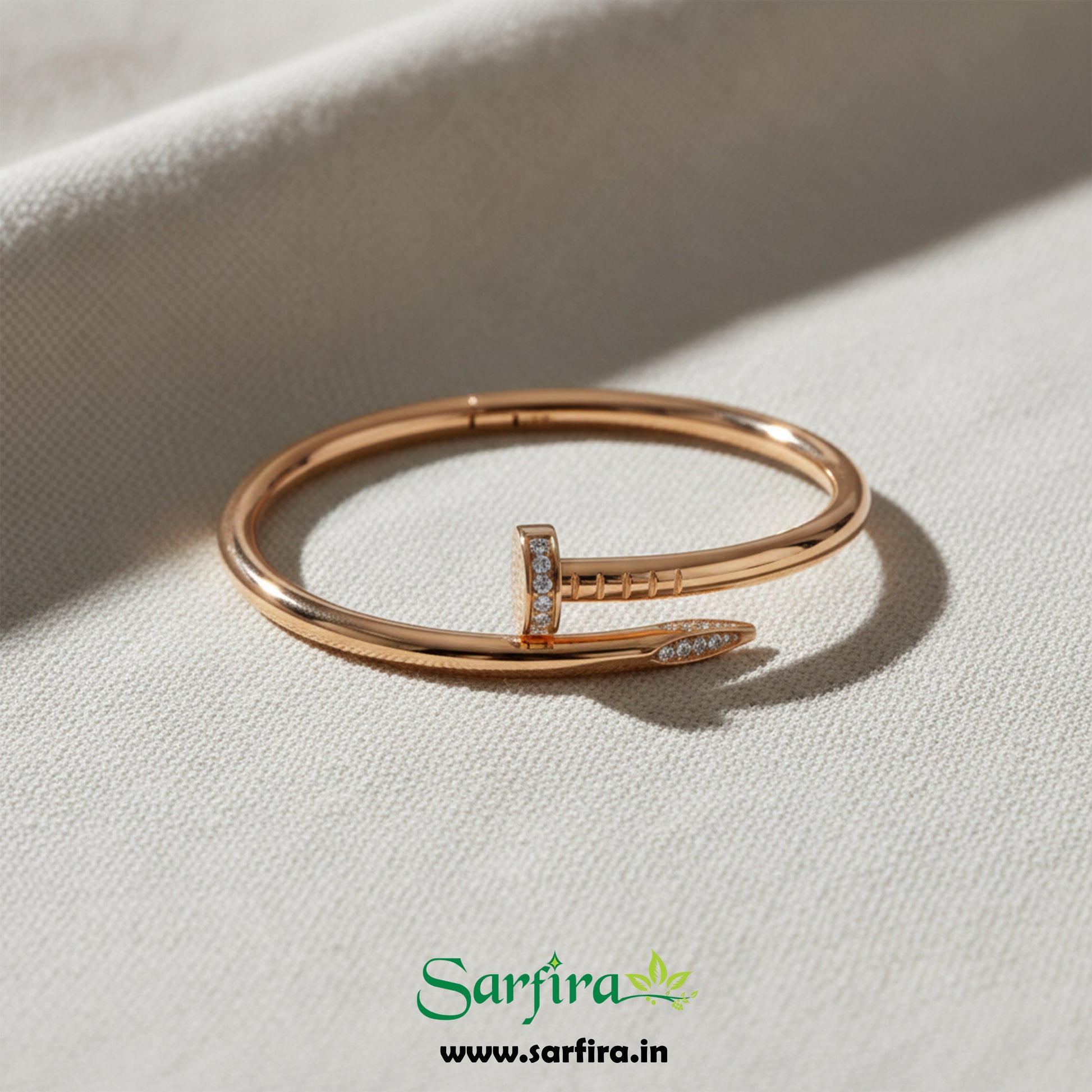 This is a round bangle (Kada) designed to look like a bent construction nail. The surface of the Kada is decorated with small, clear CZ stones set along the head and tip of the nail design. The rest of the band is smooth and polished.