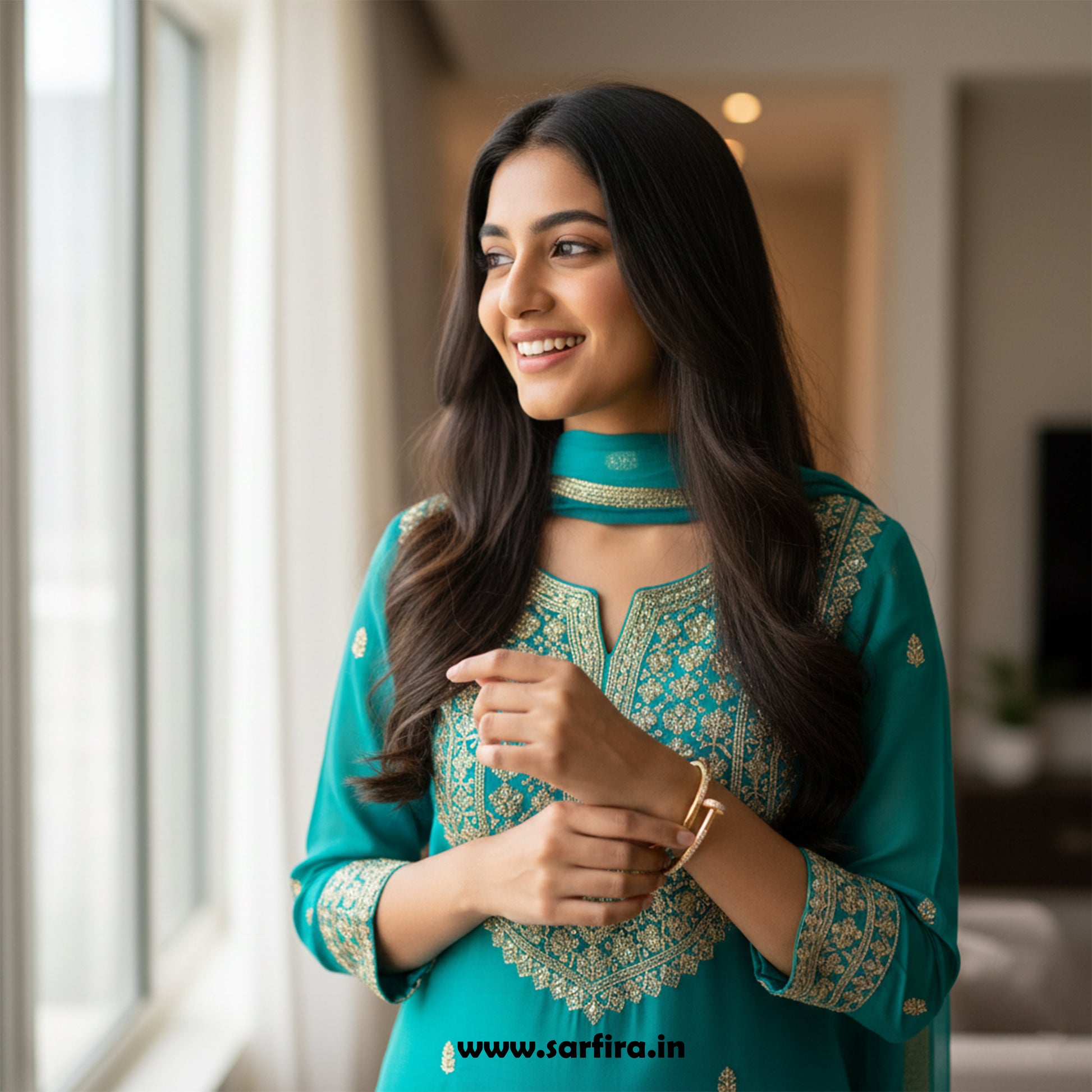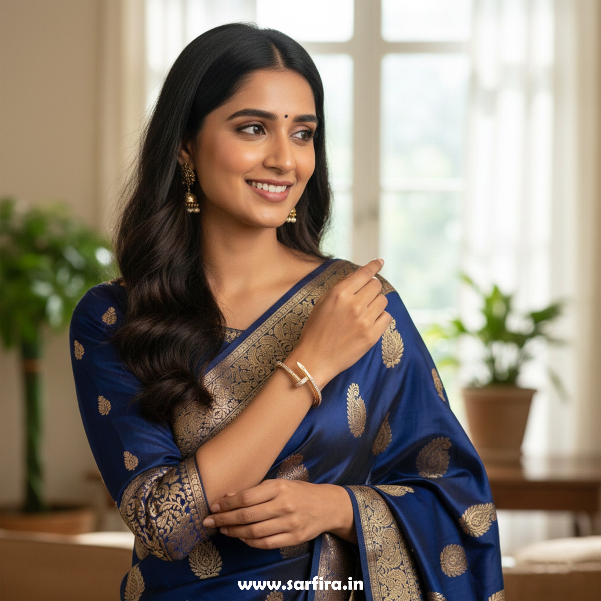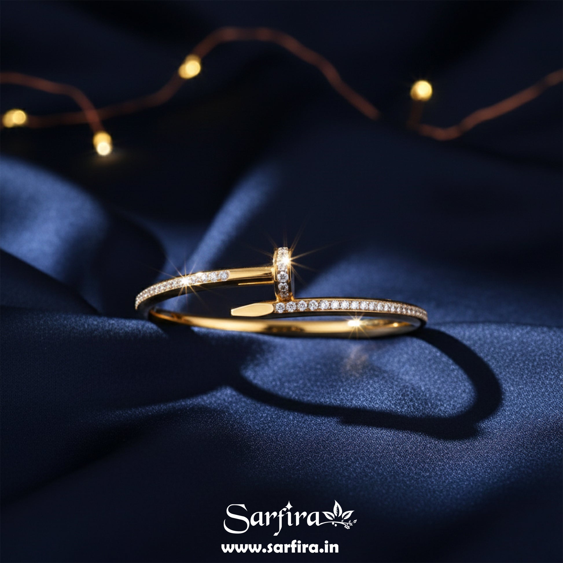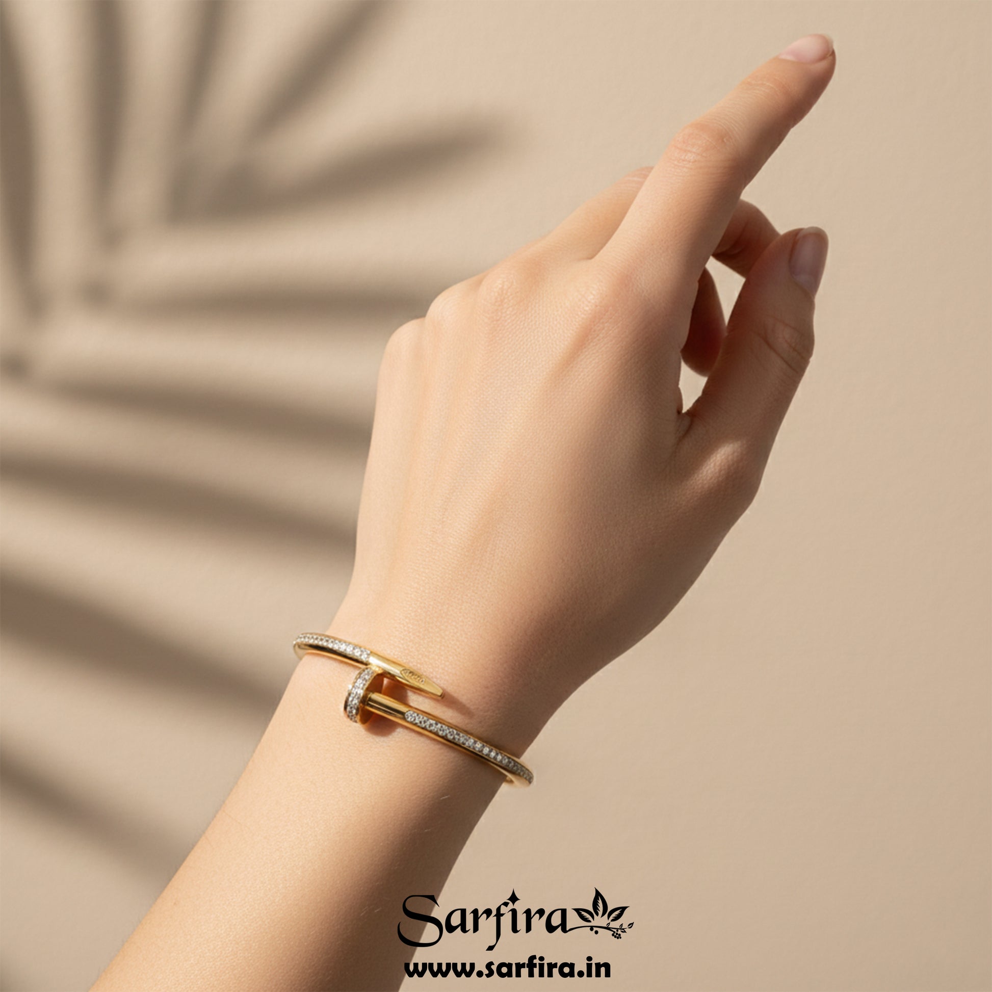 The bangle's unique shape makes it a highly noticeable accessory. Wear it alone to highlight the artistic nail design and the continuous sparkle from the CZ stones. The bold gold color and structured shape are perfect for adding a statement to any outfit.
