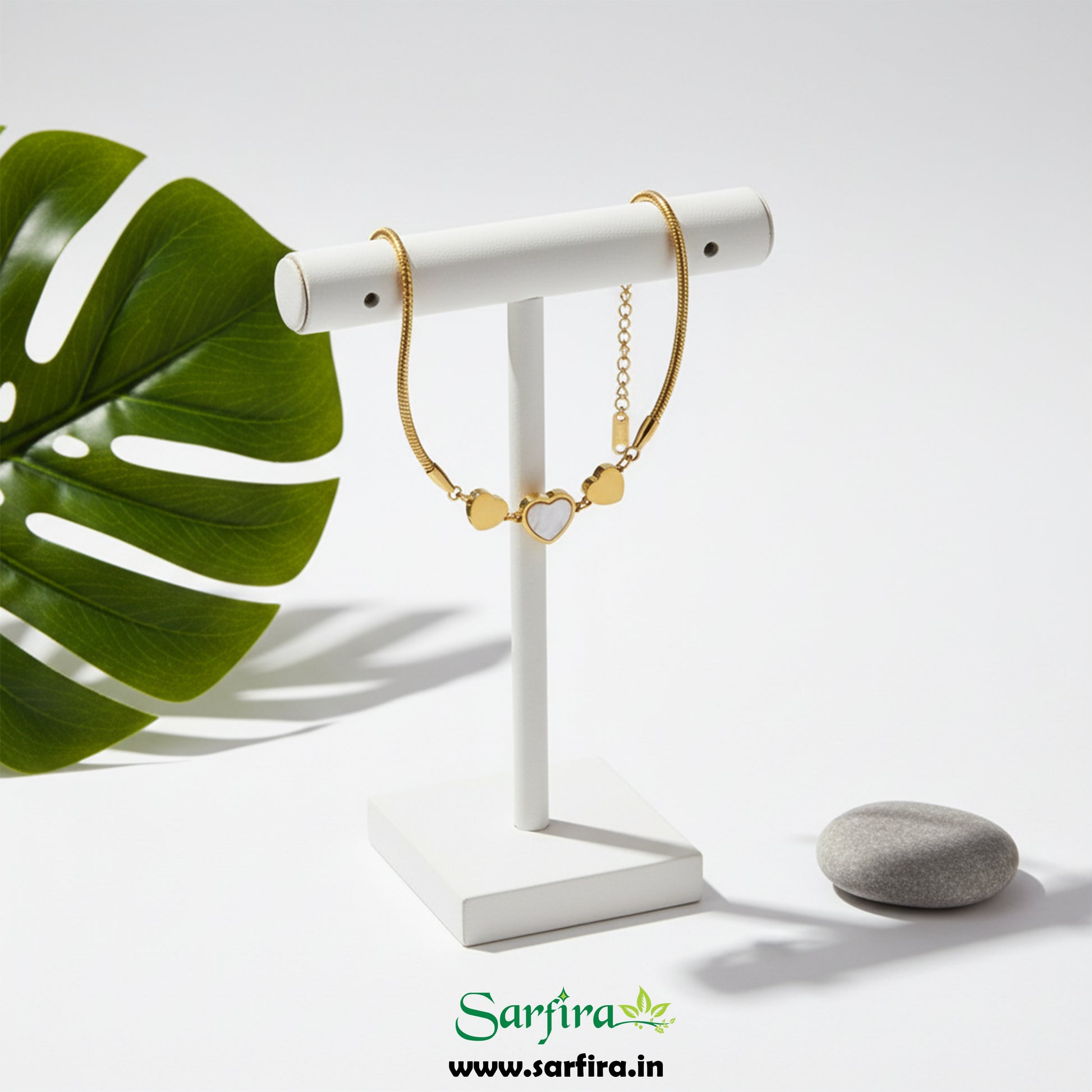 The smooth, round snake chain offers a comfortable base, and the heart centerpiece provides a clear focal point. Wear it as a comfortable, everyday wrist accent. The contrasting white MOP inlay and polished gold are suitable for layering with other simple chains or can be worn alone for a clean, feminine look.