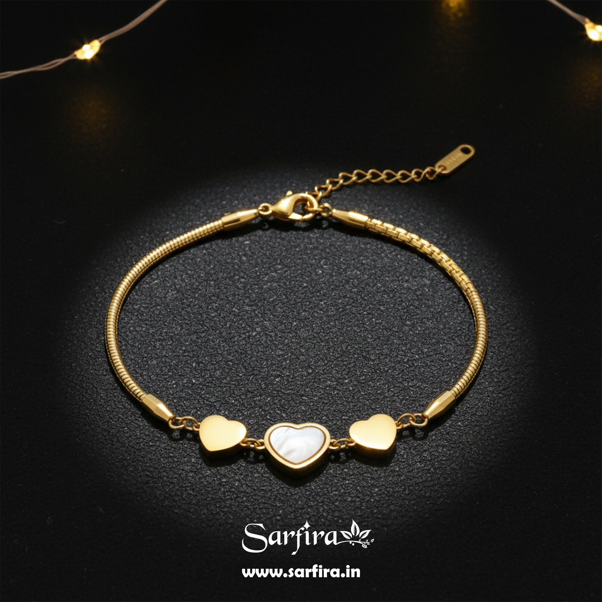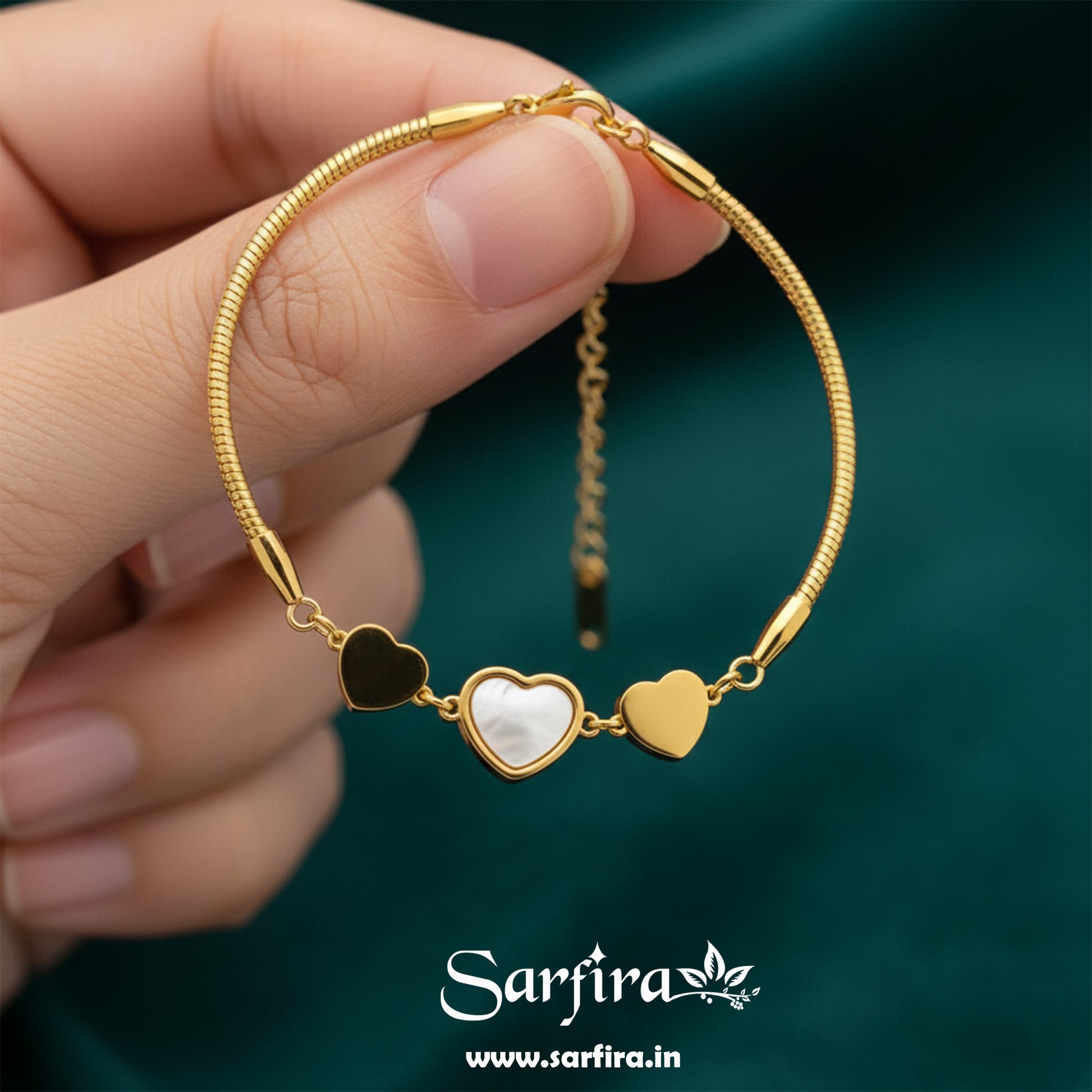This is a link bracelet featuring a sleek, round snake chain. The central design consists of three connected heart motifs: two outer hearts are solid, polished gold-plated, and the central heart features a white, iridescent Mother-of-Pearl (MOP) style inlay. The heart trio is fixed in the center of the chain.
