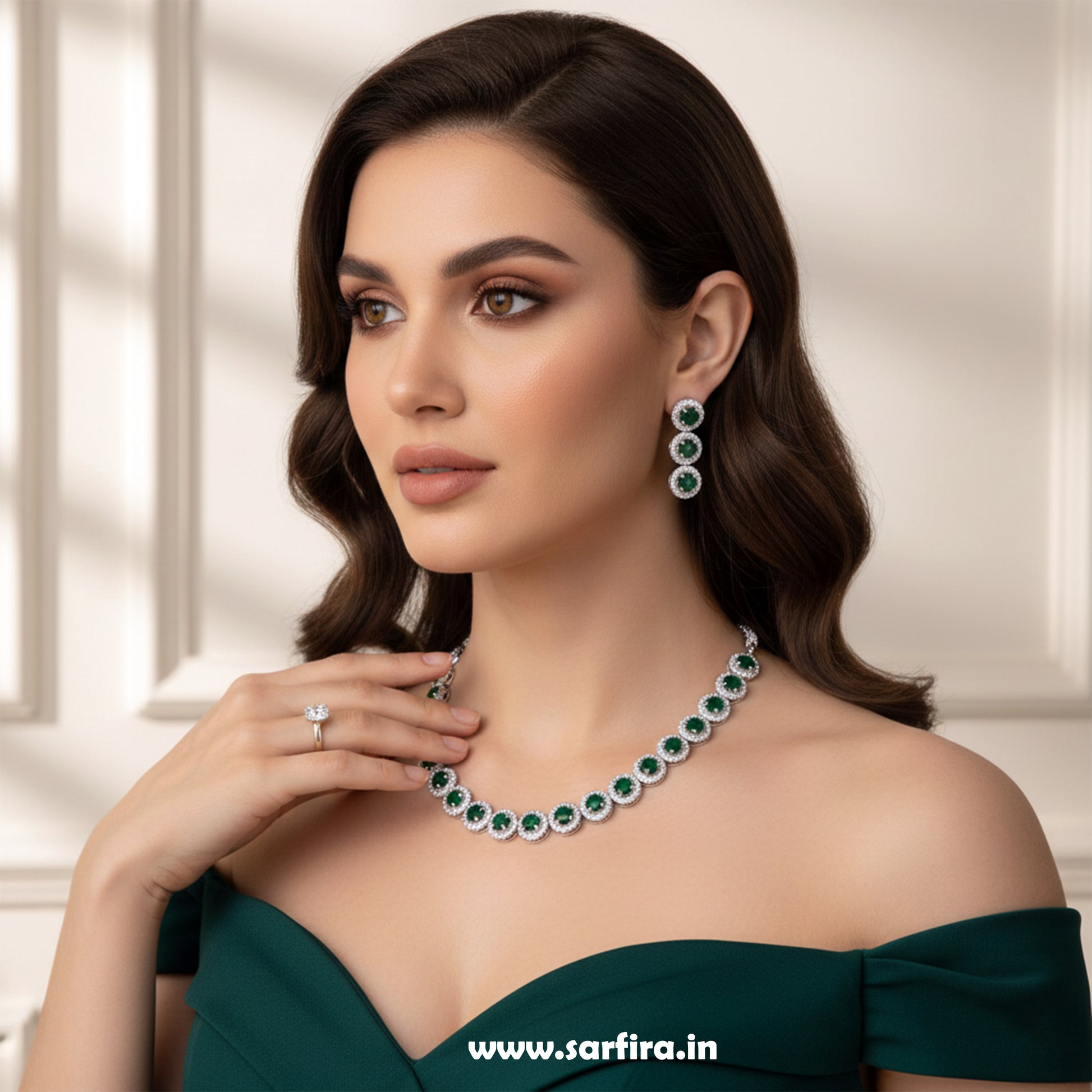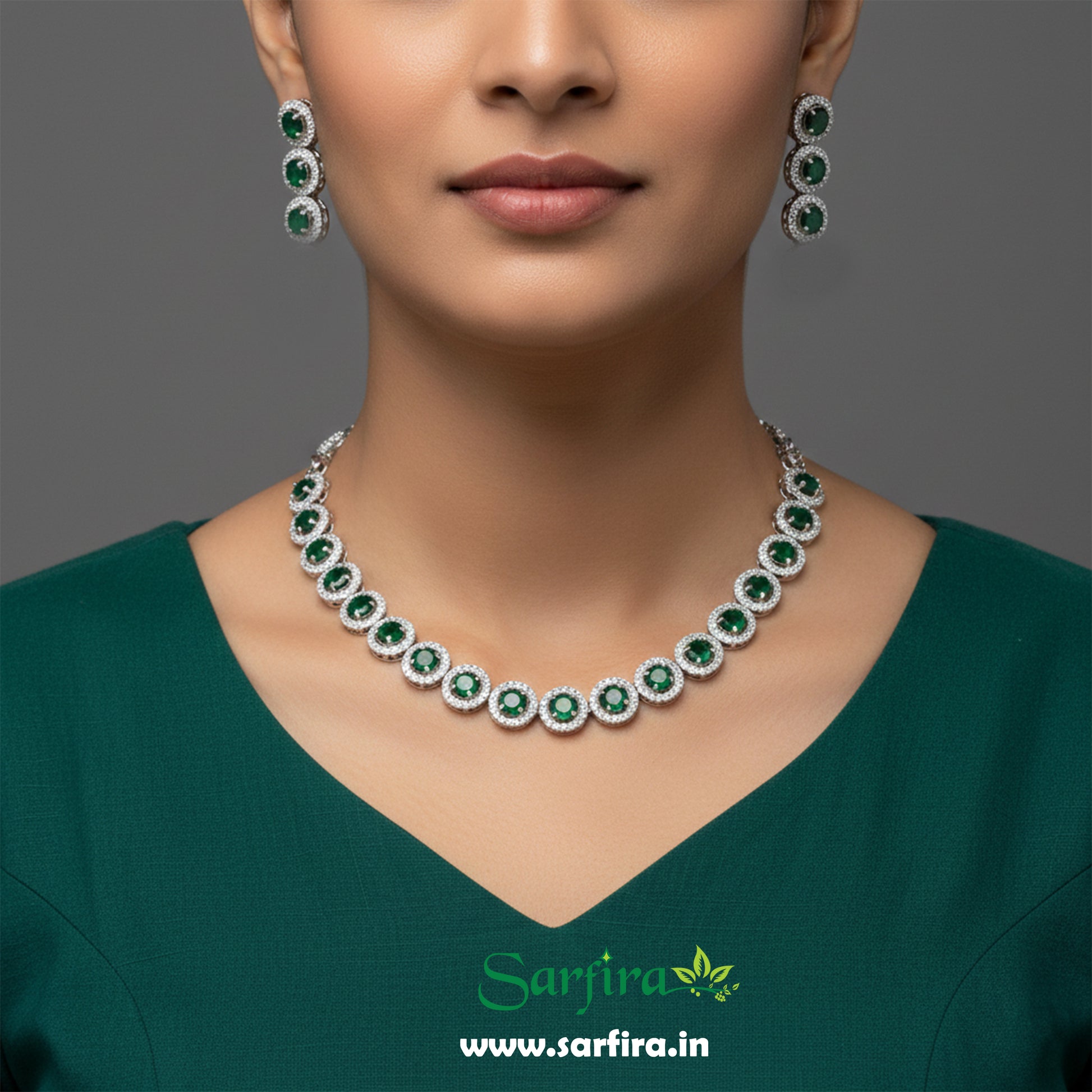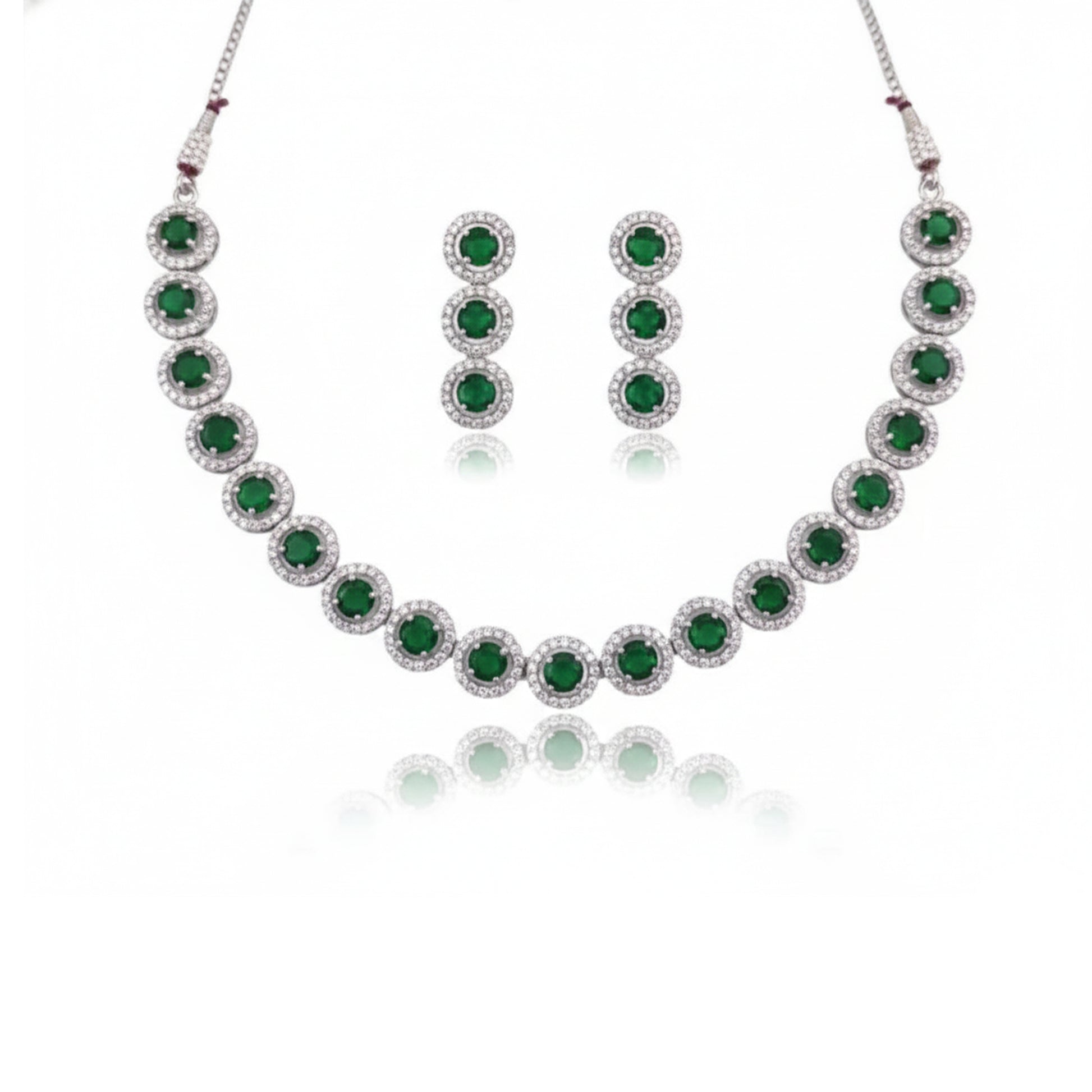 This is a matching jewellery set that includes one necklace and a pair of drop earrings. The necklace is made of a linked chain of continuous round motifs. Each motif features a central green simulated gemstone surrounded by a halo of clear American Diamond (CZ) stones. The earrings feature three linked round halo motifs.
