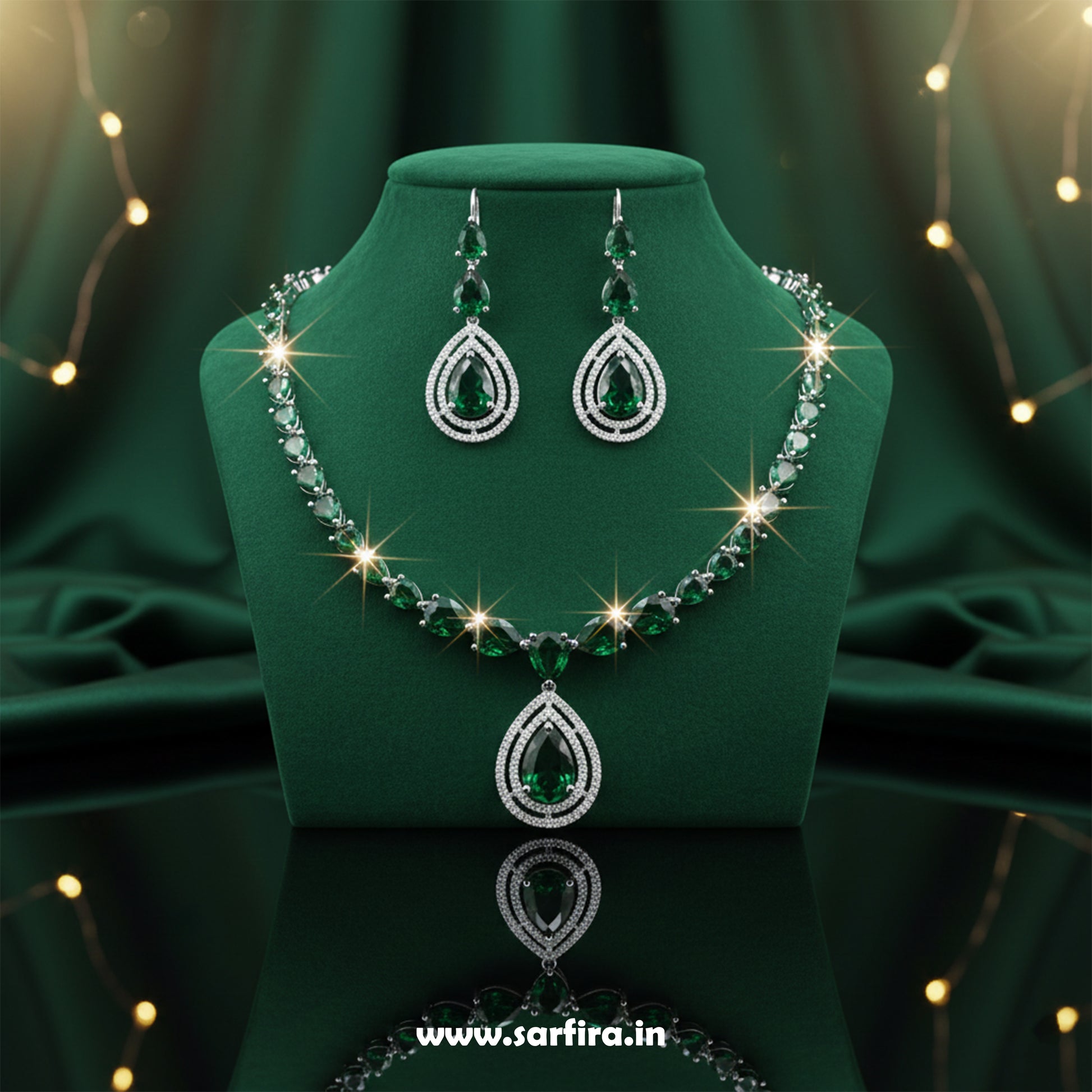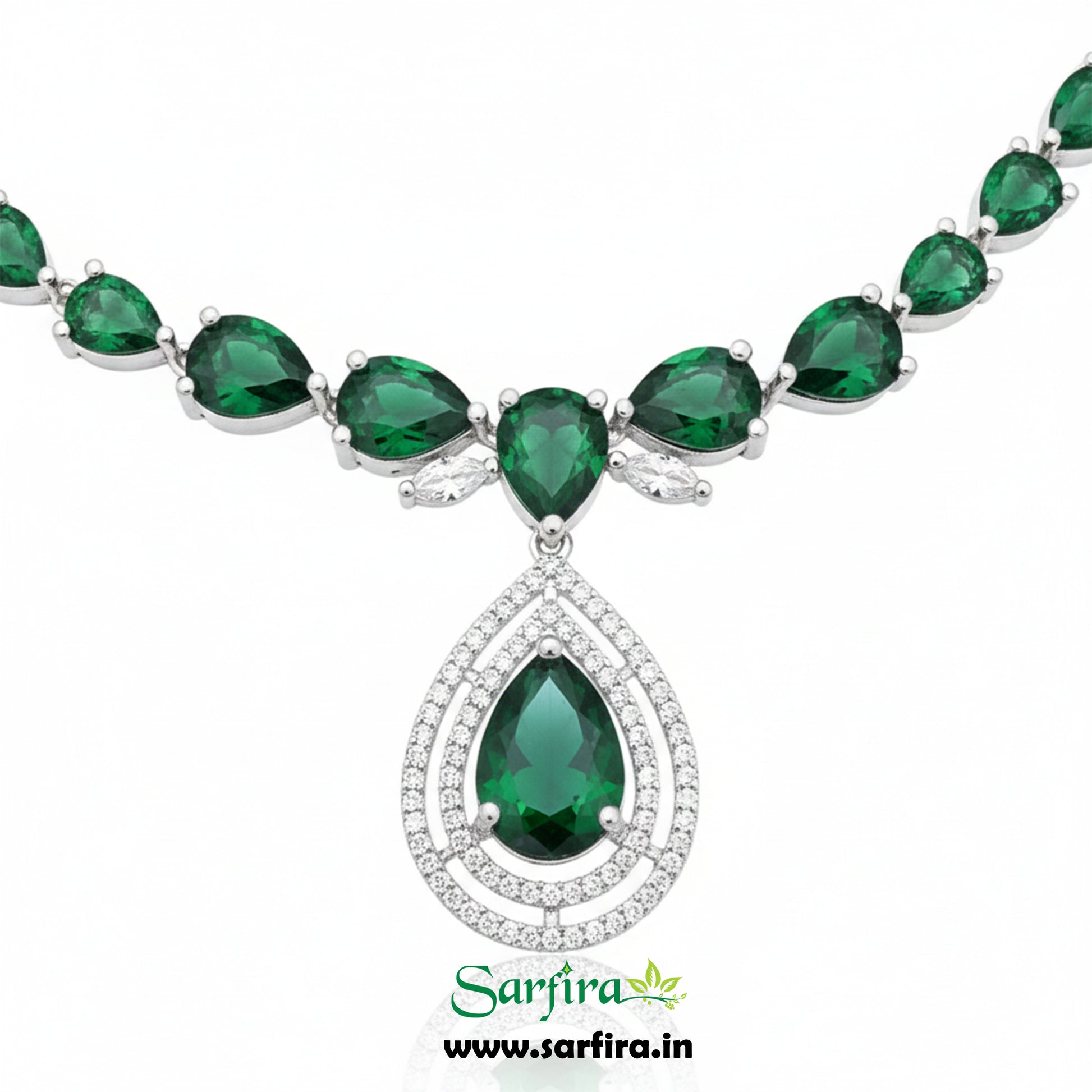 This is a matching jewelry set that includes one choker necklace and a pair of drop earrings. The entire set is decorated with bright, clear American Diamond (CZ) stones. The necklace is made of many linked round halo motifs, where a central stone is surrounded by smaller AD stones. The earrings feature three linked round halo motifs. This design sits close to the neck like a choker.
