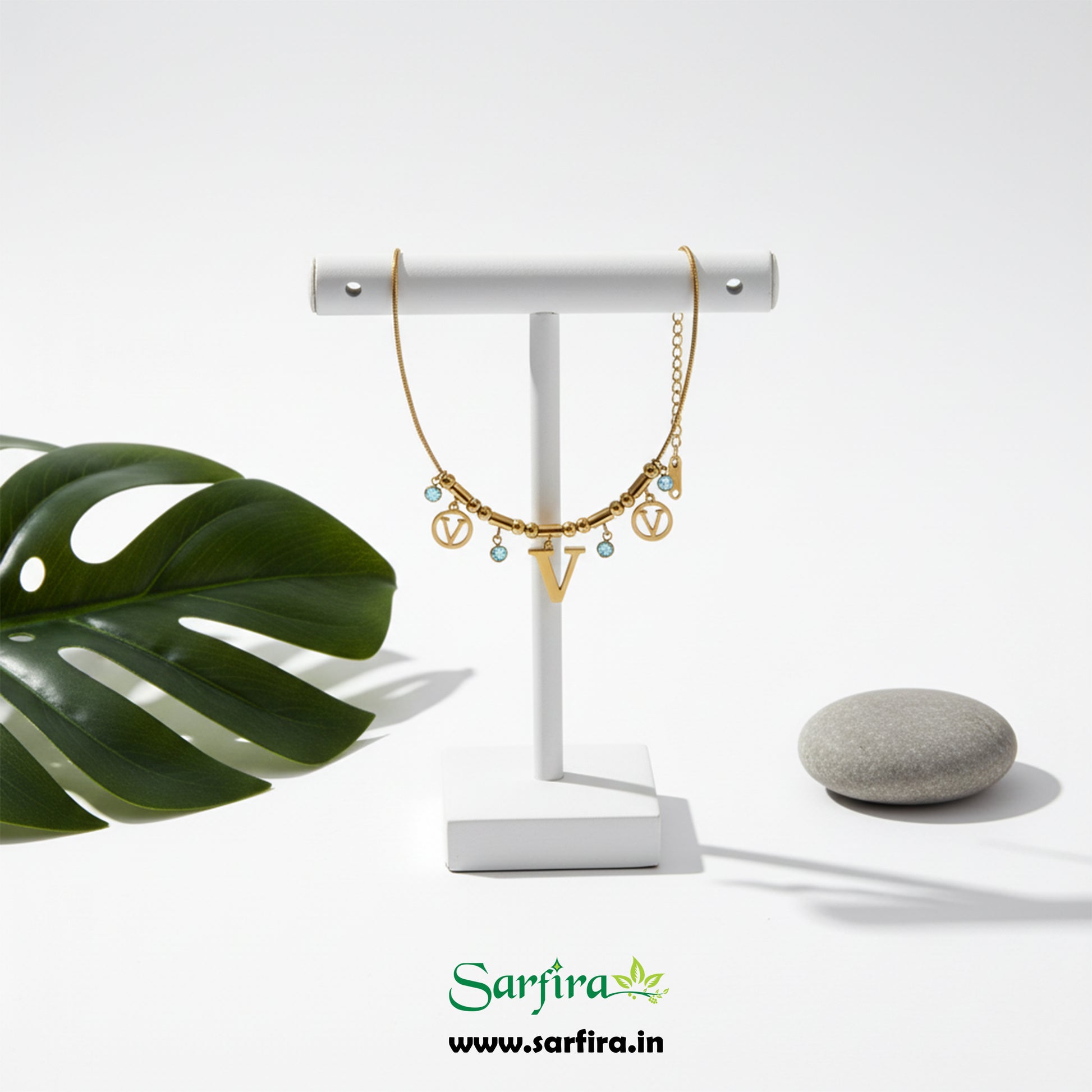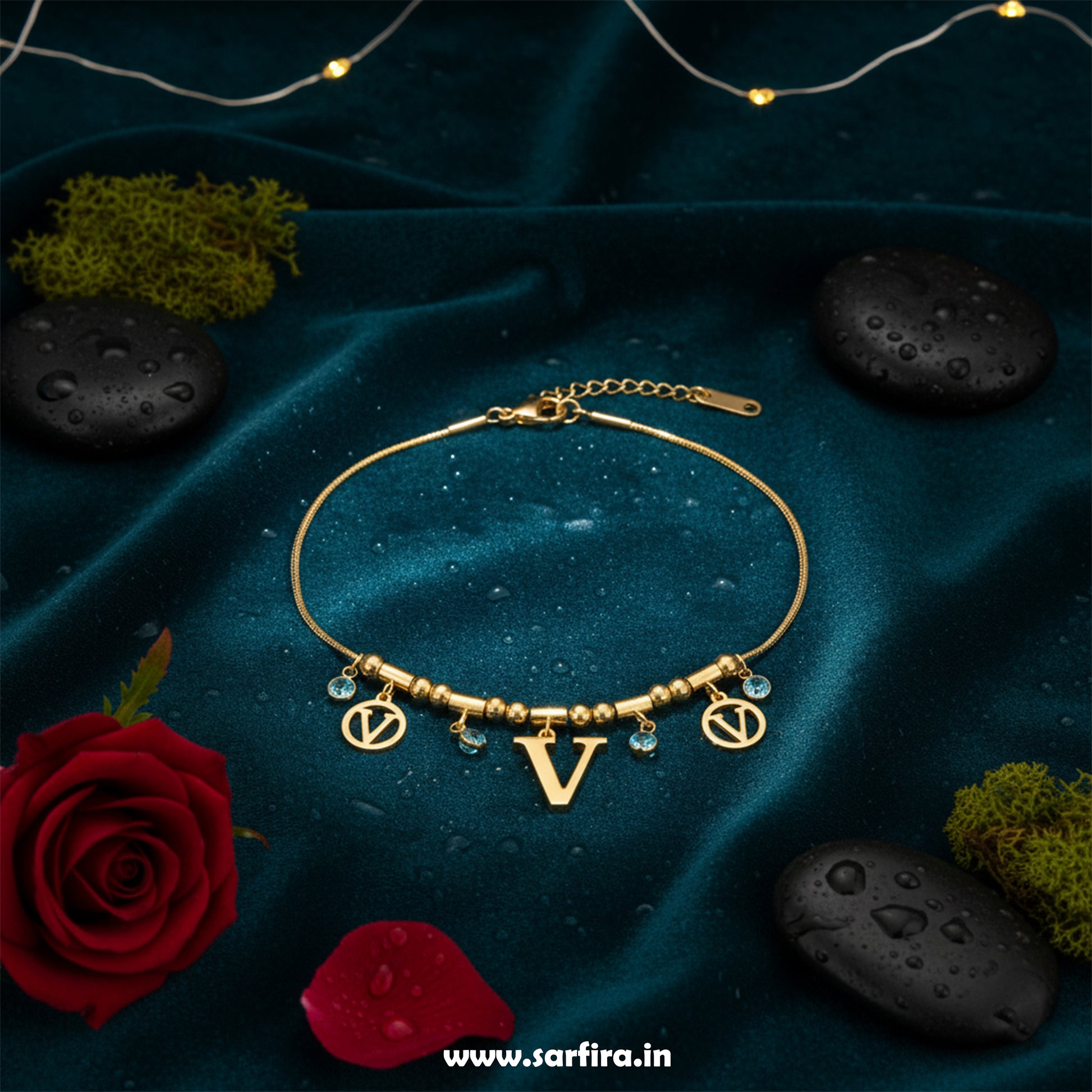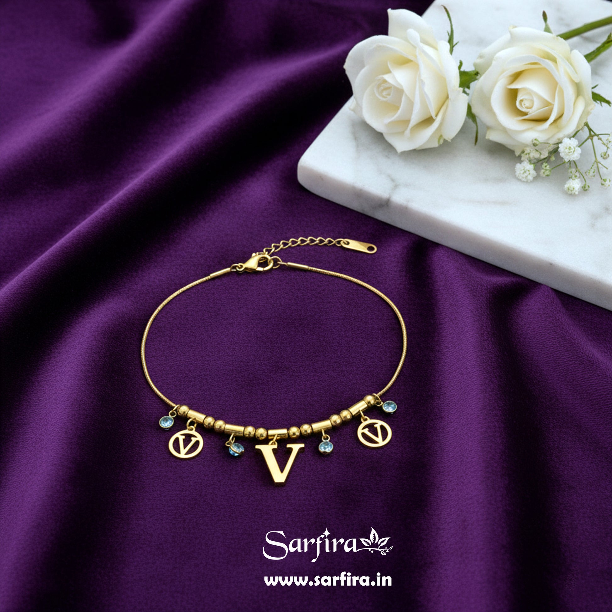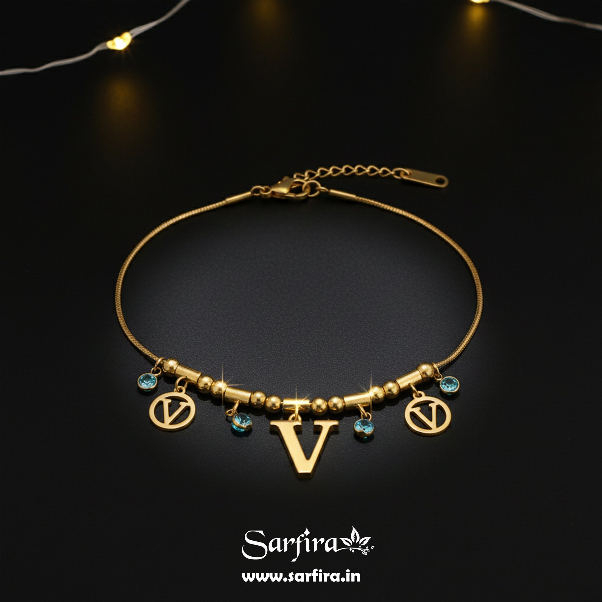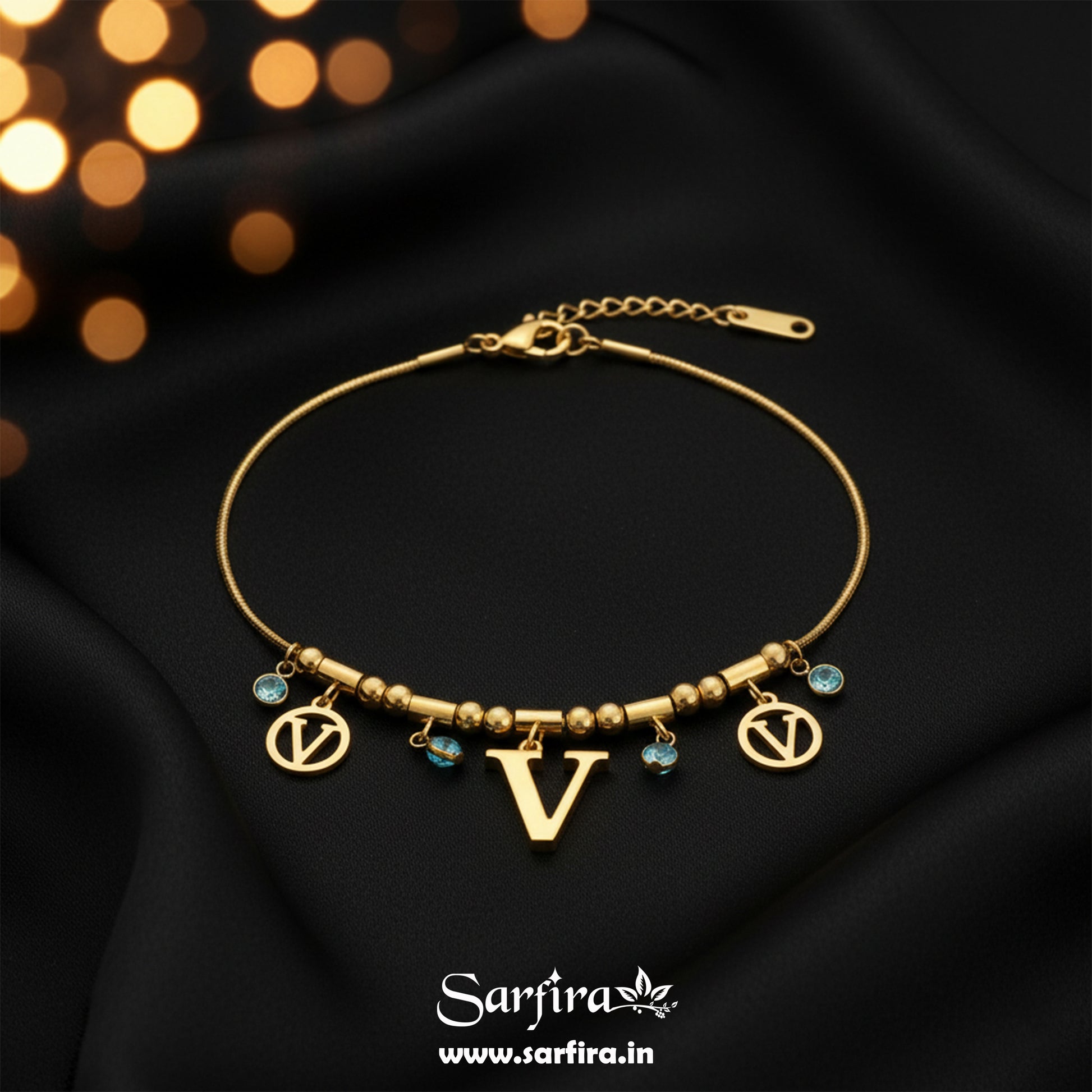This is a link bracelet featuring a multi-component chain design. The main body consists of a combination of a round snake chain and a central section of various gold-plated beads (round and tubular). Dangling from the beaded section are multiple charms: a large, polished gold letter 'V' pendant, two small, round, light-blue simulated gemstone drops, and two circular charms with an open-outline letter 'V' motif.
