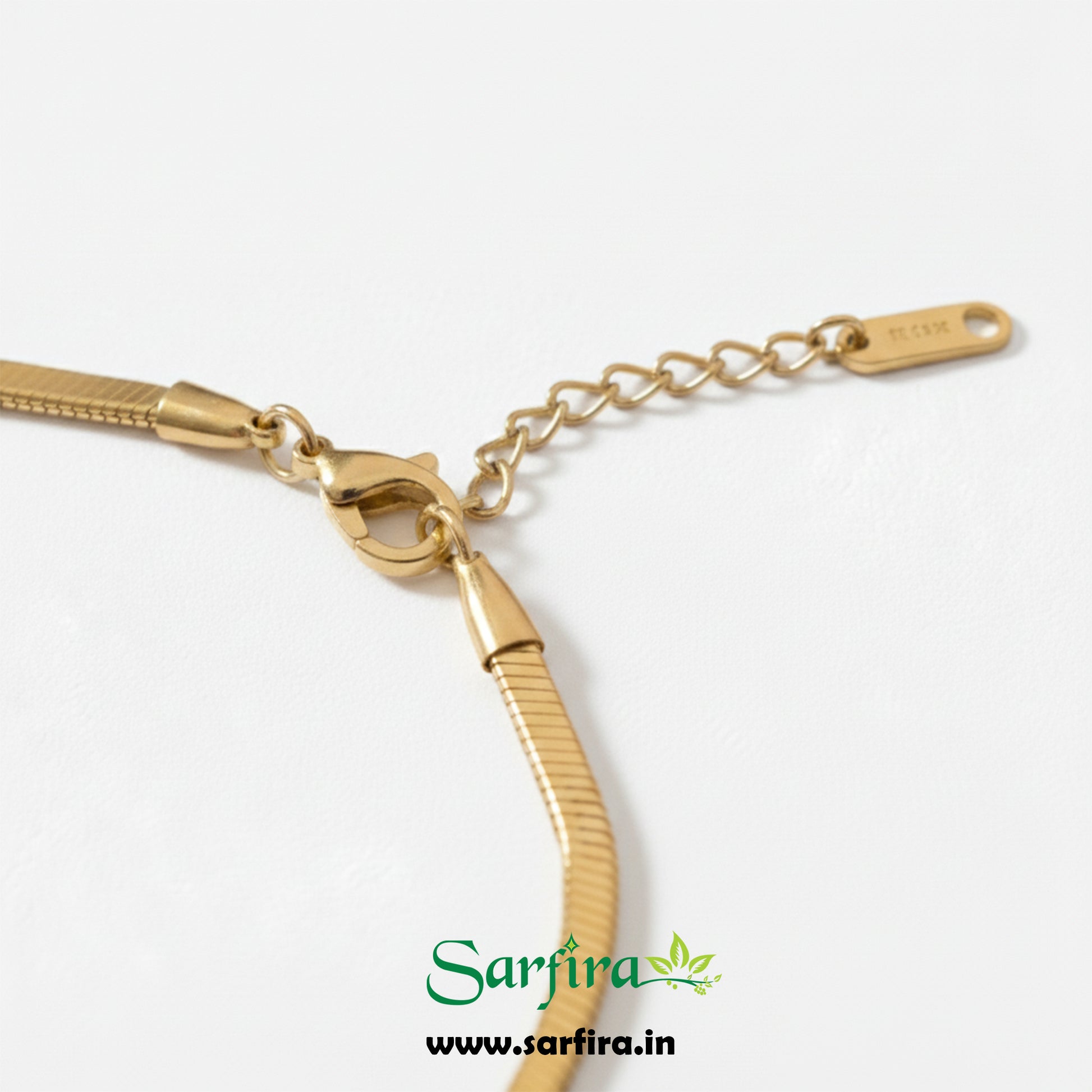 The item is constructed entirely from stainless steel with a gold-plated finish. This fabrication results in anti-tarnish and water-resistant properties, making the bracelet suitable for consistent, daily wear. It includes an extension chain for adjustable sizing.