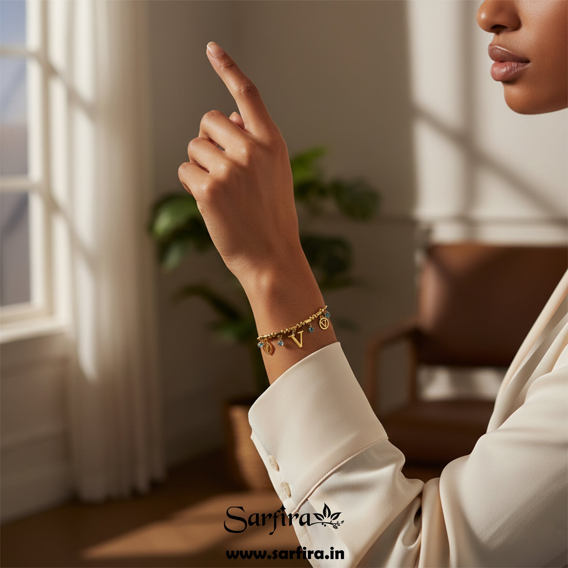The bracelet's mixture of bead shapes, the snake chain, and multiple charms gives it a decorative, layered look. Wear it as a comfortable, everyday wrist accent. The central initial and blue gemstone accents provide a personalized focal point. This design is suitable for pairing with simple, non-dangling jewelry.