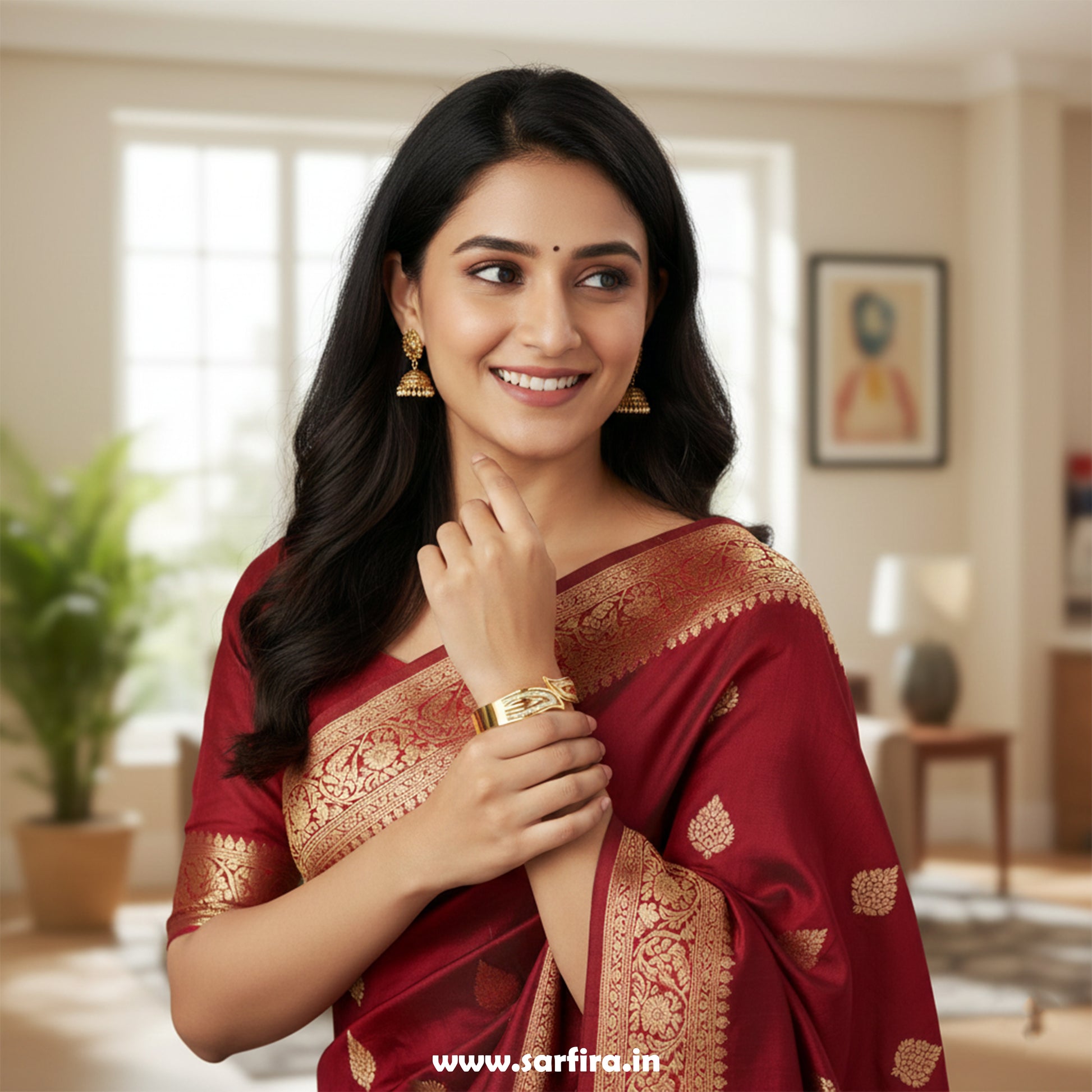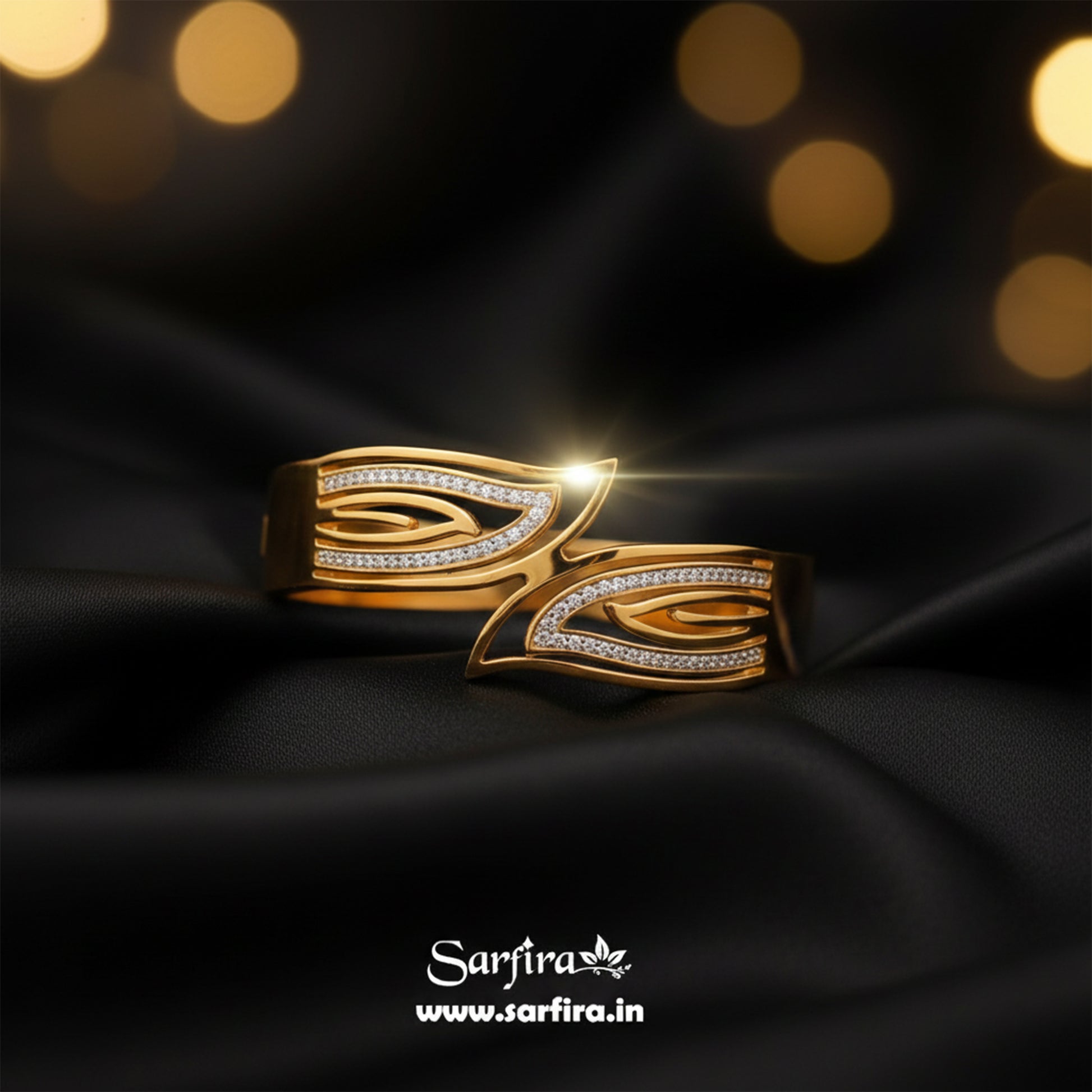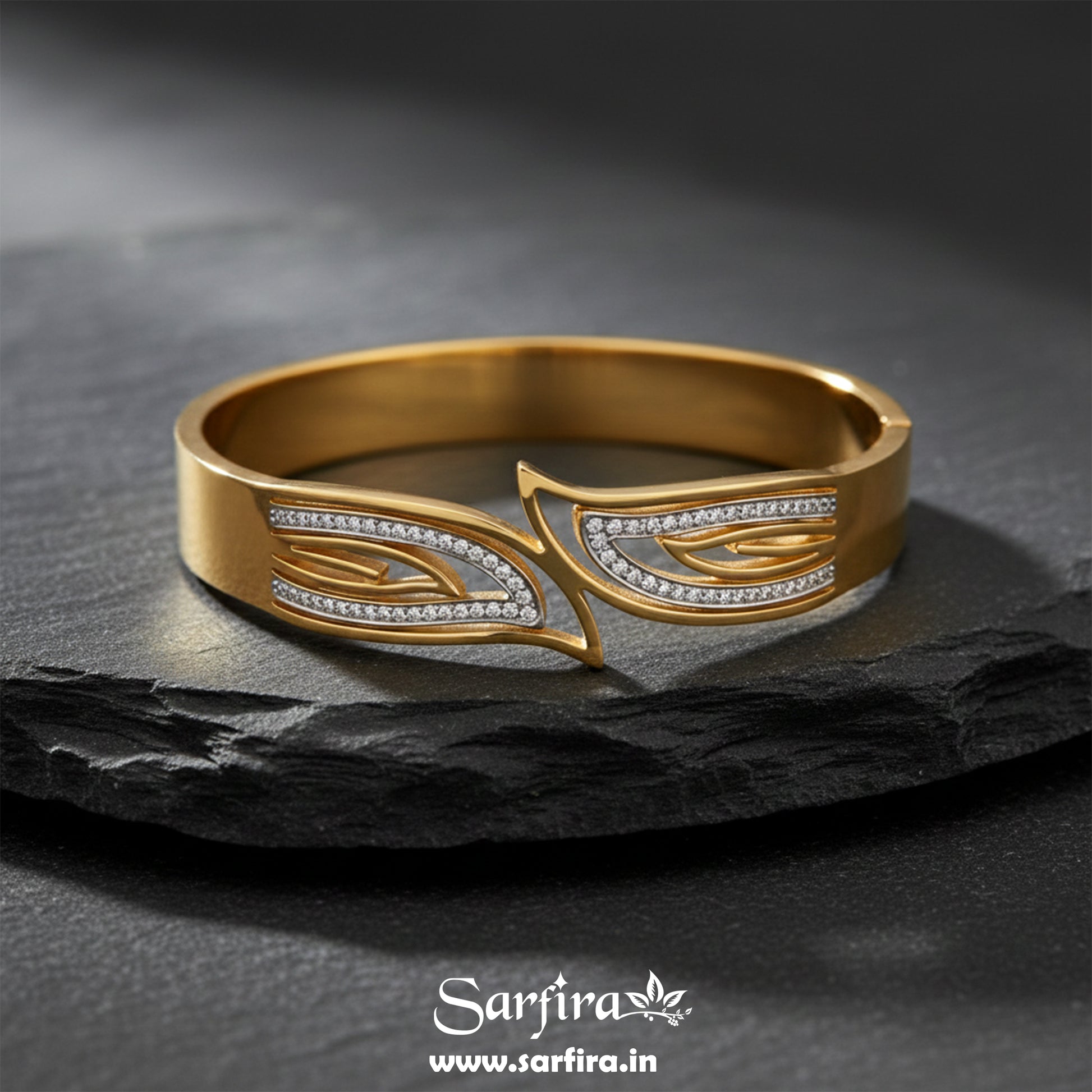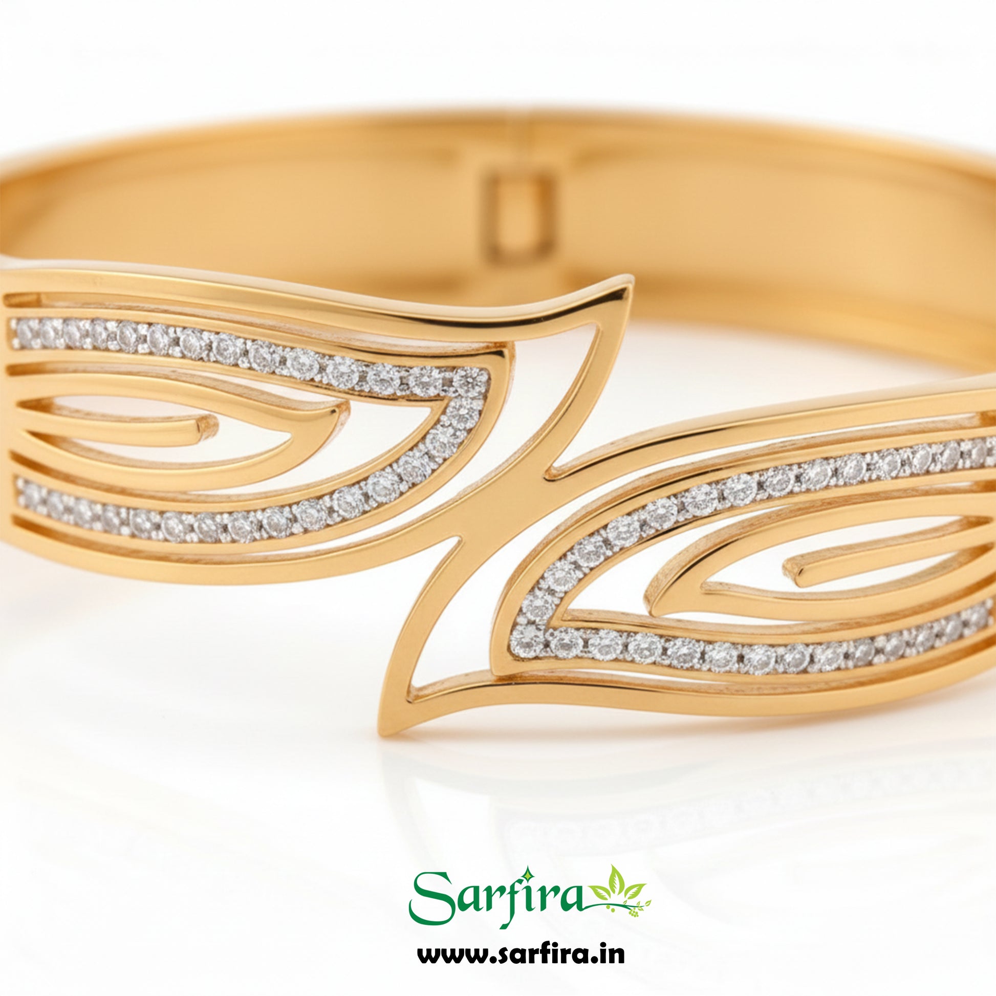 This is a wide bangle (Kada) with a simple, curved band that opens on the side. The front features a design where two stylized leaf shapes cross over each other. Each leaf shape is cut out in the center and has rows of small, clear CZ stones set on its surface.