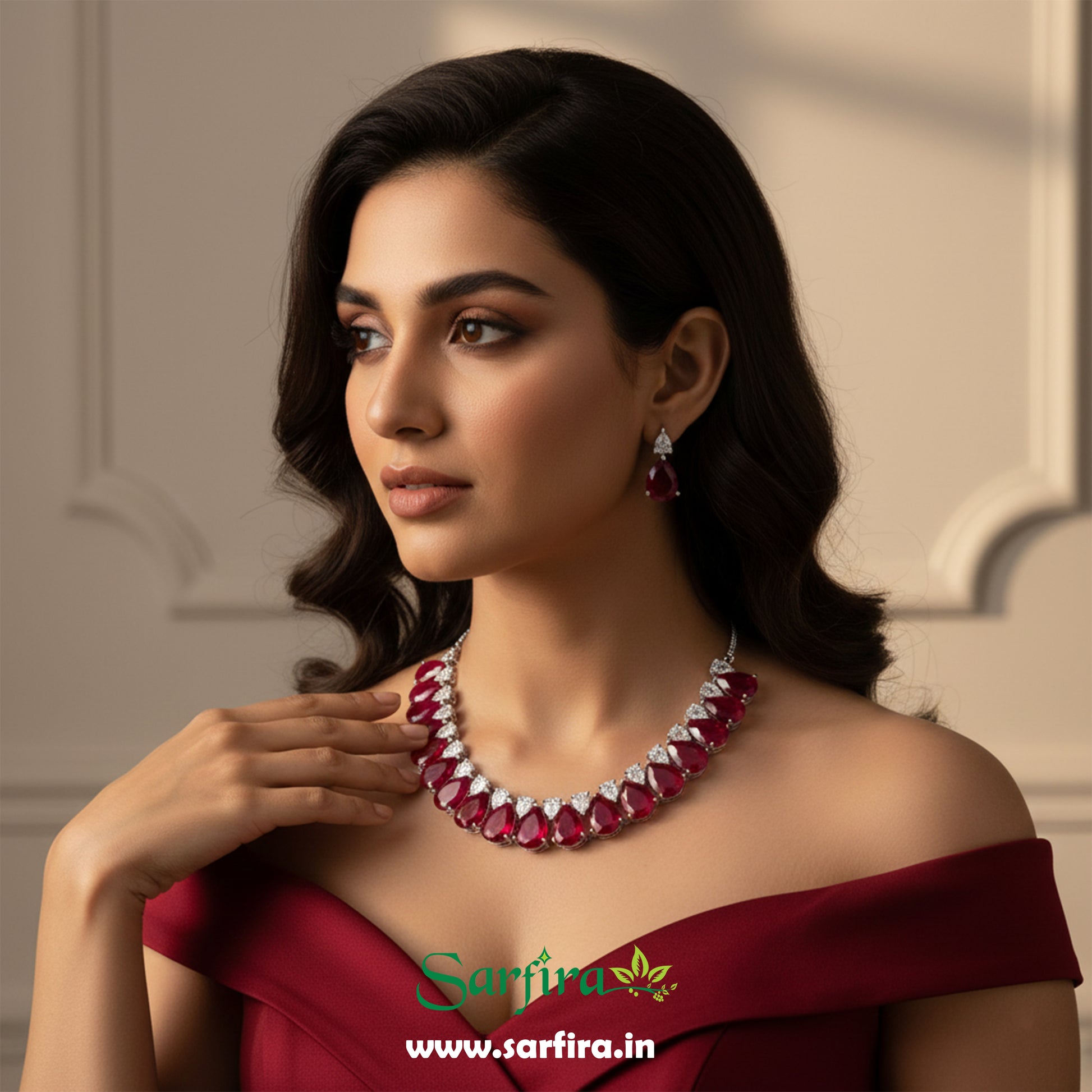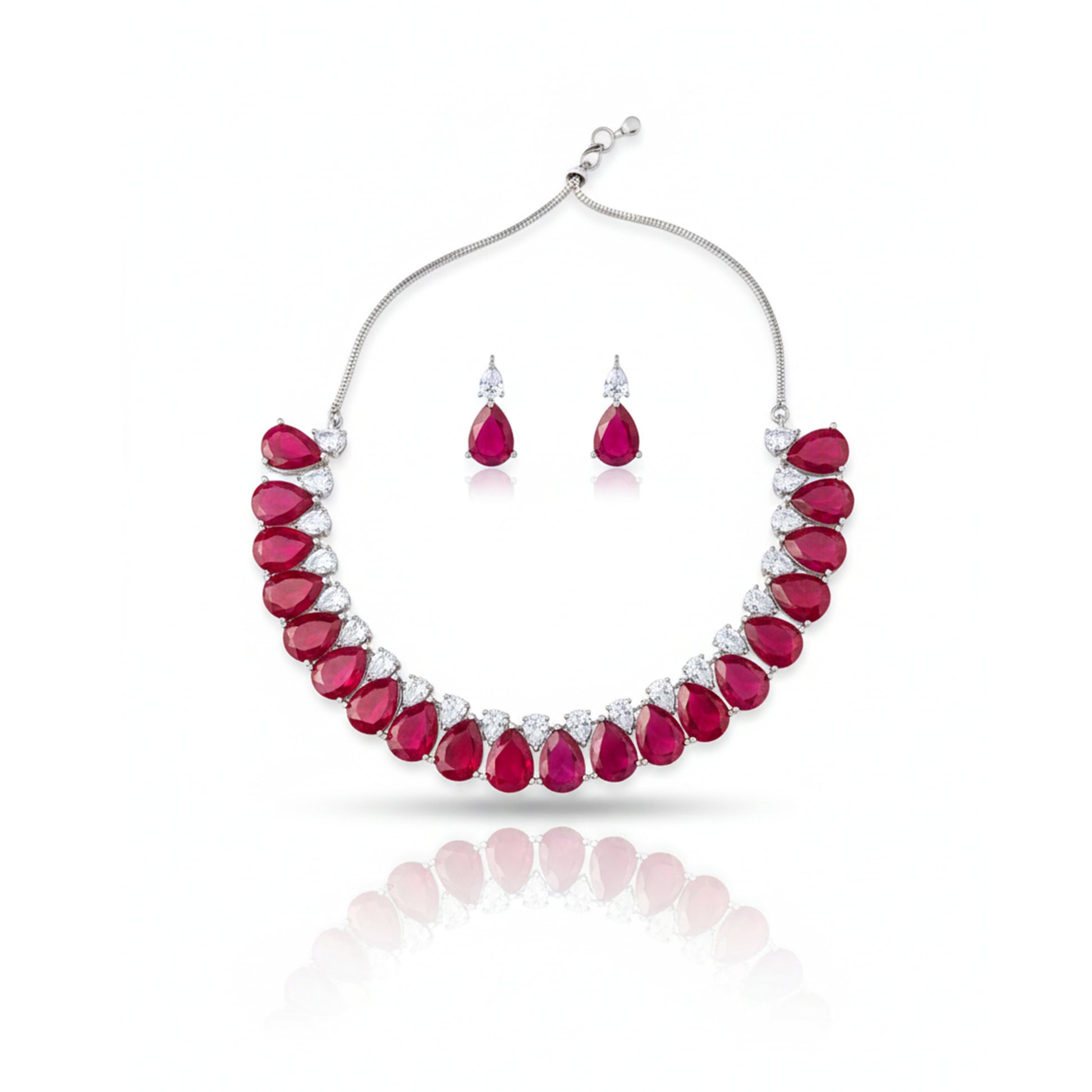 This is a matching jewelry set that includes one choker necklace and a pair of stud earrings. The necklace is made of a continuous line of large, deep red simulated gemstones in tear-drop shapes. Small, clear American Diamond (CZ) stones are placed between the red stones. The necklace fits close to the neck like a choker. The earrings are simple drops featuring a red tear-drop stone and a clear AD stud.