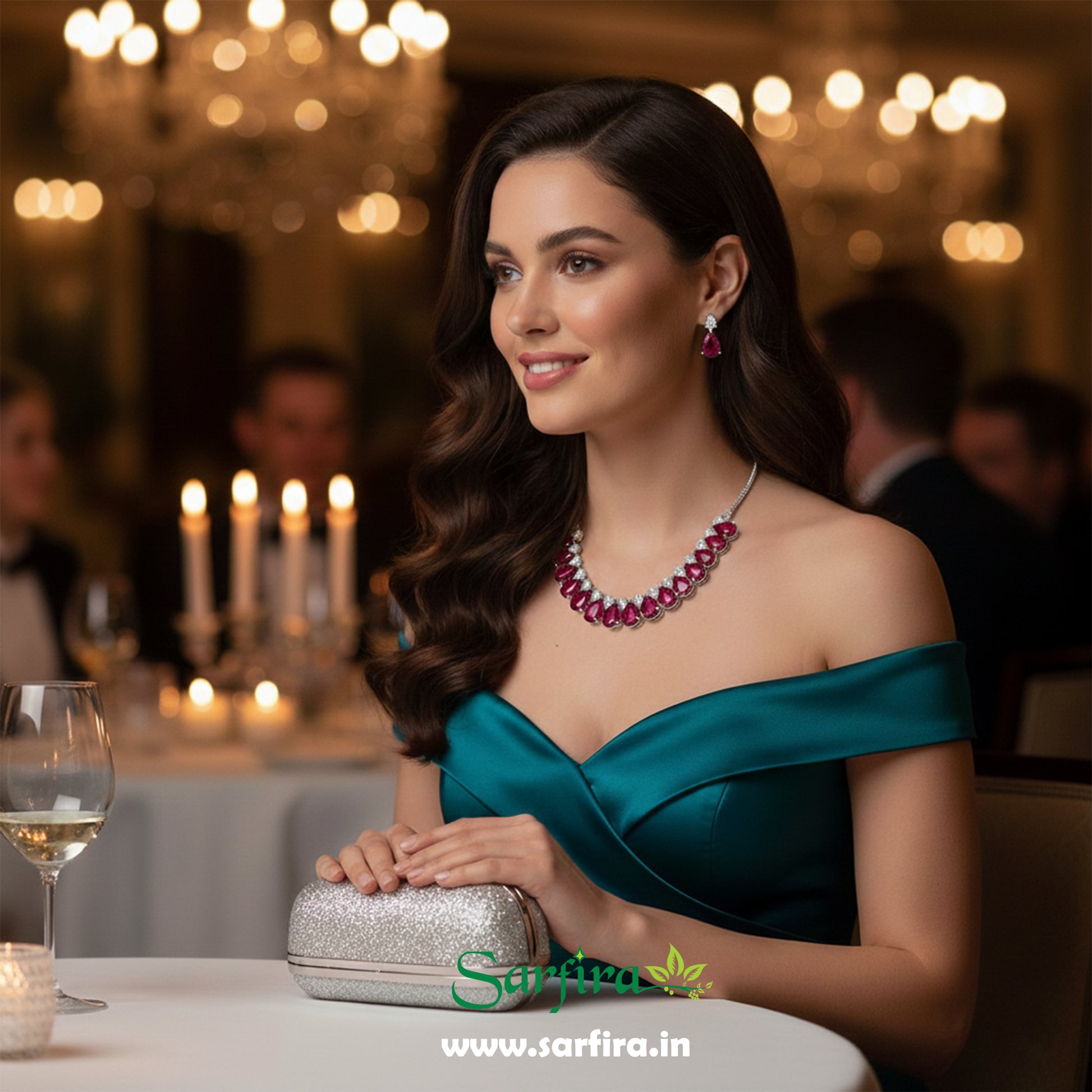 This bold red set is a classic statement piece, perfect for weddings, anniversary dinners, or cultural events. The choker style sits beautifully on the collarbone, pairing well with traditional or low-cut Western necklines.