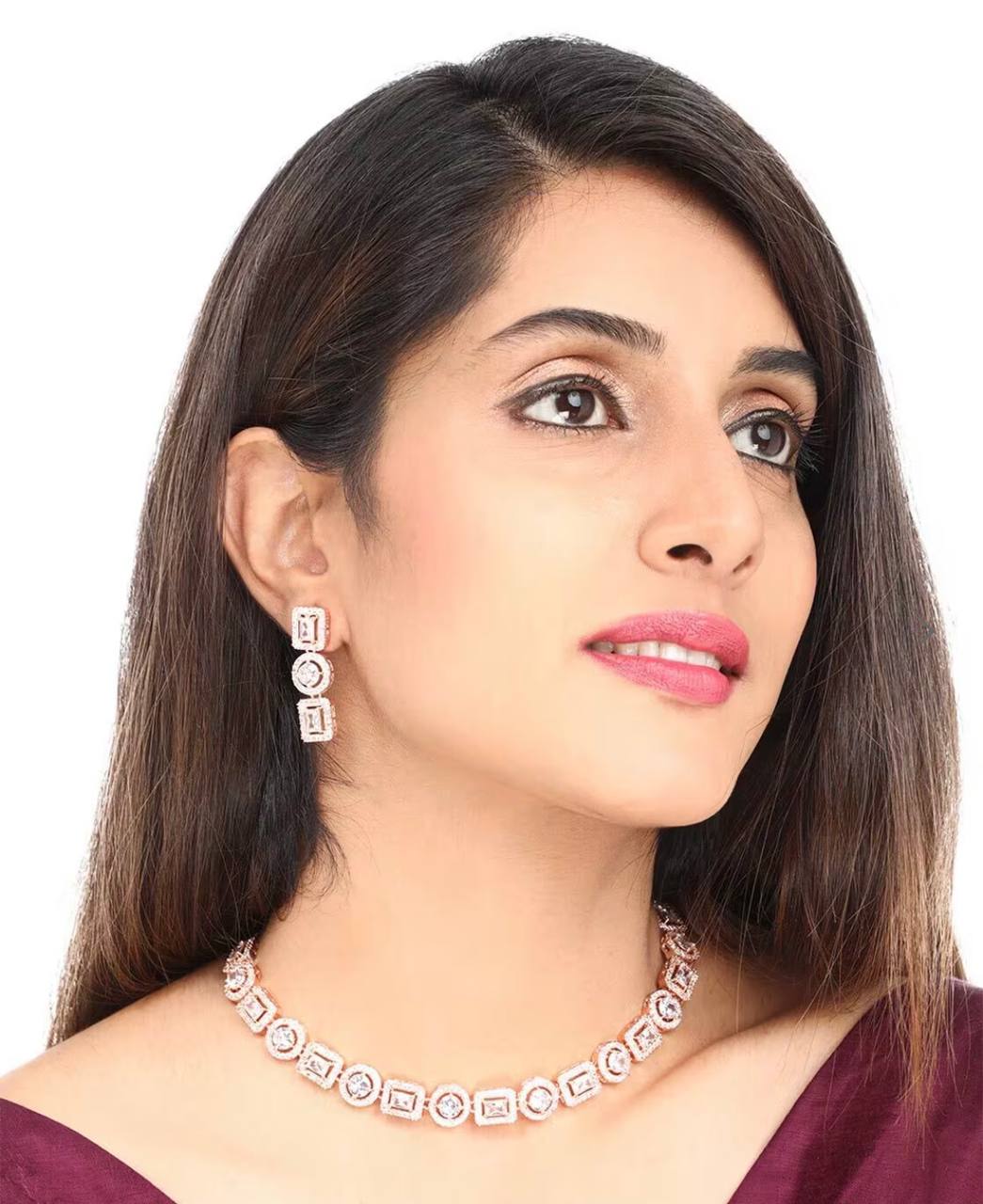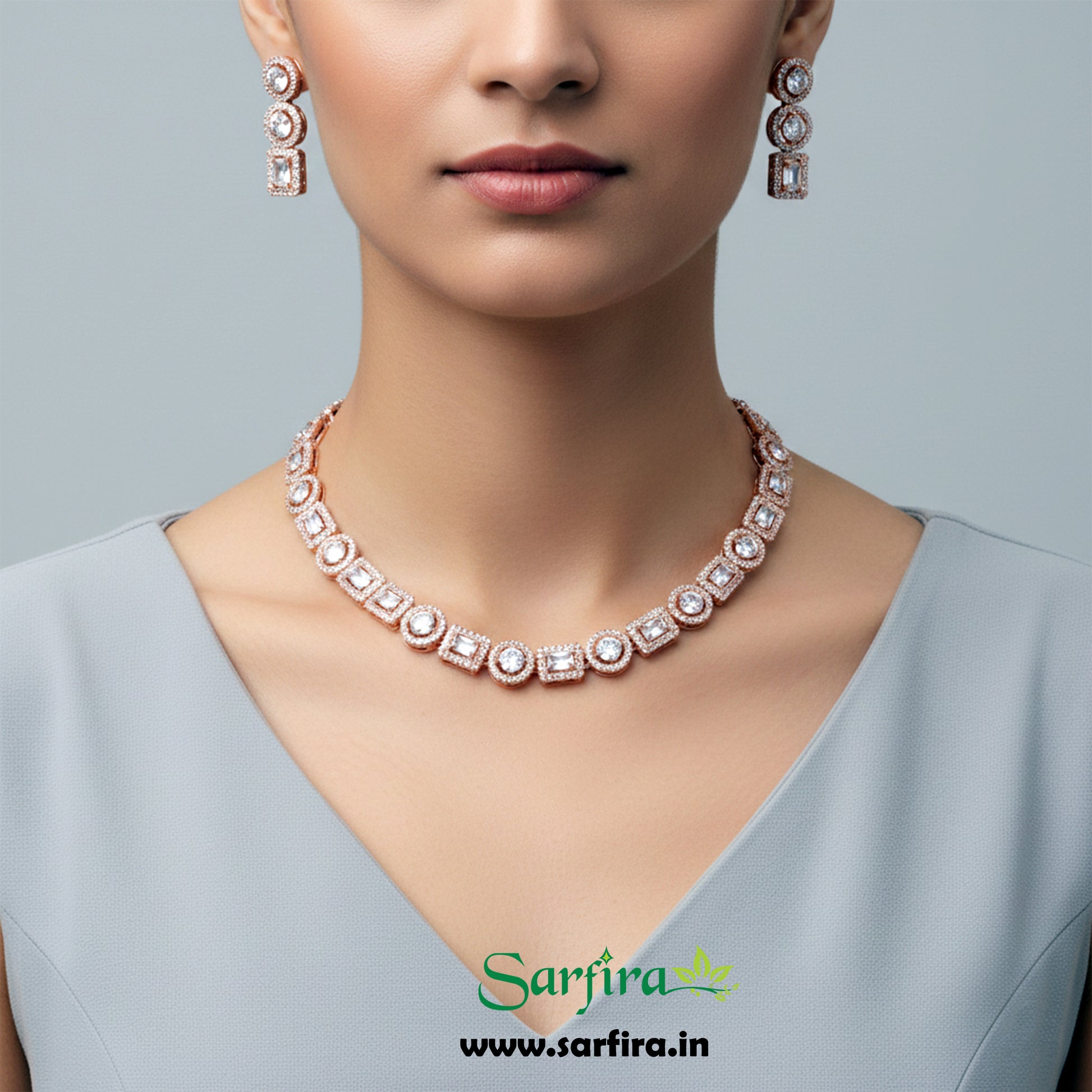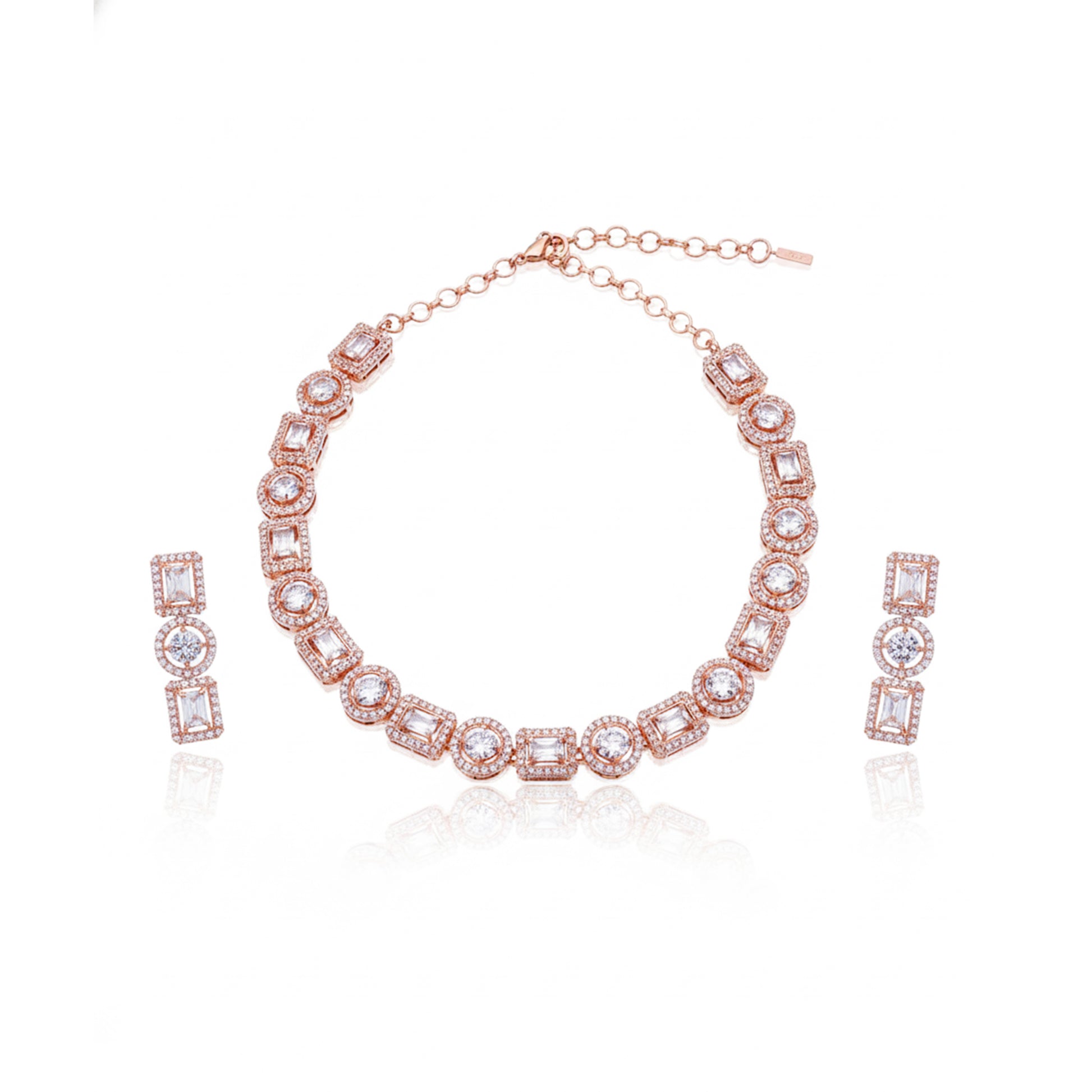 This is a matching jewelry set that includes one necklace and a pair of drop earrings. The set has a warm Rose Gold finish and is fully covered with sparkling clear American Diamond (CZ) stones. The necklace is made of linked motifs that alternate between round shapes and square shapes, each set in a halo of smaller AD stones. The earrings feature three matching linked motifs.
