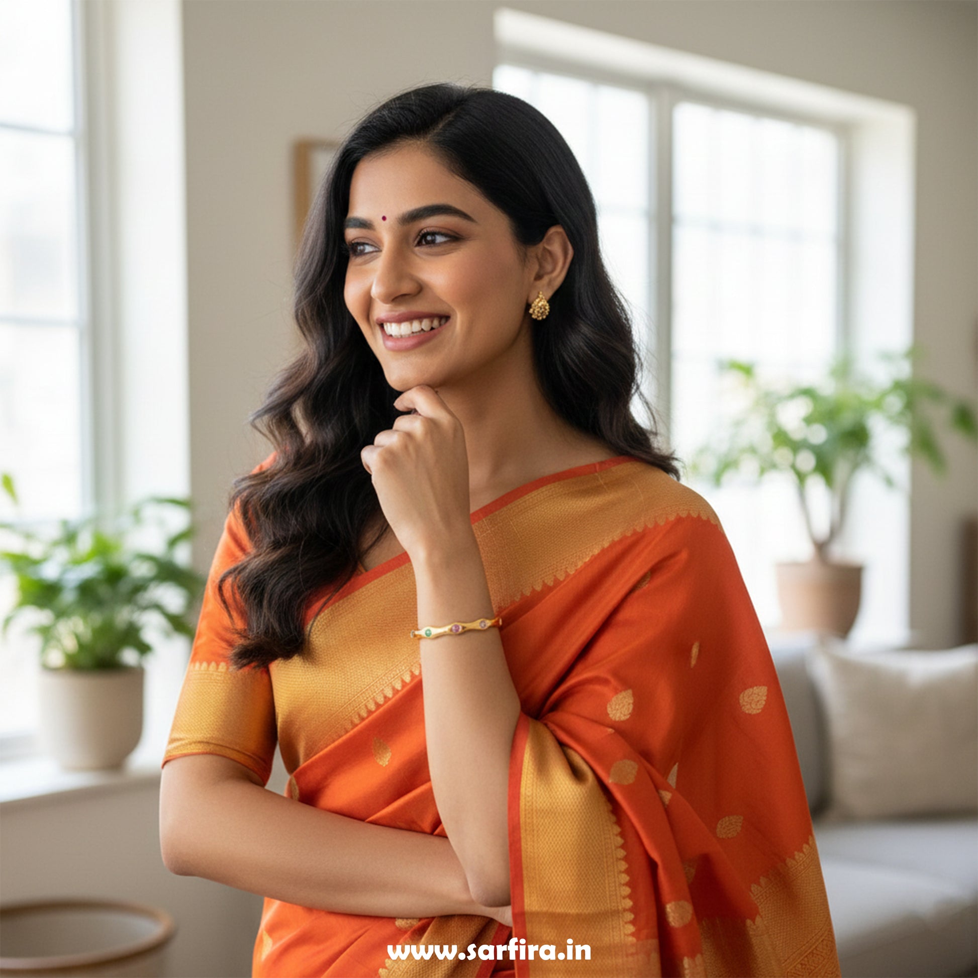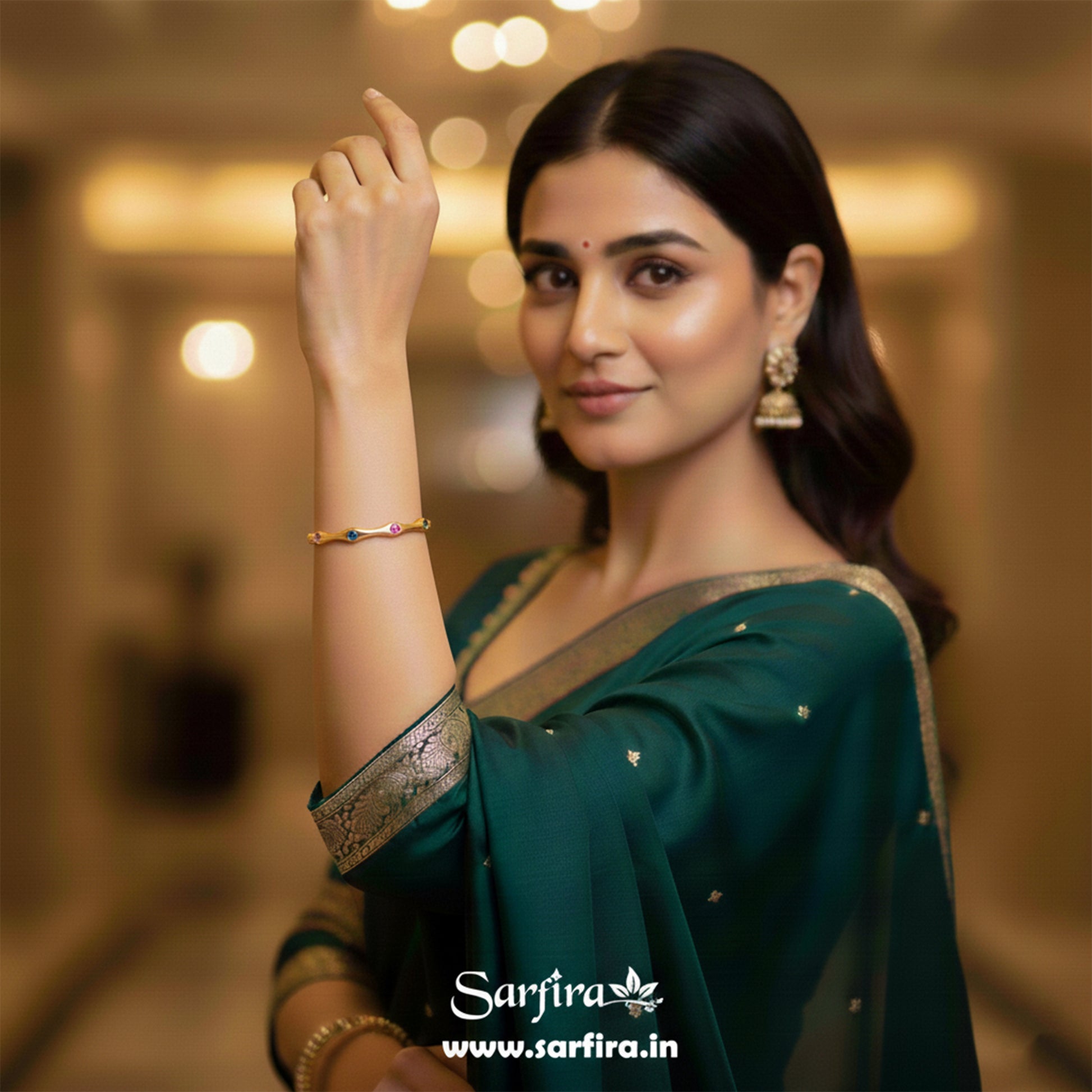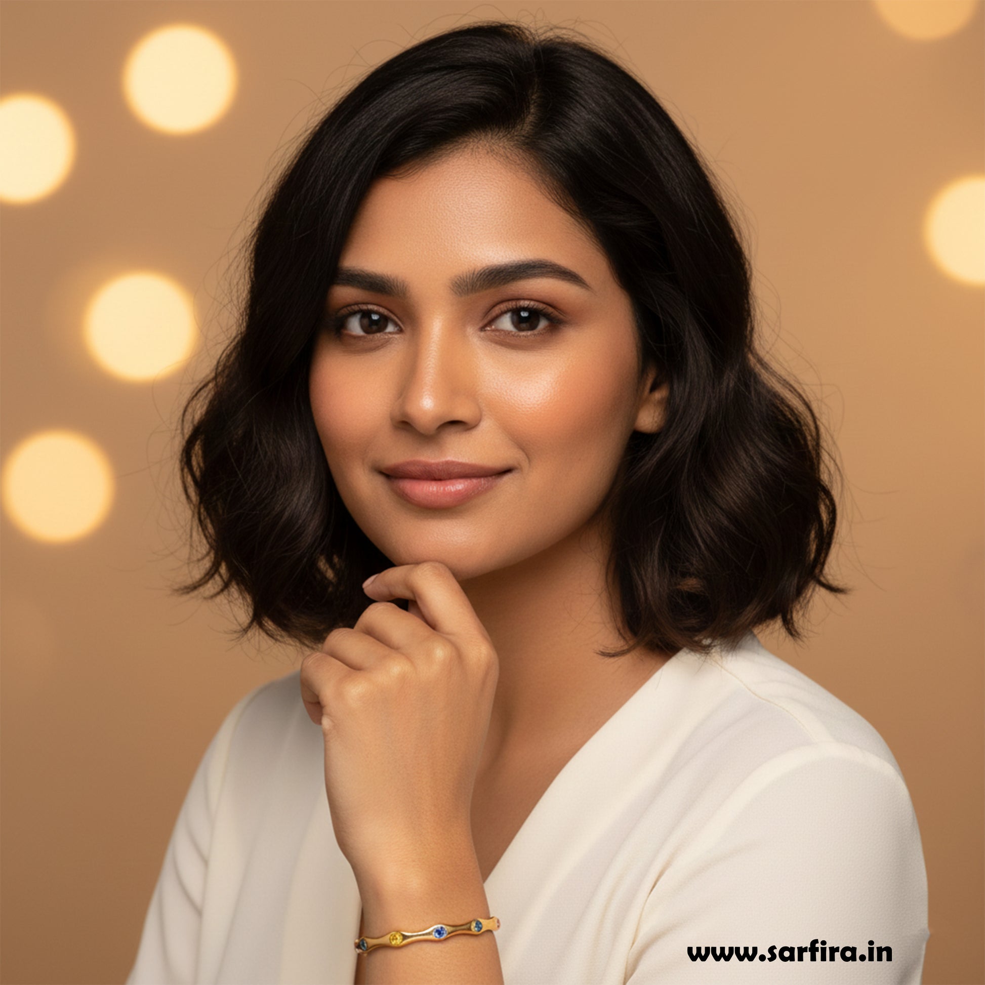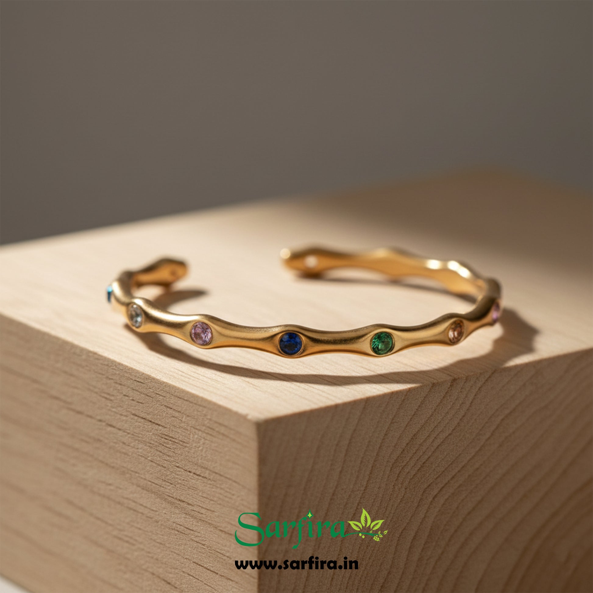 The bracelet's unique wavy shape and multi-color stones make it a fun, artistic accent piece. Wear it alone to show off the irregular shape and the bright pop of colors. This kada is good for pairing with casual outfits or stacking with simple, smooth gold bangles.