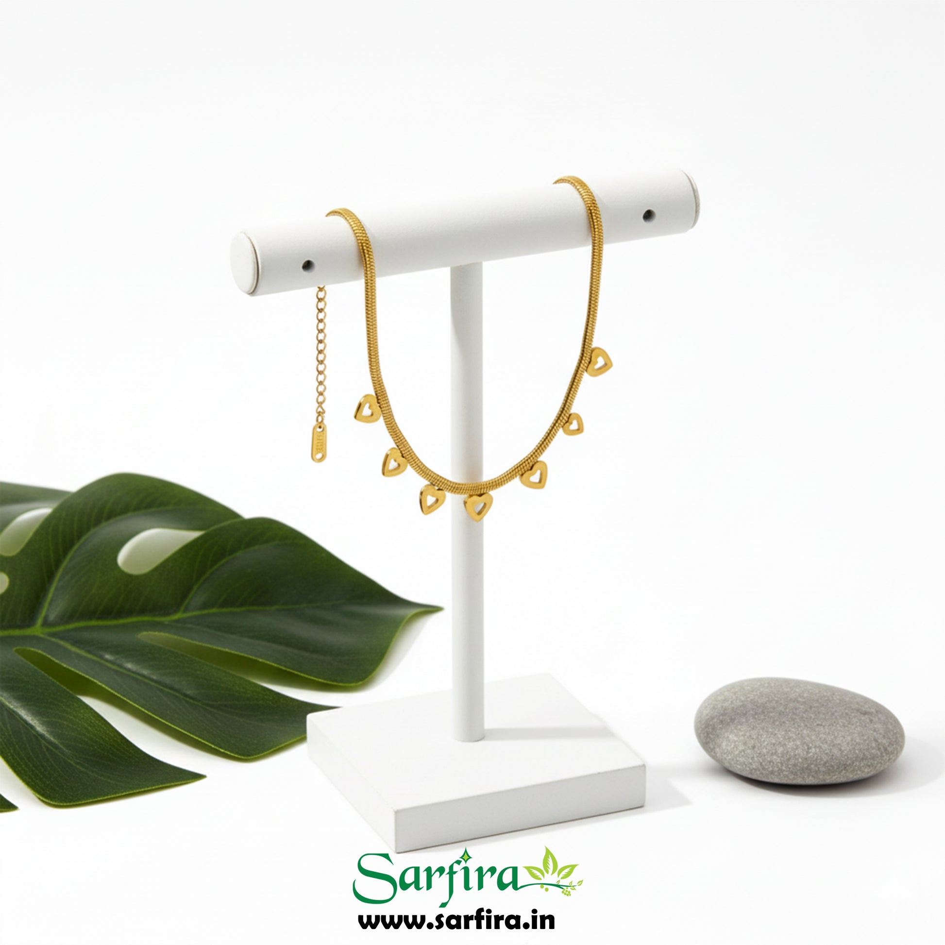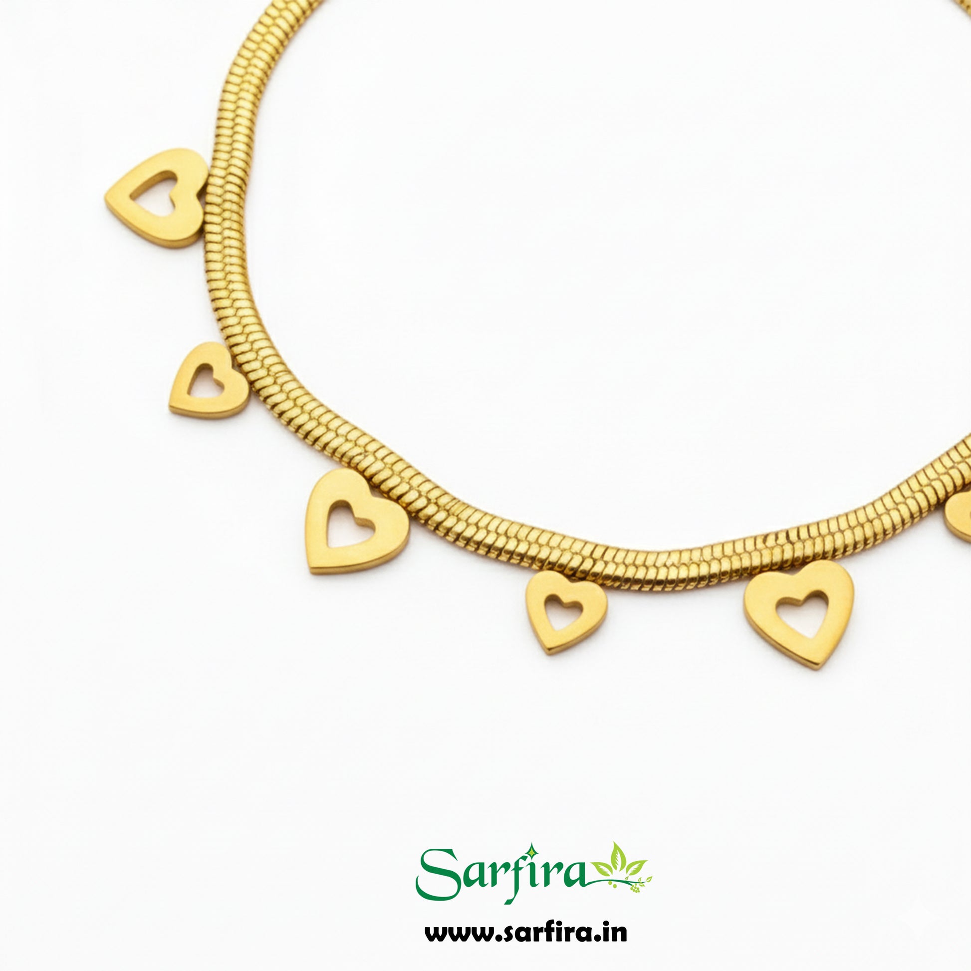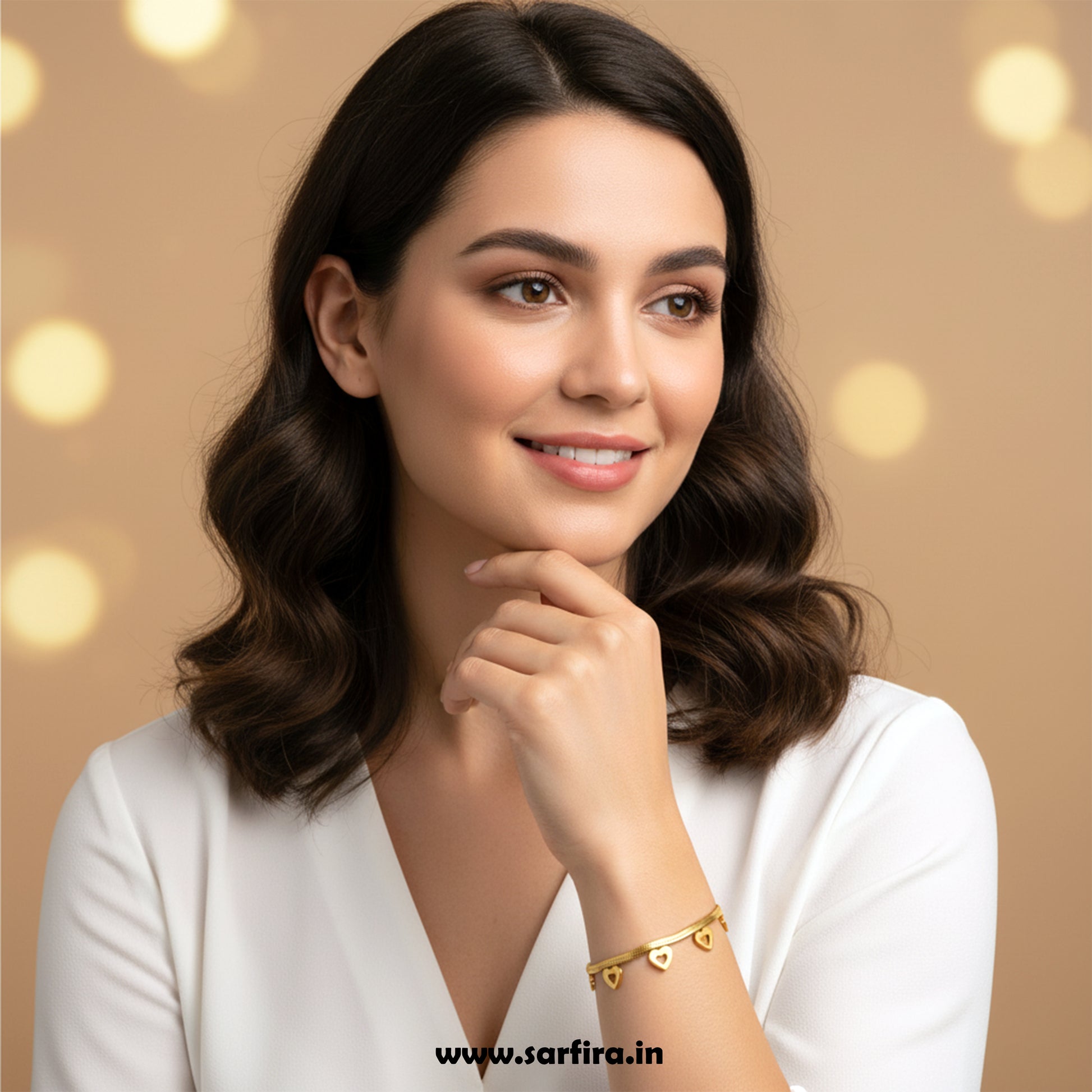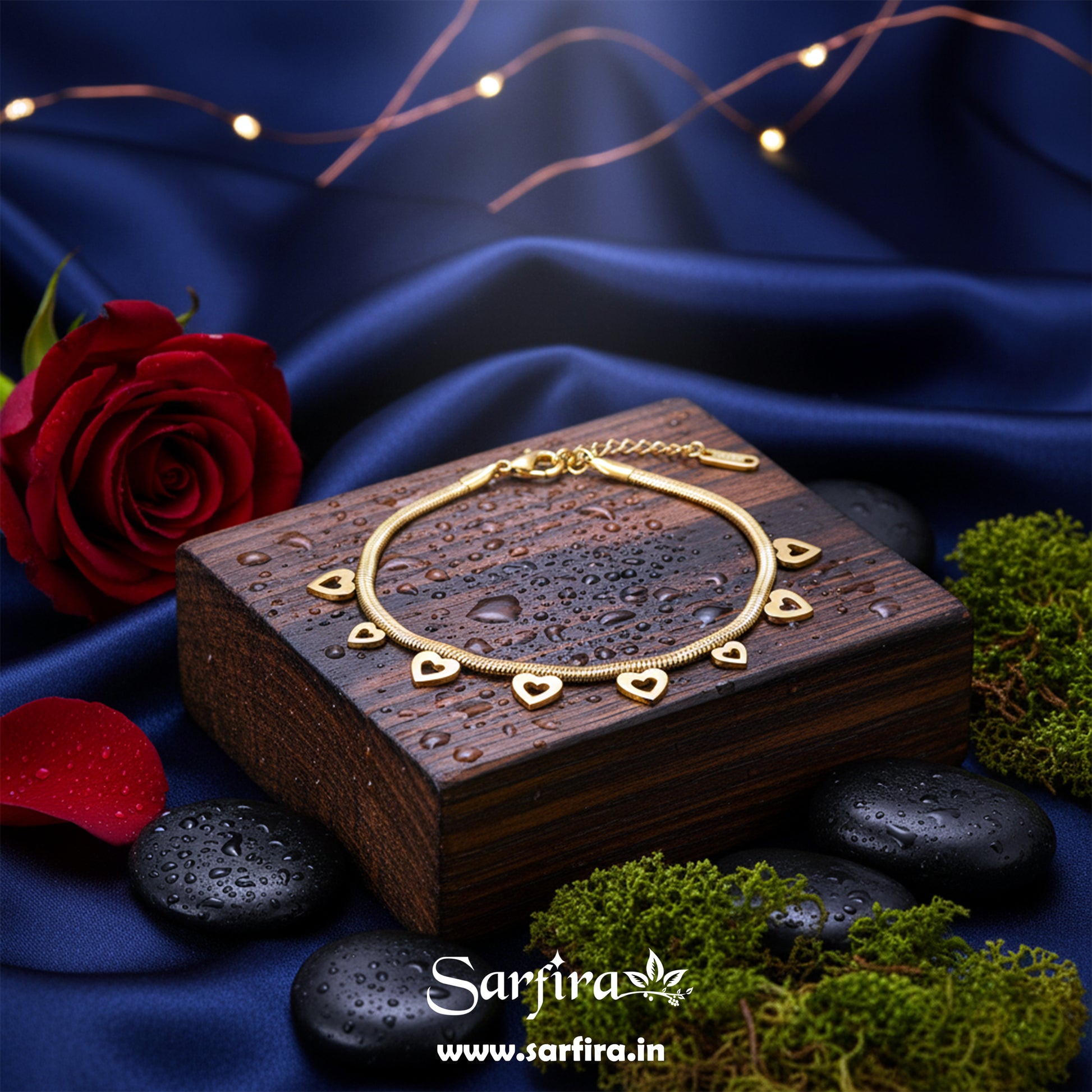 The smooth, flat profile of the snake chain provides a modern base, contrasting with the dangling, romantic heart charms. Wear it as a comfortable, everyday wrist accent. The design is suitable for layering with other simple chains or bangles, or can be worn alone to highlight the movement of the open hearts.