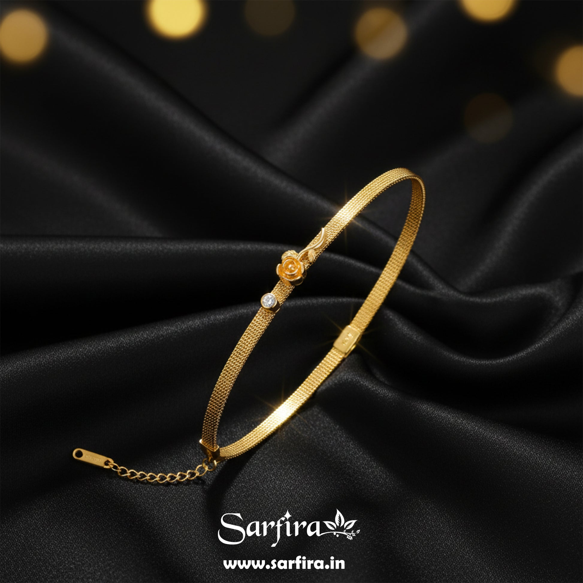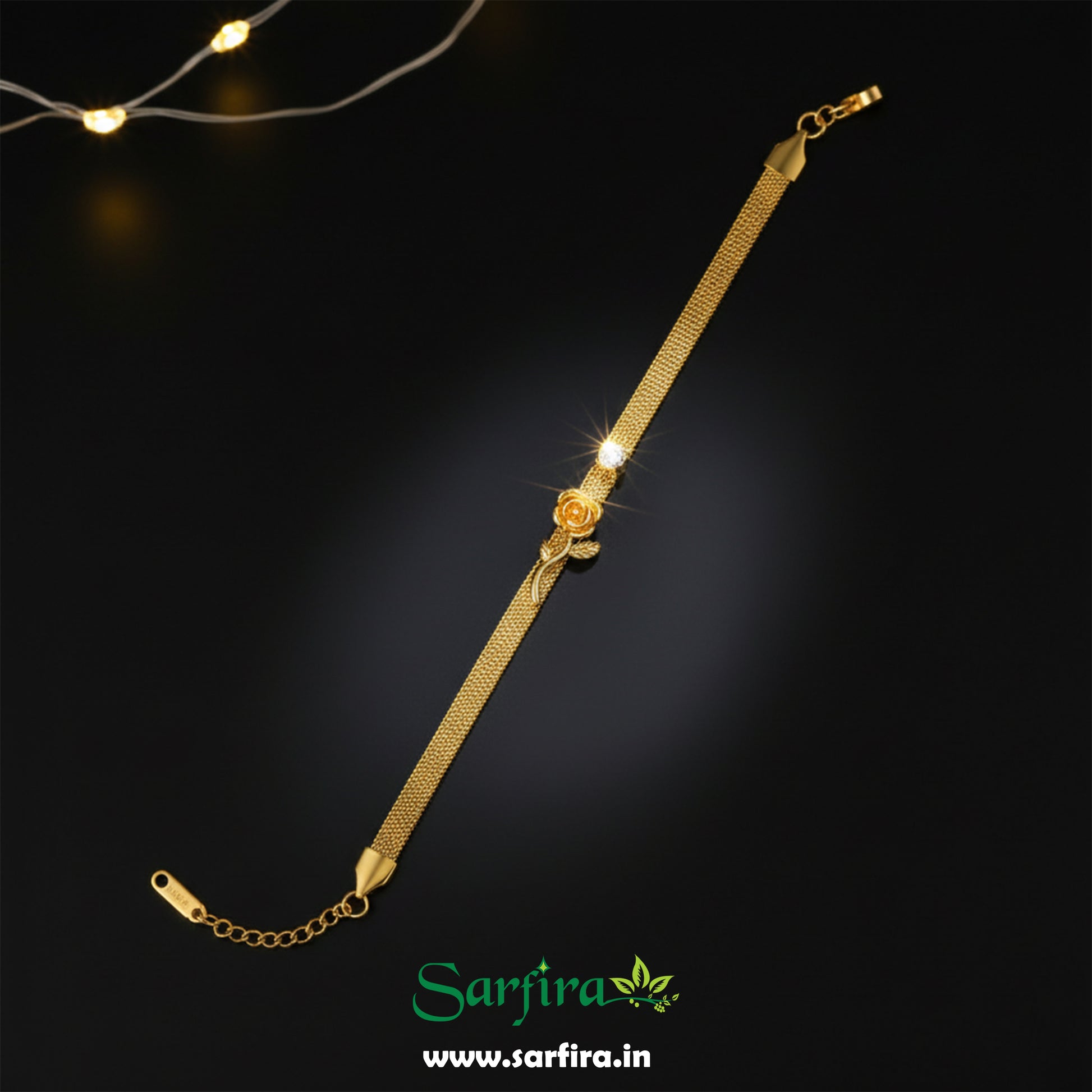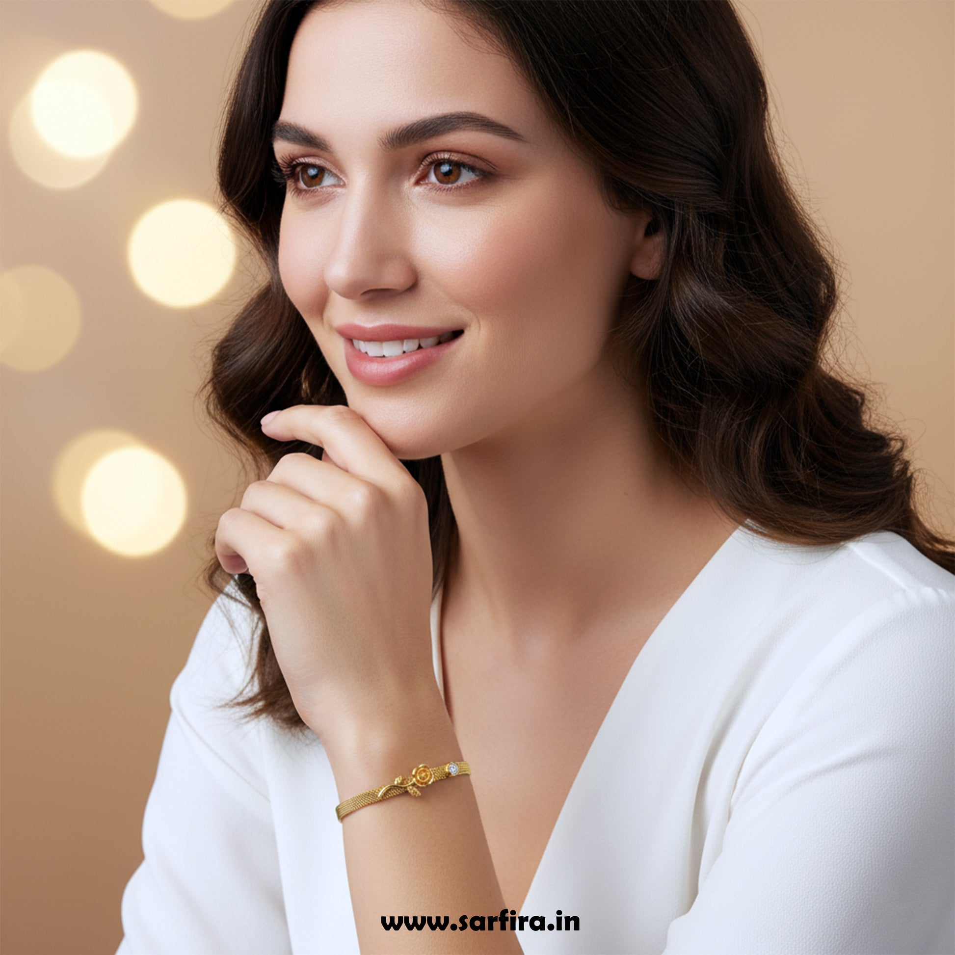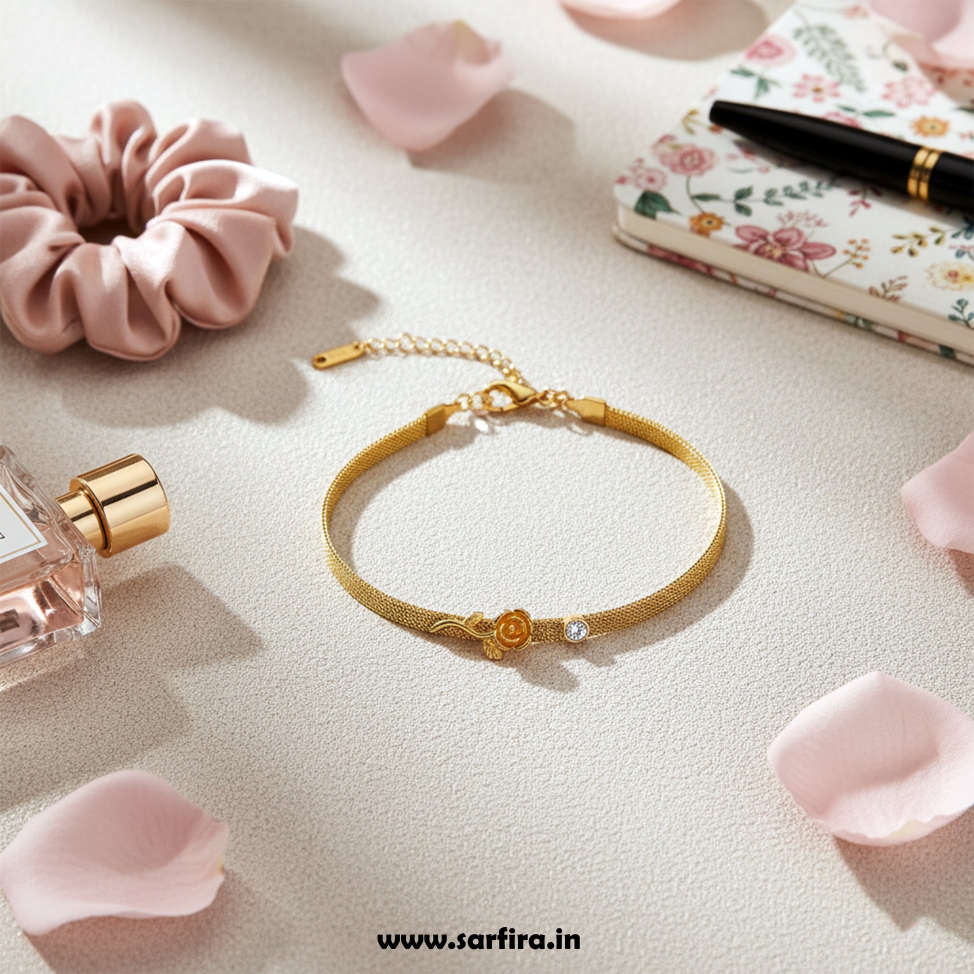 The unique texture of the mesh chain provides a sophisticated base. The floral accent and single stone make this bracelet suitable for both casual and semi-formal attire. It can be worn alone to highlight the texture, or paired with smooth, polished bangles for textural contrast.