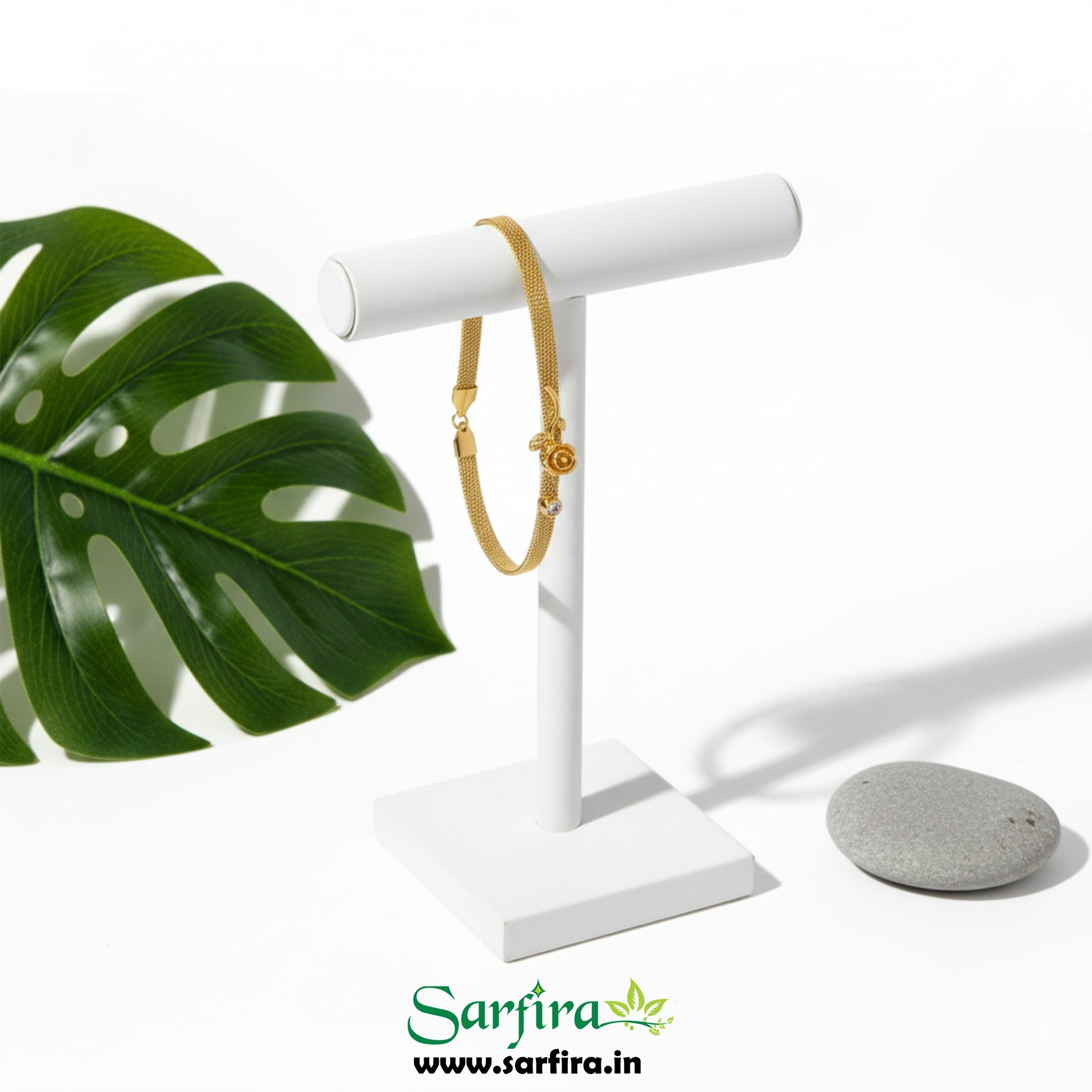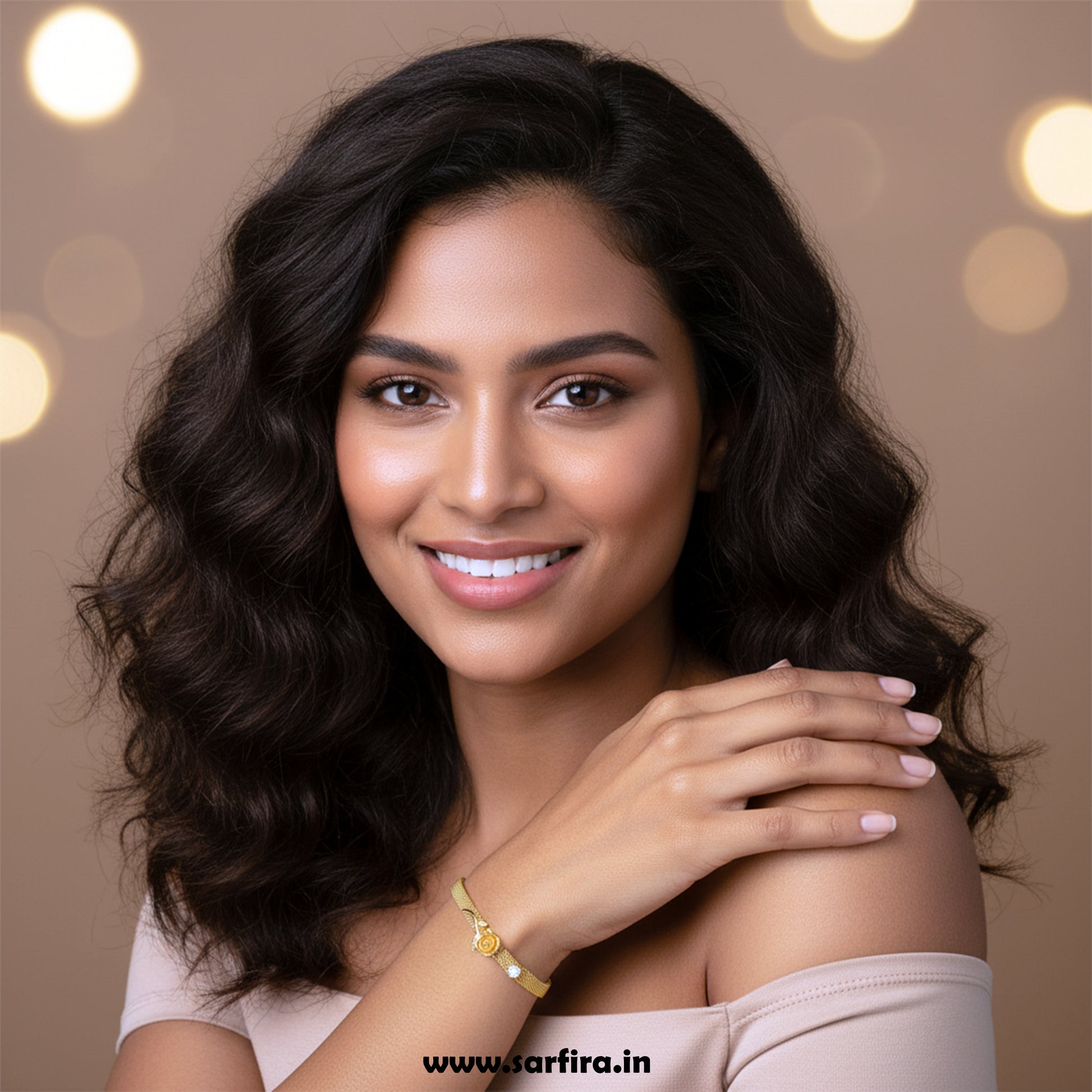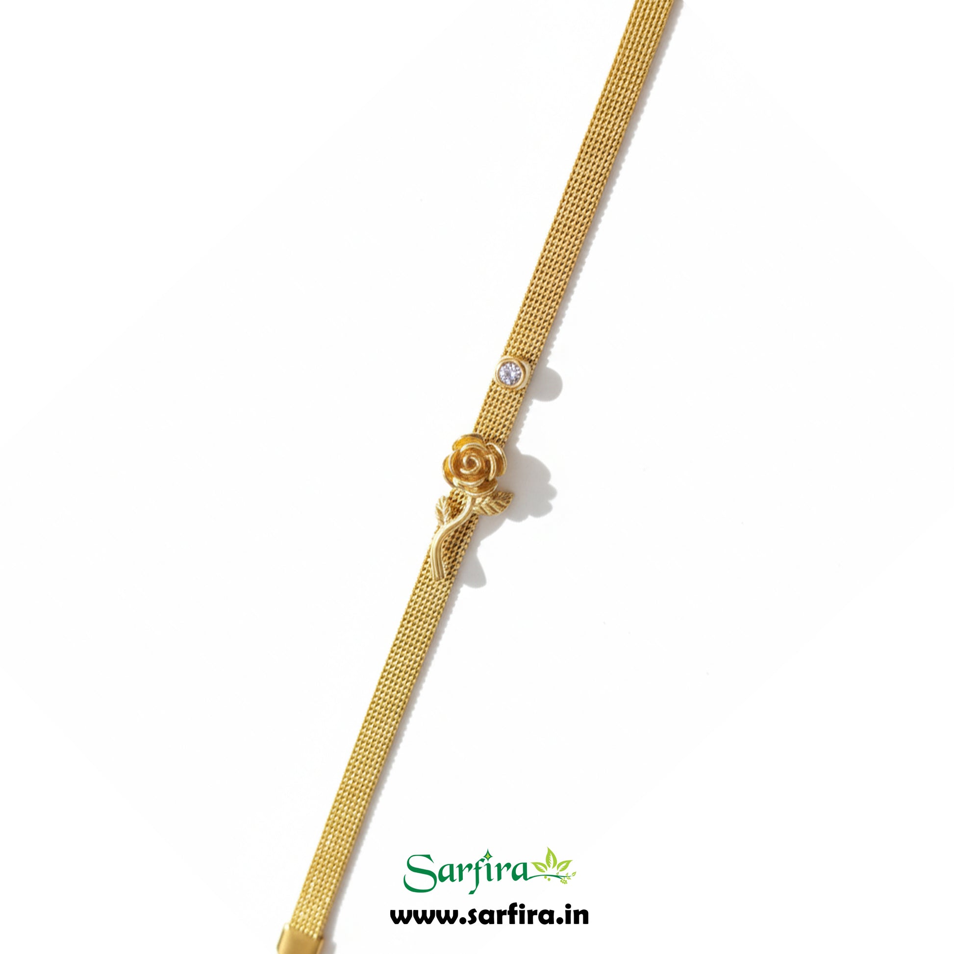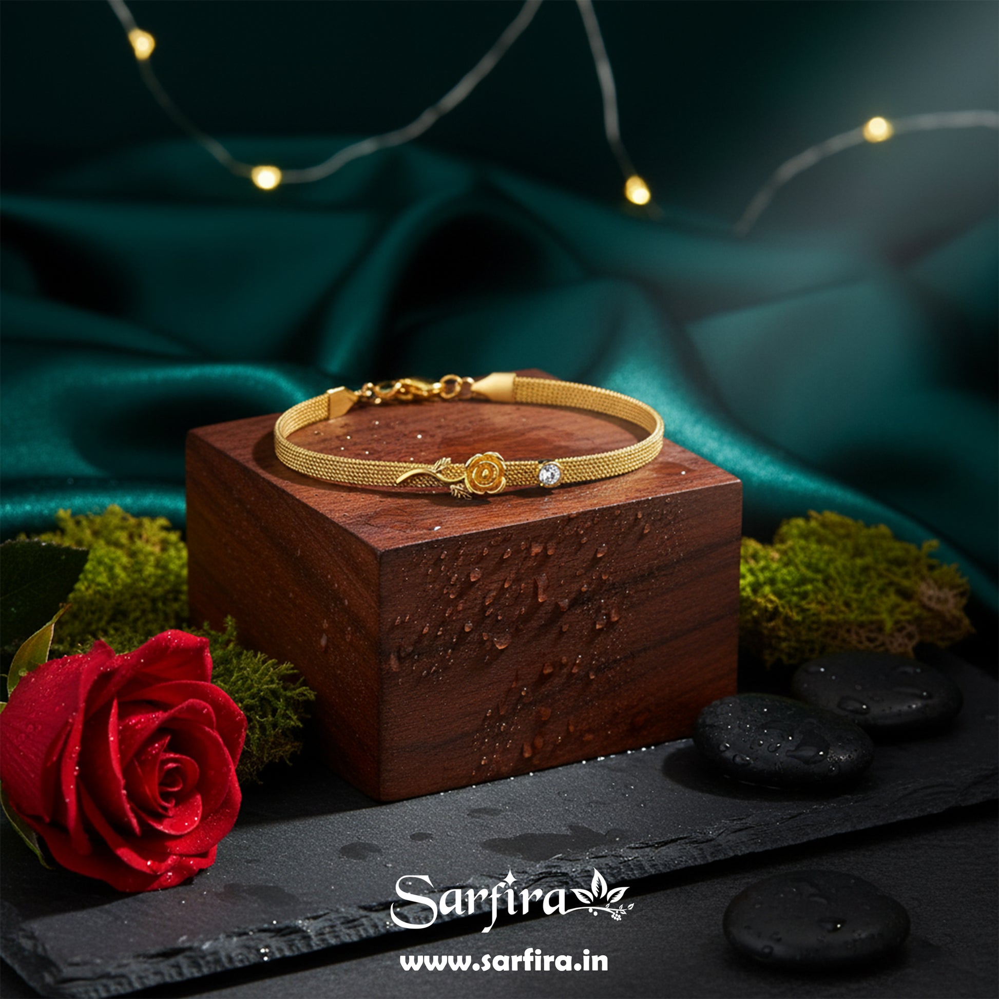 The unique texture of the mesh chain provides a sophisticated base. The floral accent and single stone make this bracelet suitable for both casual and semi-formal attire. It can be worn alone to highlight the texture, or paired with smooth, polished bangles for textural contrast.