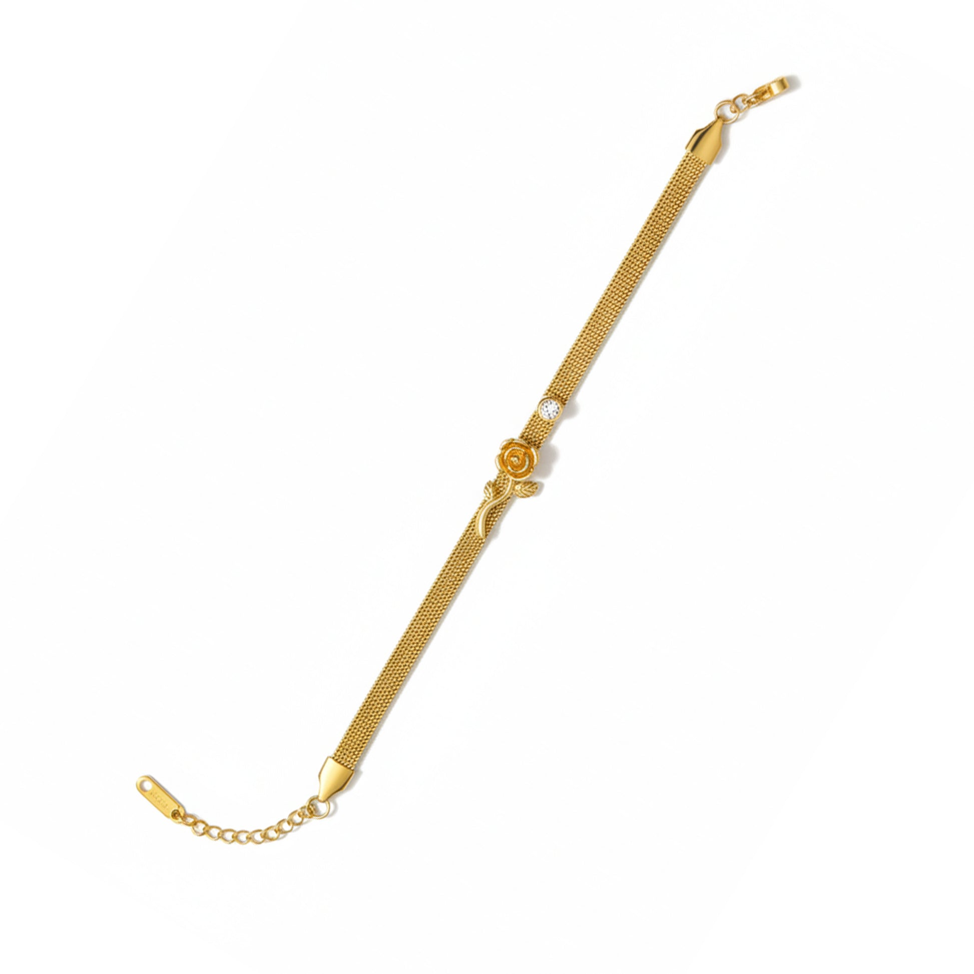 This is a bracelet featuring a flexible mesh chain design. The mesh band is accented by two fixed elements: a sculpted rose charm with a leaf and stem detail, and a single, round-cut clear cubic zirconia (CZ) stone set in a bezel. The rose charm has a detailed, textured finish.