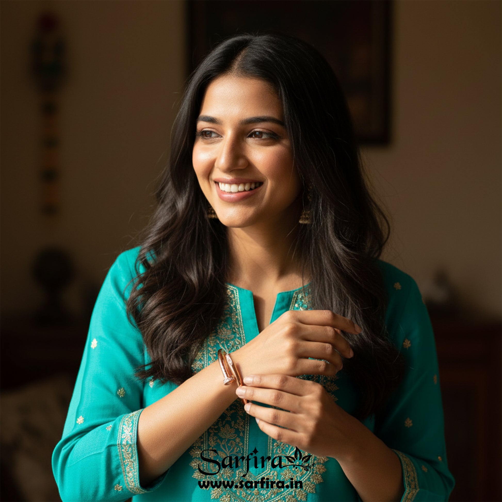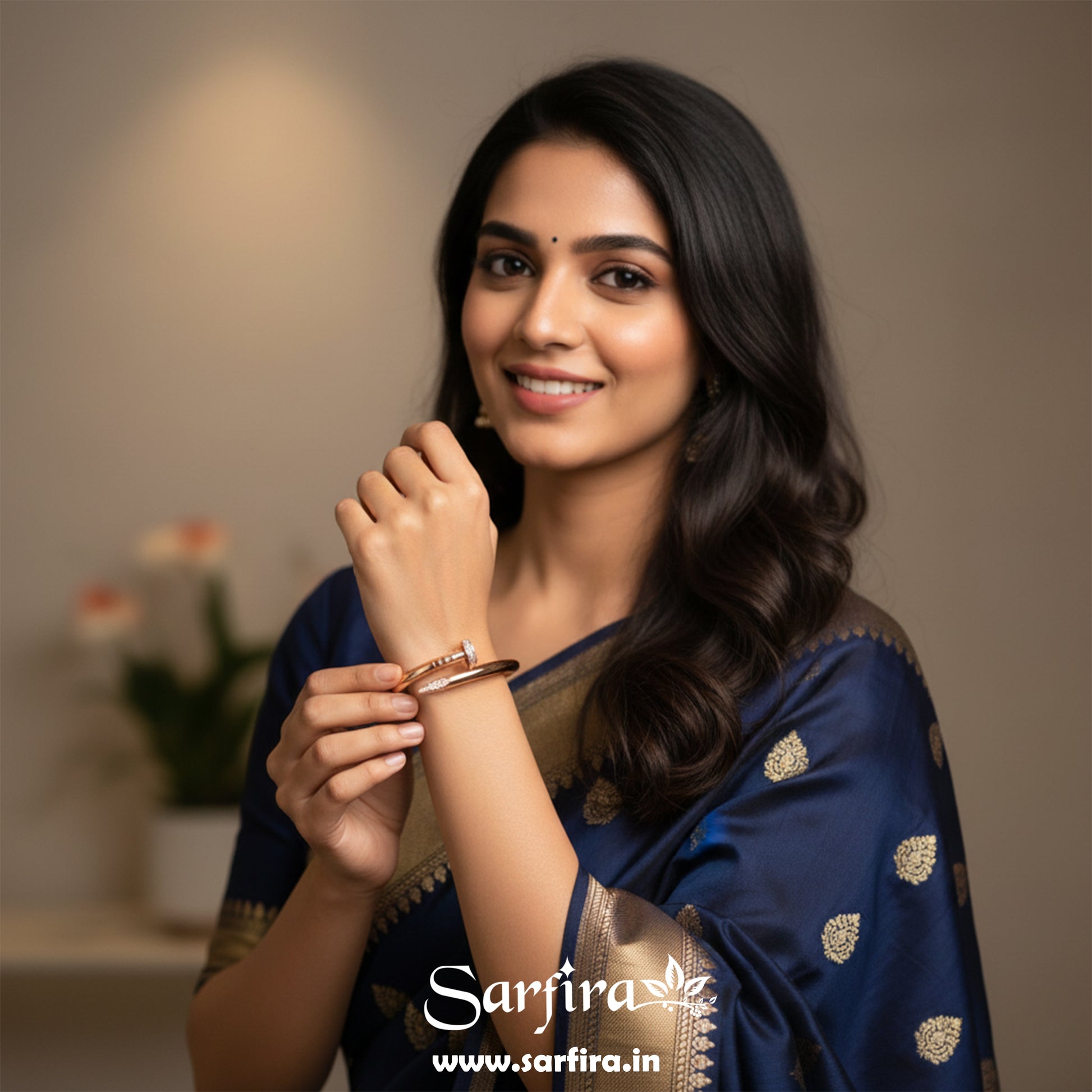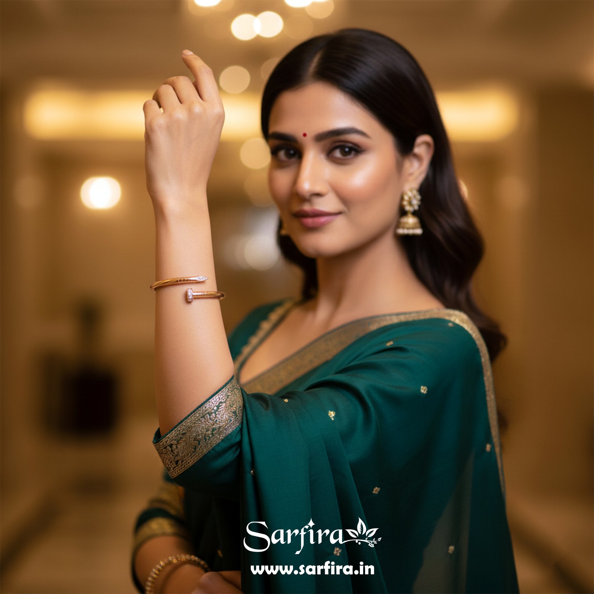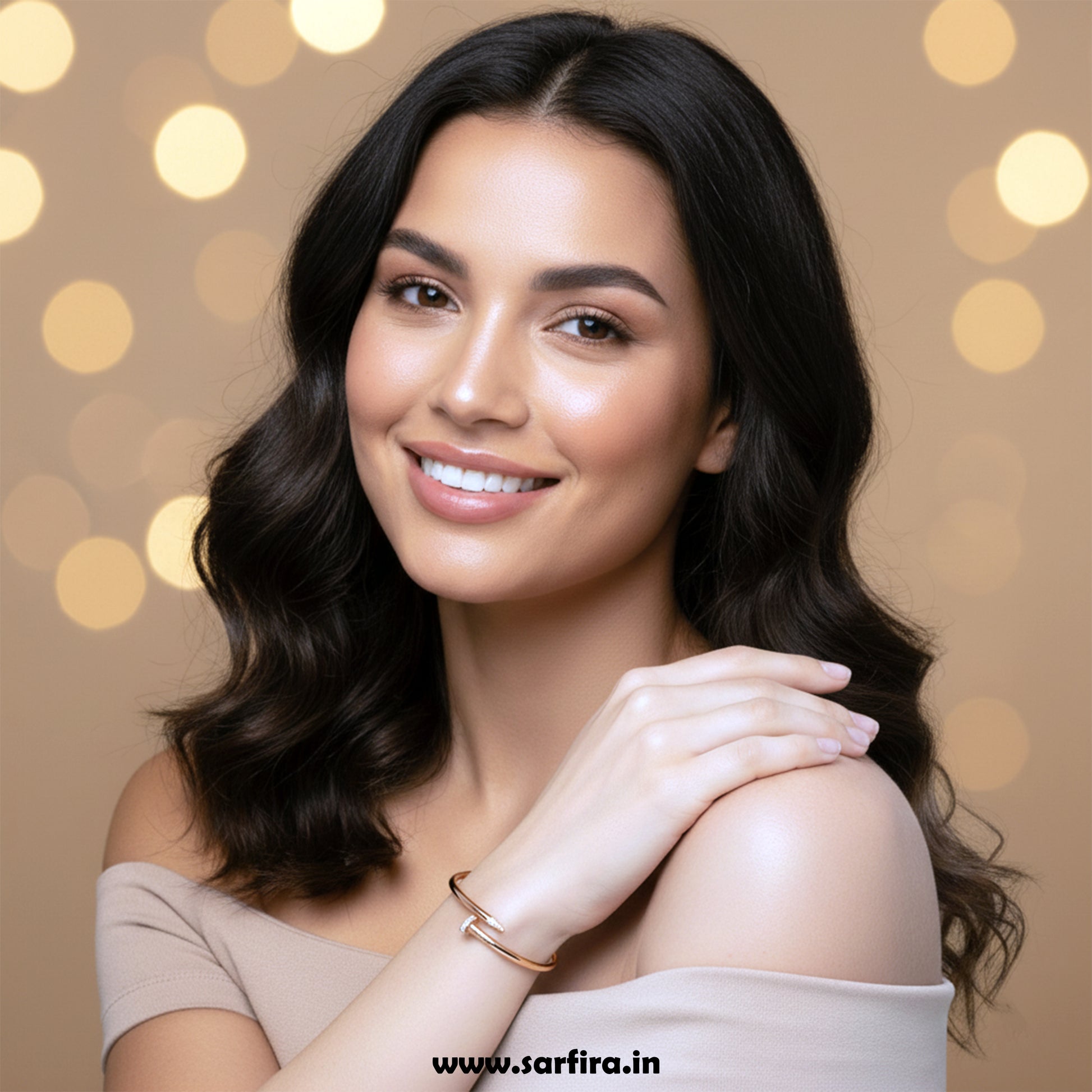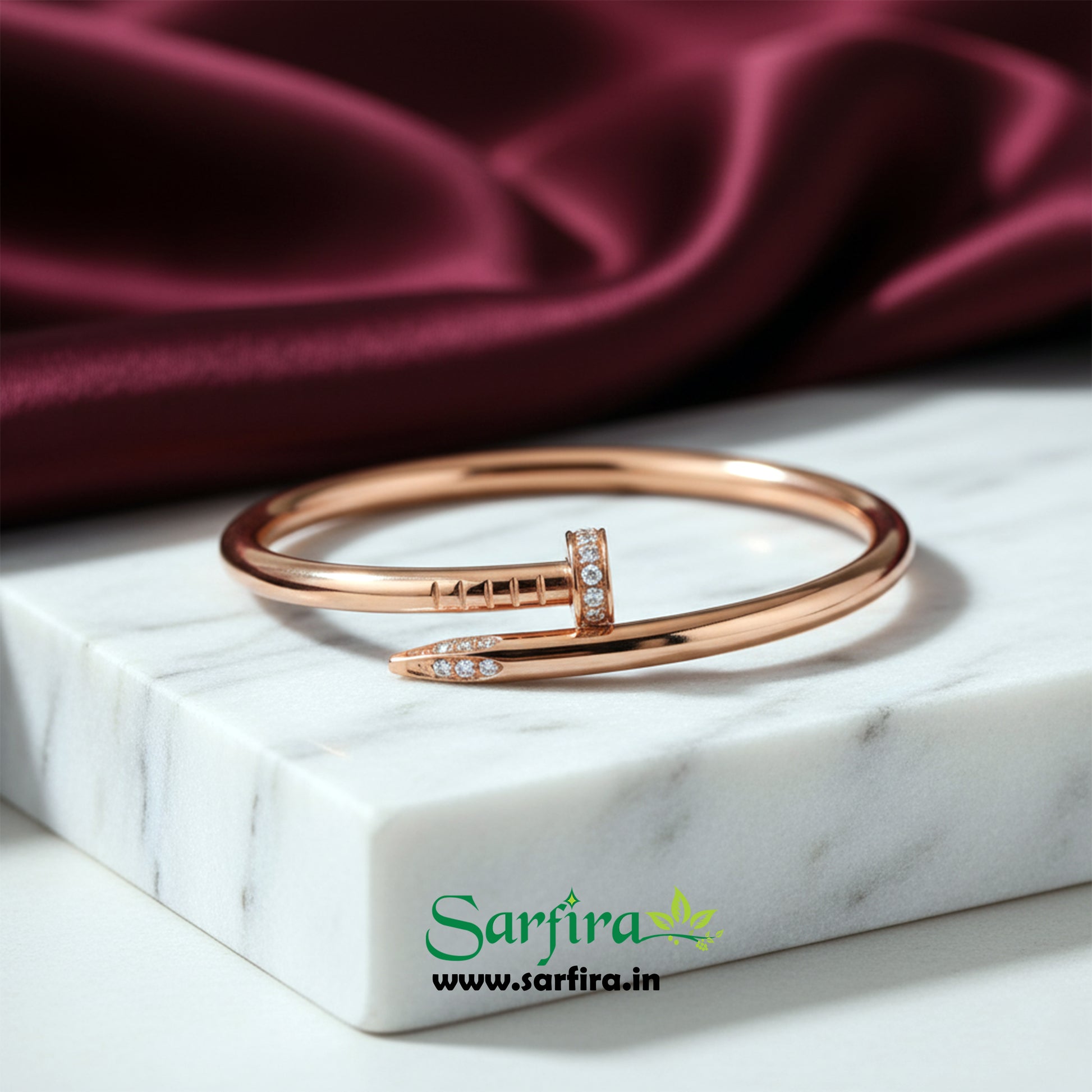 The bangle's unique shape makes it a highly noticeable accessory. Wear it alone to highlight the artistic nail design and the subtle sparkle from the CZ stones. The warm rose gold color pairs well with other pink-toned metals or can be mixed with plain gold or silver jewelry.