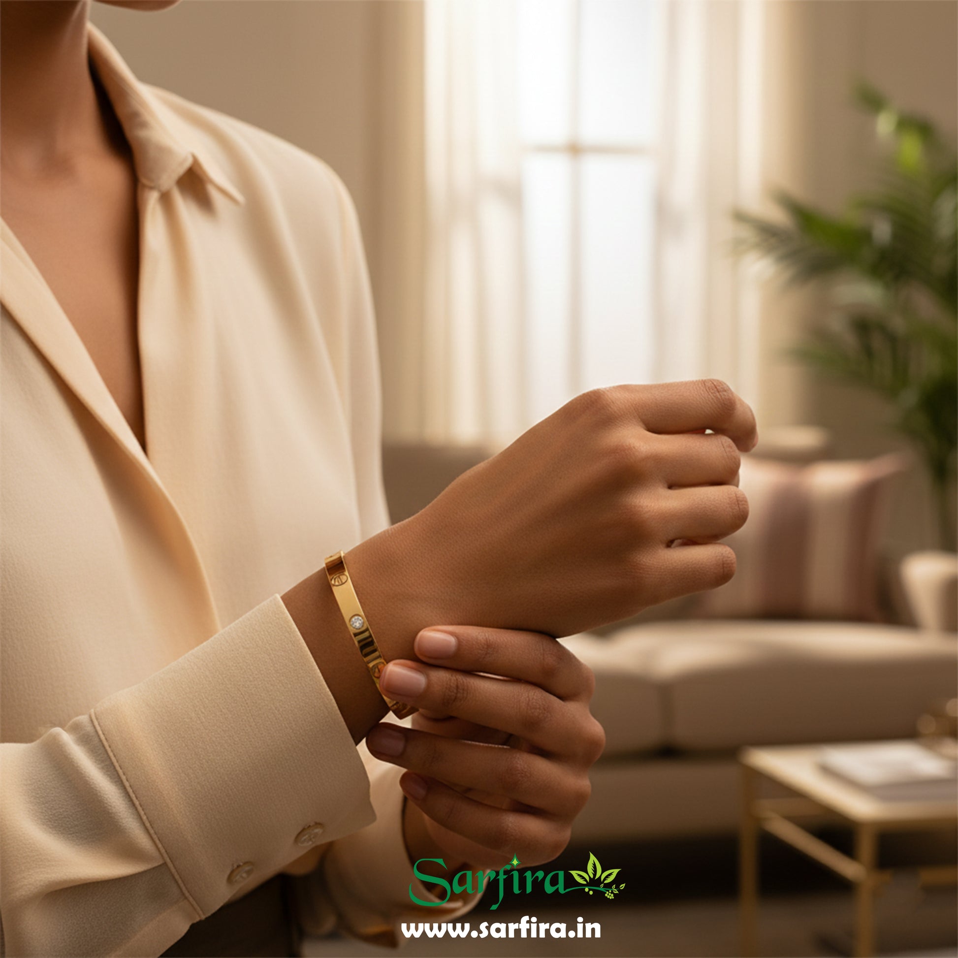 The item is made from stainless steel, a strong material known for being anti-tarnish. It has a quality finish of Gold Plating, making it safe for water and suitable for frequent wear. It has a hinge or lock to close it safely on your wrist.