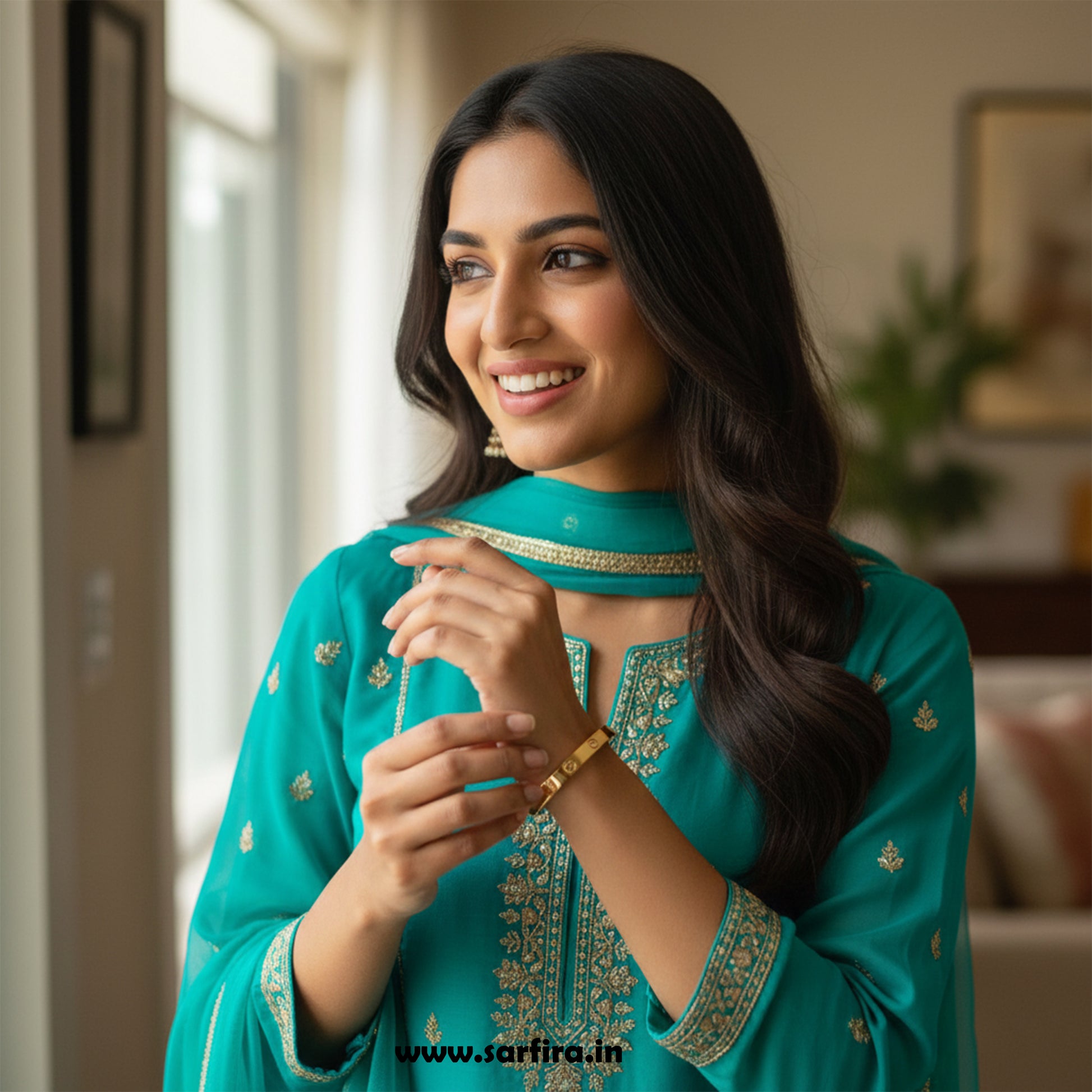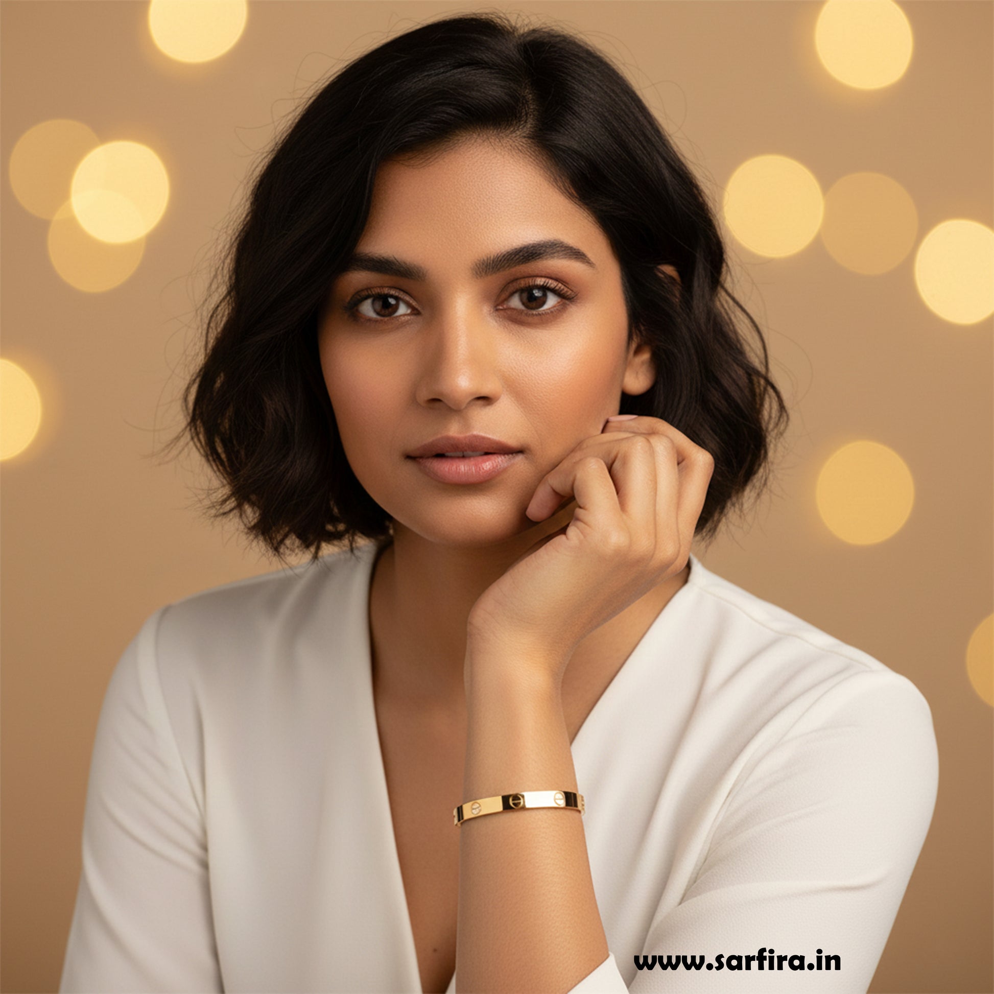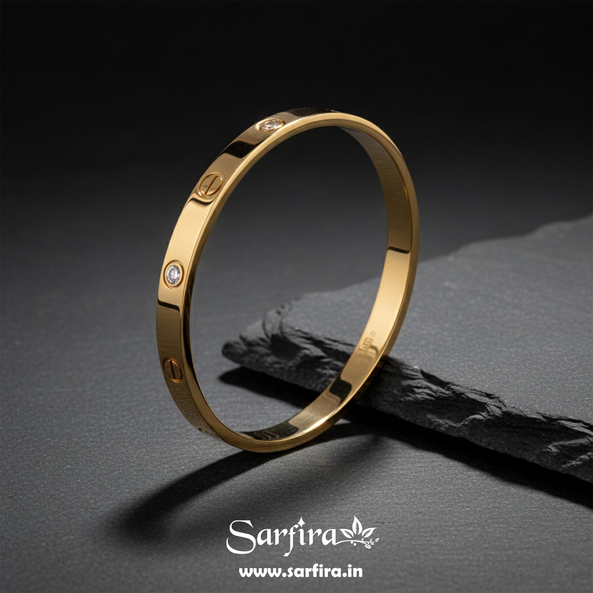 The bangle's clean, modern design makes it excellent for stacking with other smooth bangles or watches. Wear it alone to highlight the unique screw and stone details. This Kada is good for everyday wear and adds a structured, minimalist accent.