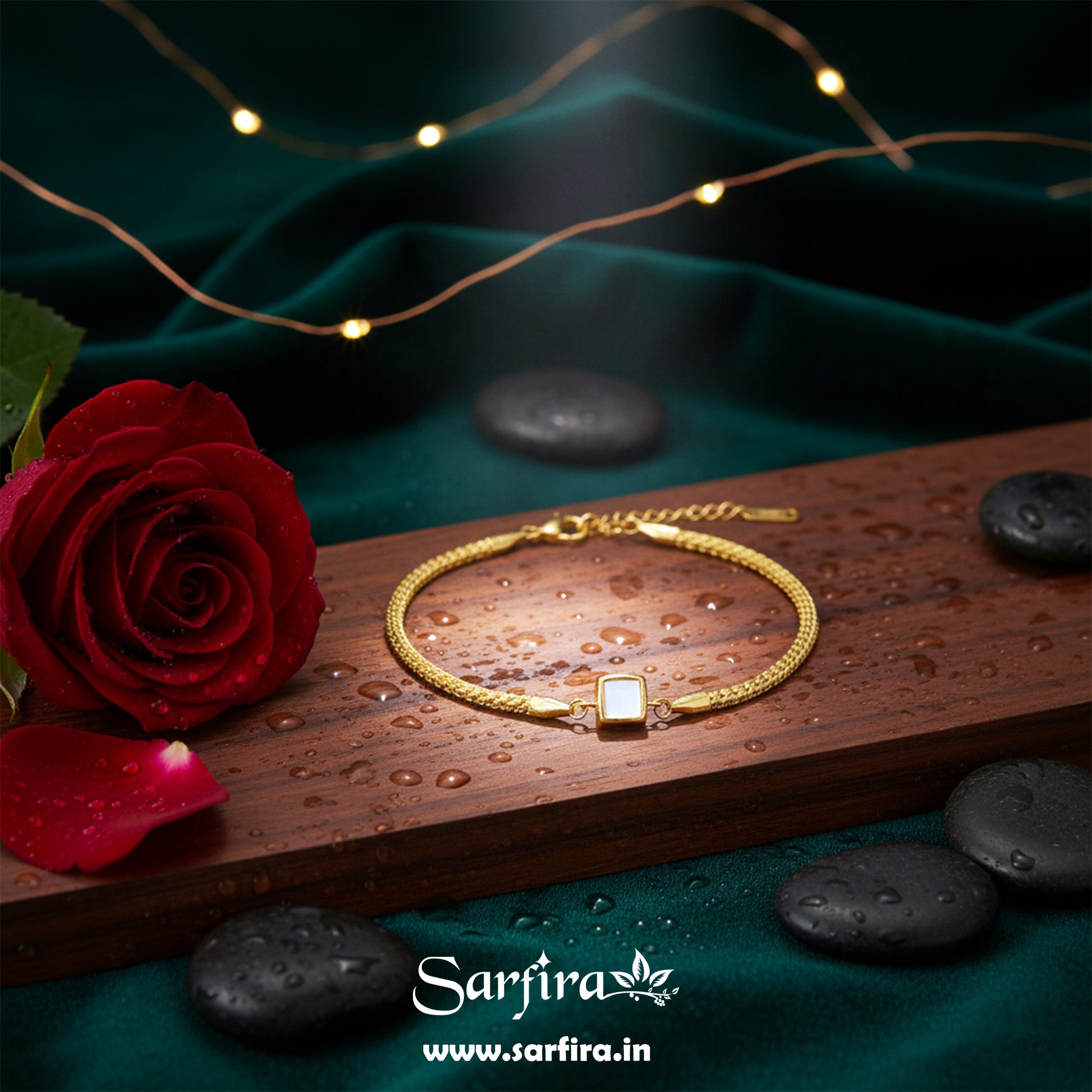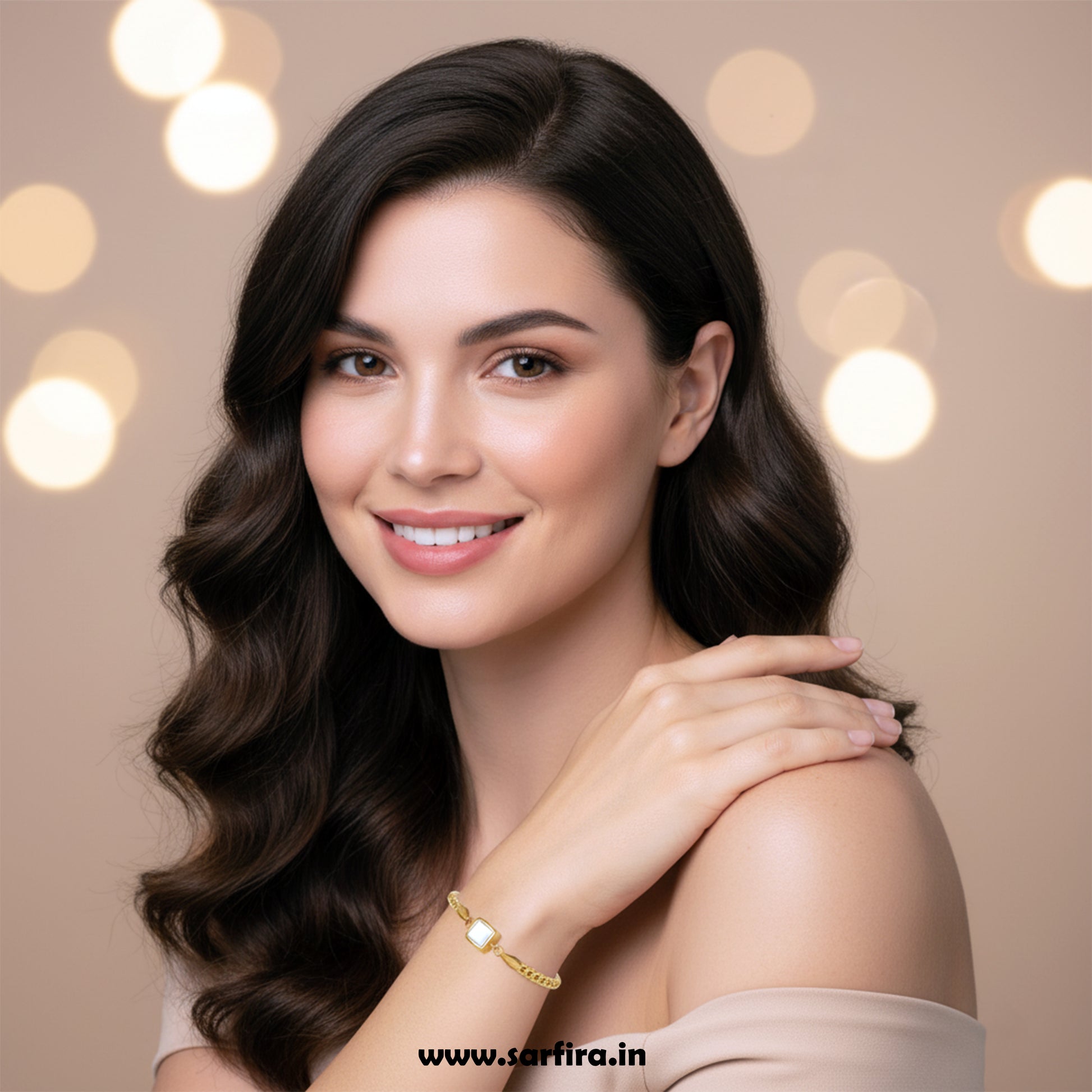 The bracelet's thick, textured chain makes this a prominent wrist piece. Wear it solo to highlight the chain's pattern and the contrast of the white MOP square. The geometric charm shape provides a modern, clean look that pairs well with structured outfits.