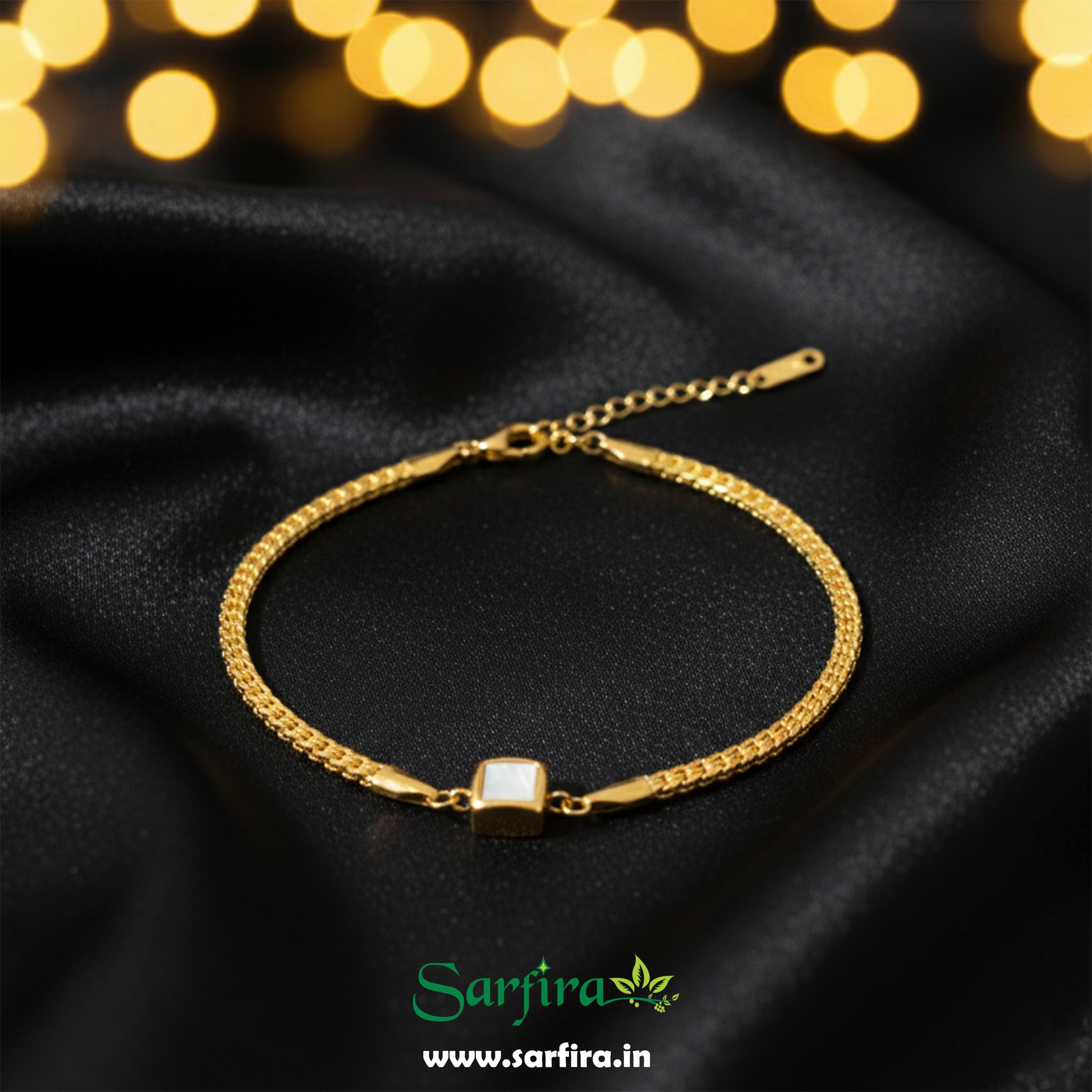 The item is constructed entirely from stainless steel with a gold-plated finish. This fabrication results in anti-tarnish and water-resistant properties, making the bracelet suitable for consistent, daily wear. It includes an extension chain for adjustable sizing.