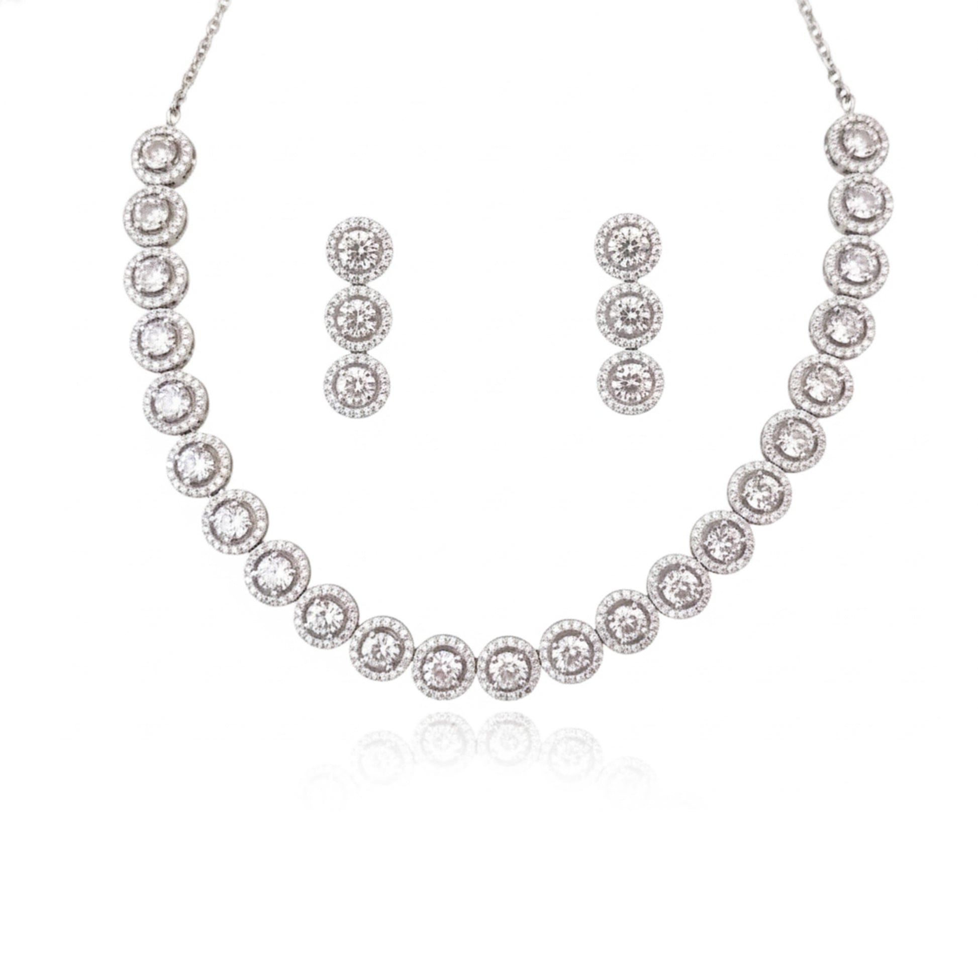 This is a matching jewellery set that includes one choker necklace and a pair of stud earrings. The entire set is decorated with bright, clear American Diamond (CZ) stones. The necklace is made of many linked round motifs, each one having a halo of smaller AD stones around a central stone. The earrings feature three matching linked round motifs. This design sits close to the neck like a choker.