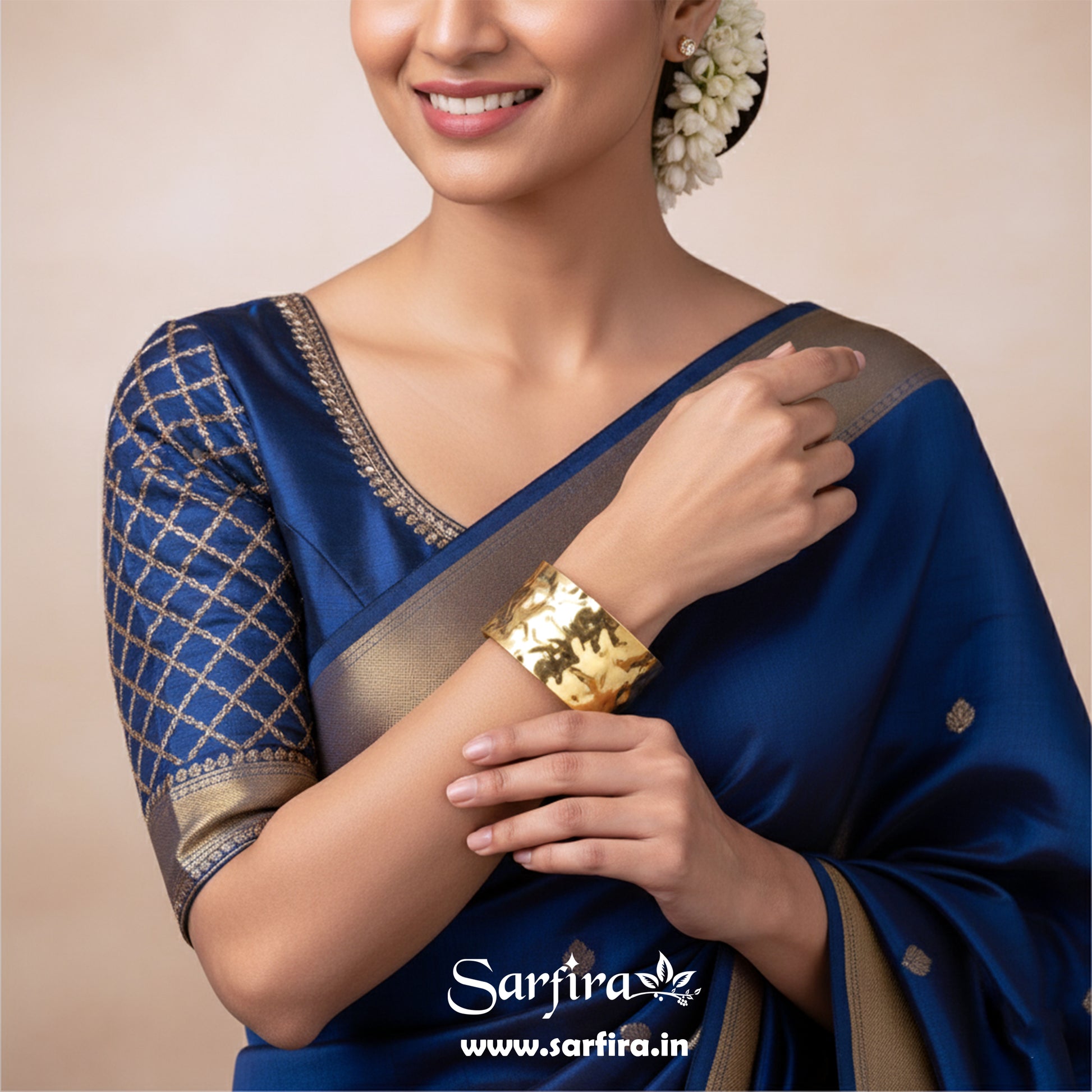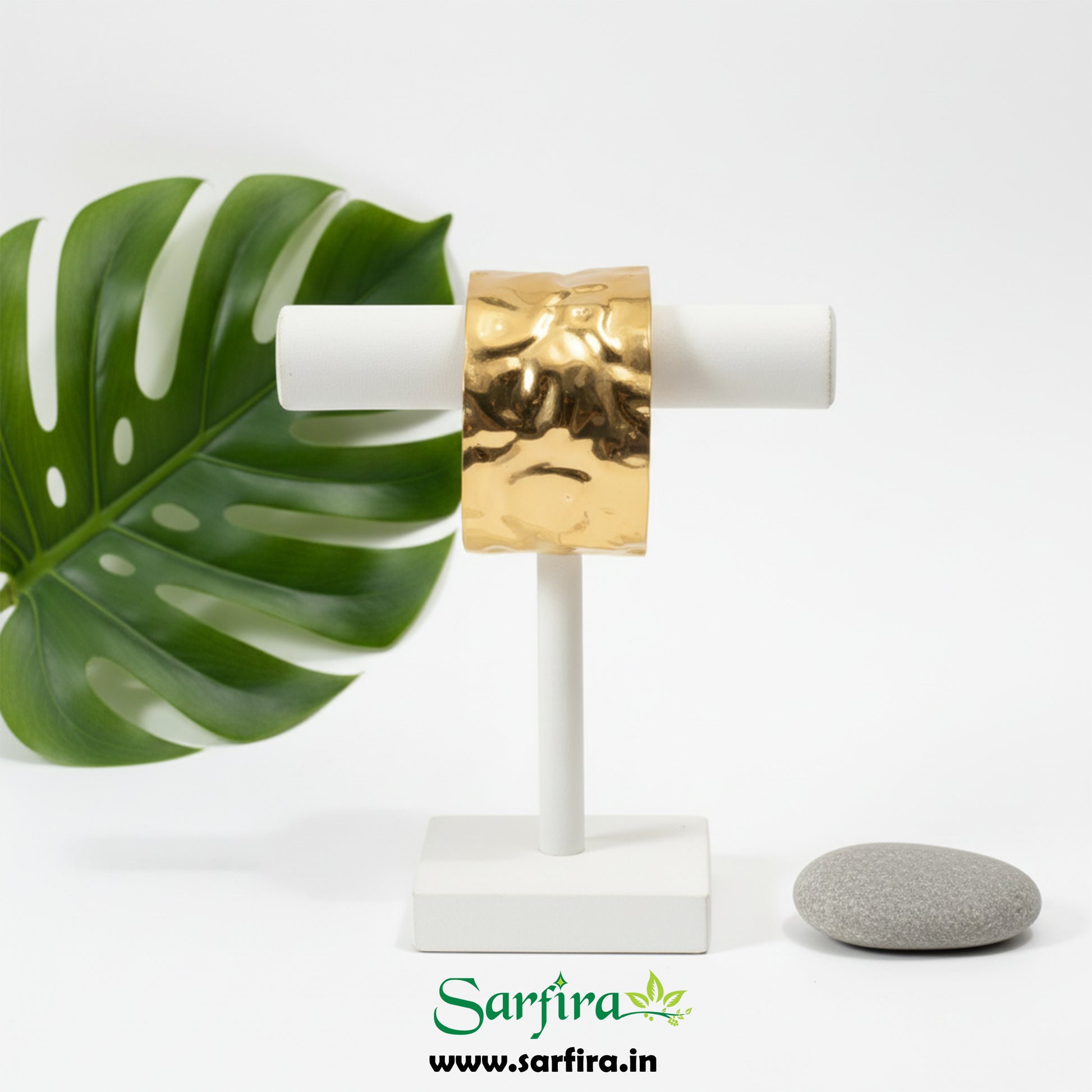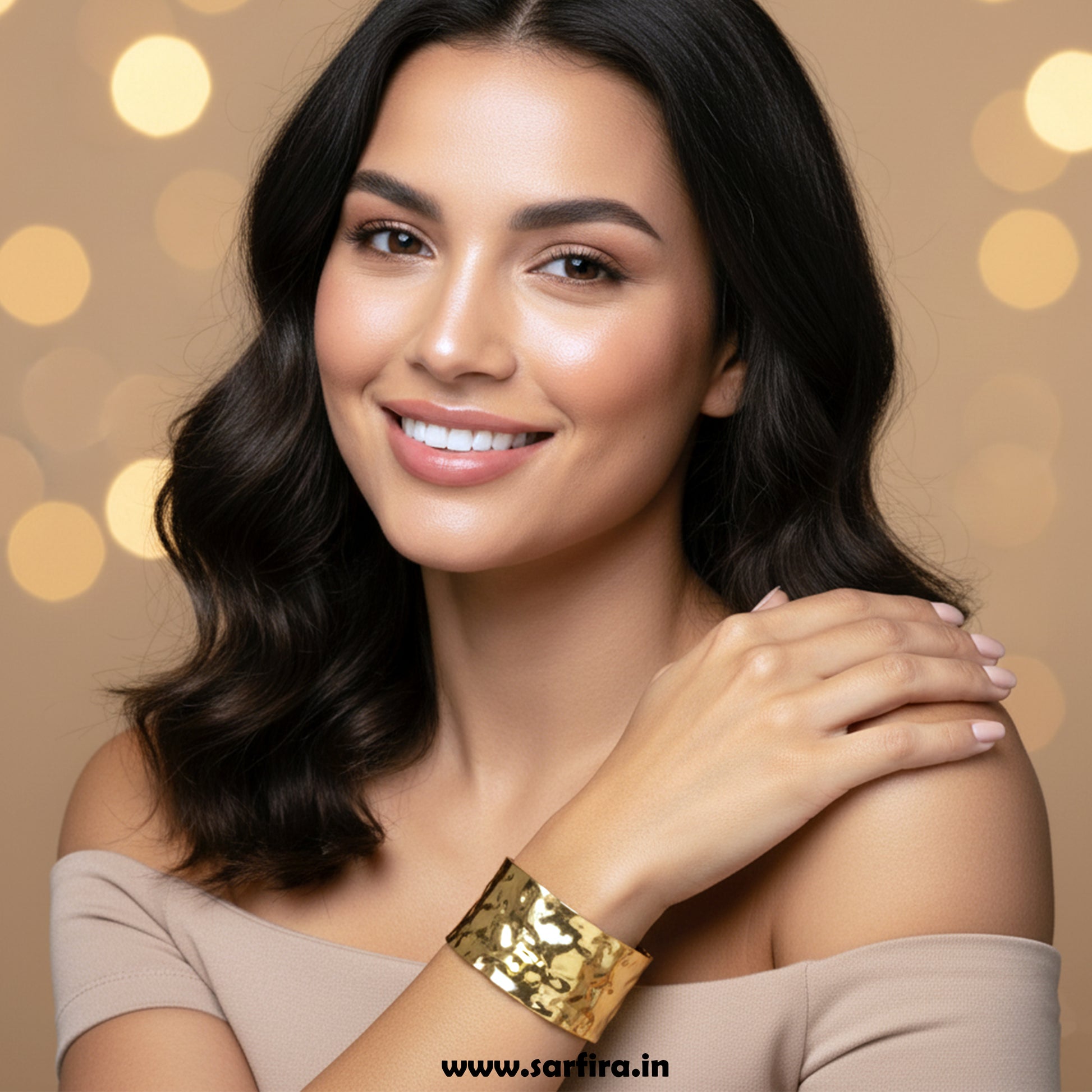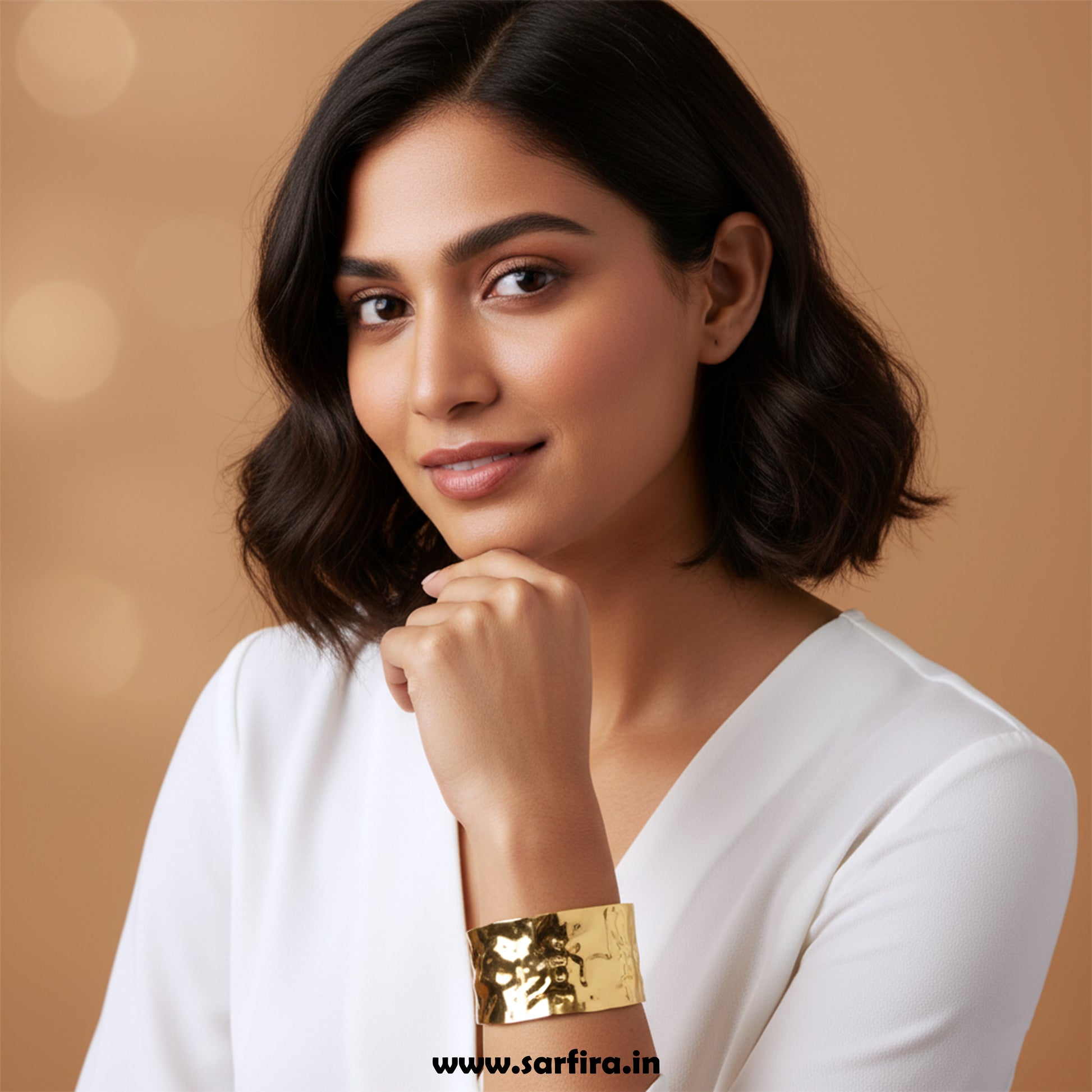 The bracelet's significant size and unique hammered texture make it a bold, standalone statement piece. Wear it over the sleeve of a fitted top or on a bare wrist for maximum visual impact. Its rich texture works well to accessorize simple, solid-colored outfits.